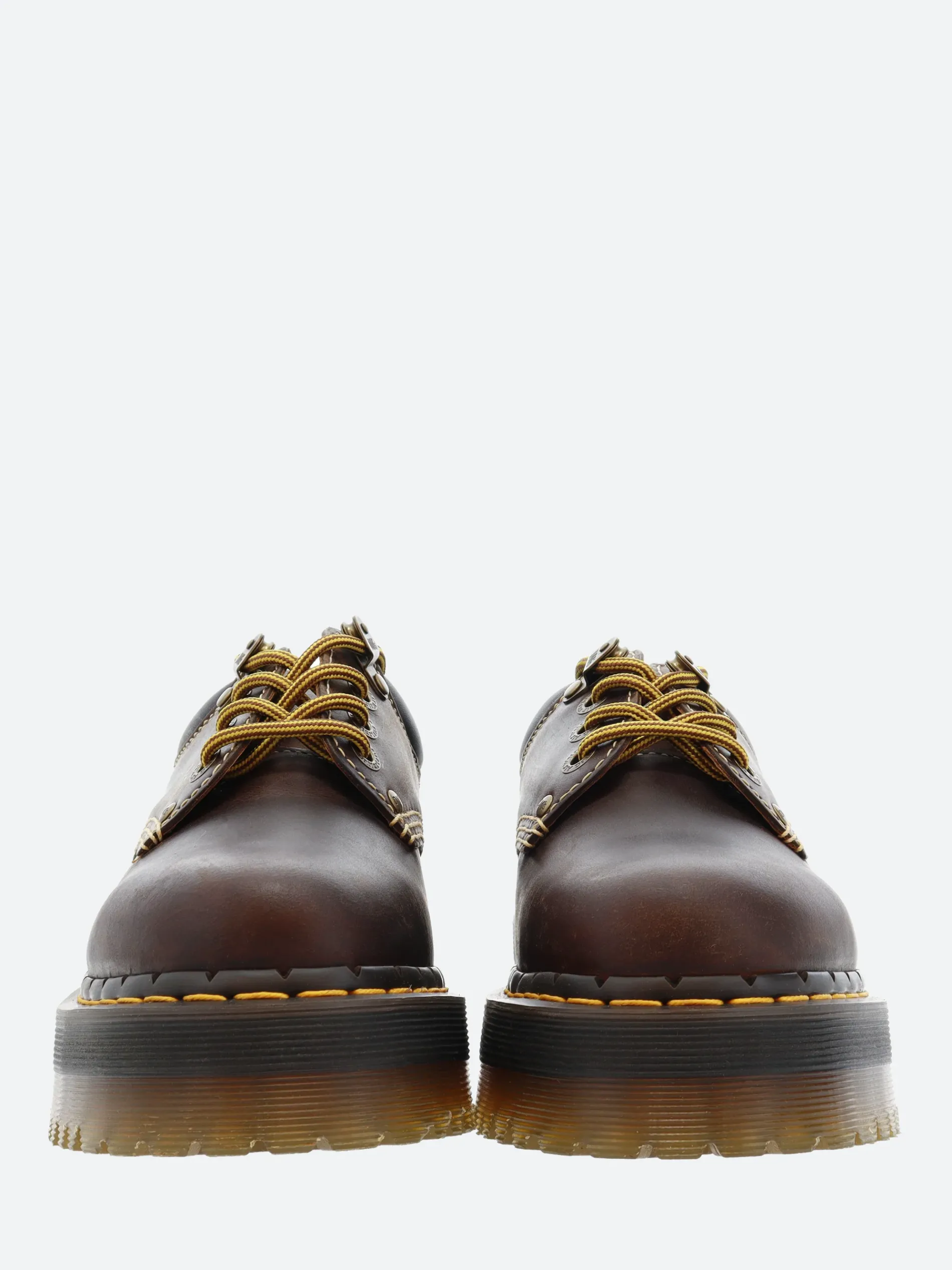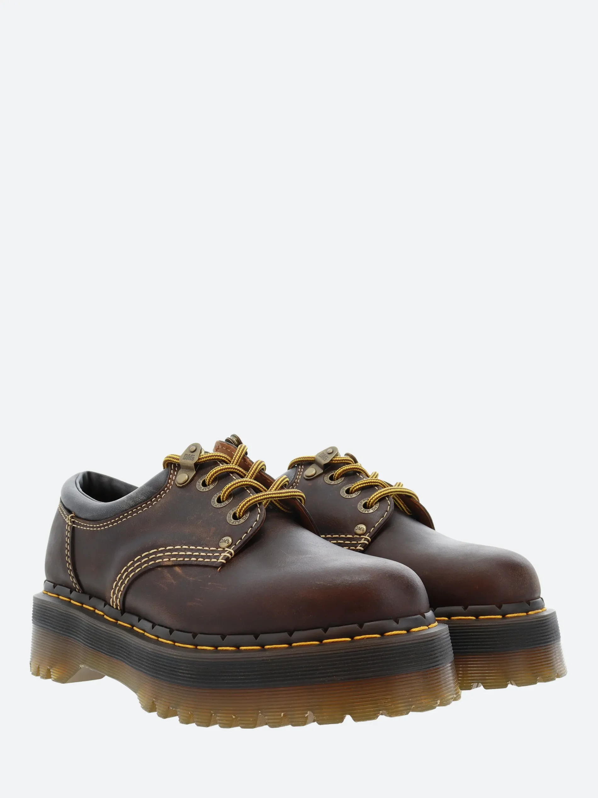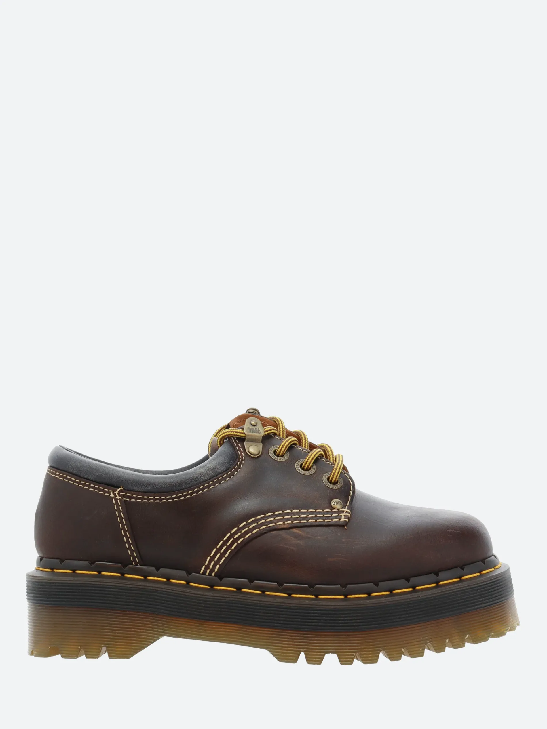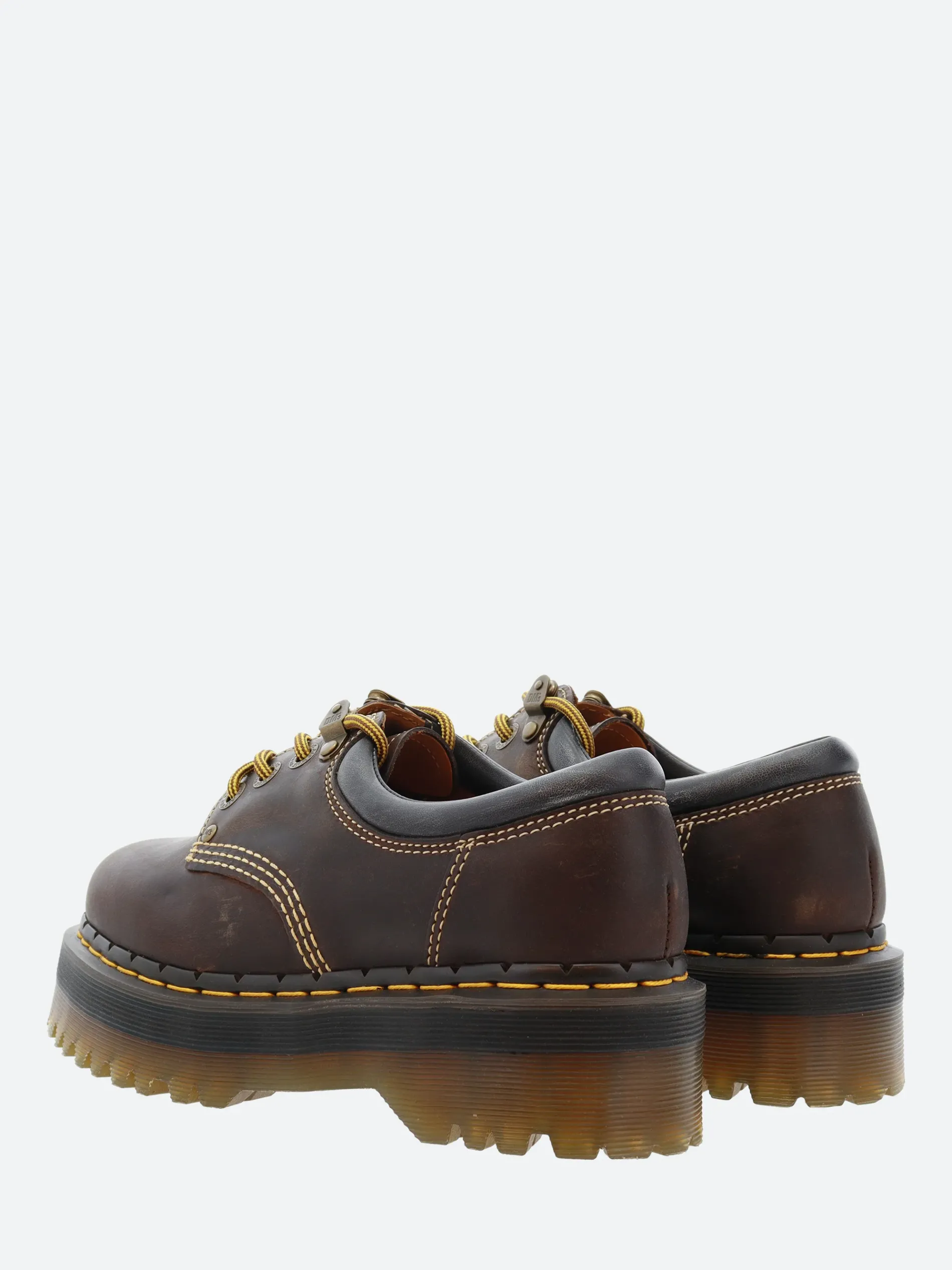 This archive-inspired rework of Dr. Martens’ 8053 shoe captures the spirit of long summer days. Built from rugged Crazy Horse leather designed to mark and change with every wear. The upper is detailed with contrast ecru stitching, antique brass eyelets, hiker laces and a brown and a padded ankle collar for added comfort. The formidable Quad sole is secured with a bitter choc notched welt and yellow welt stitching.