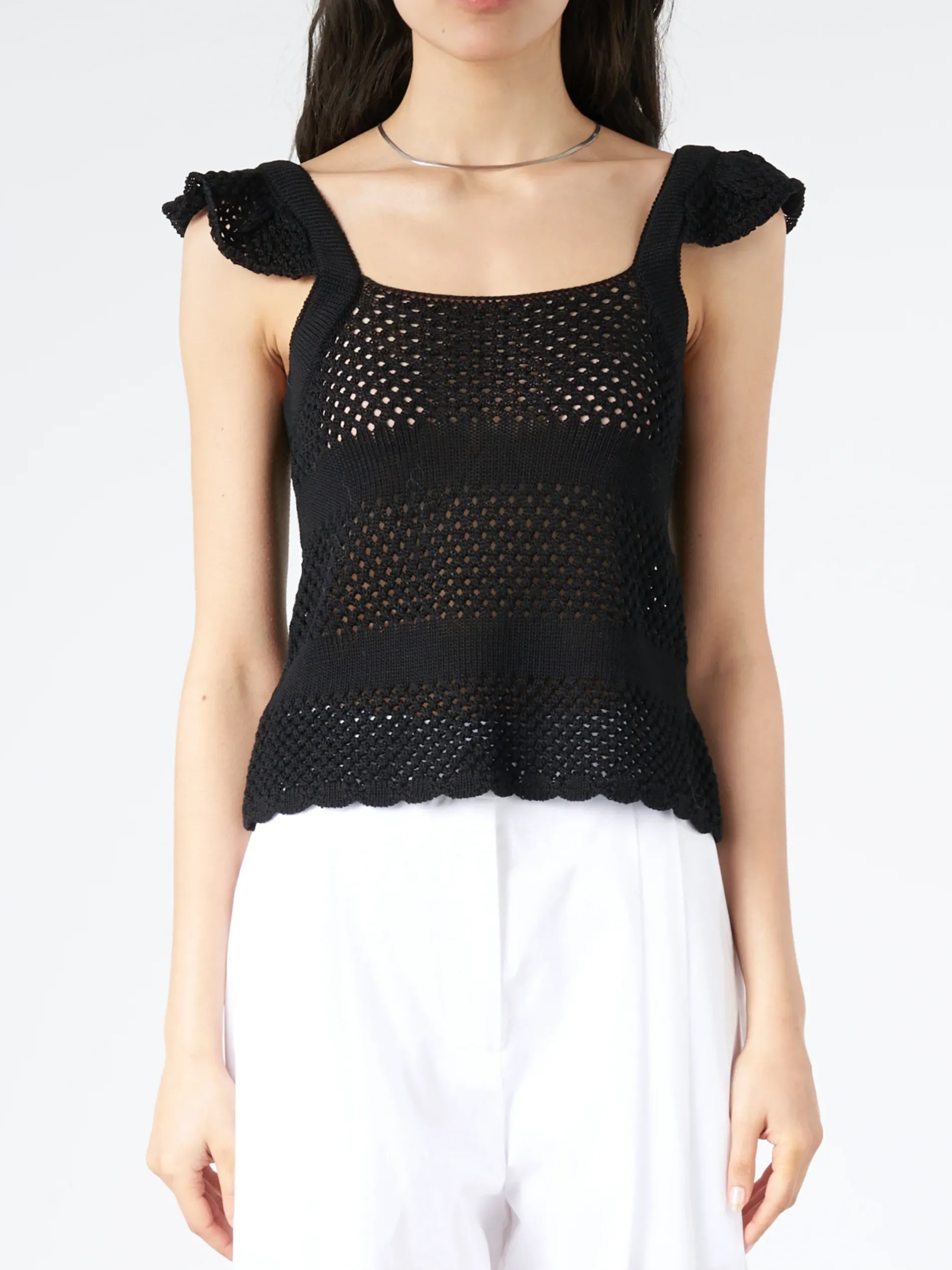 Made from a breathable, lightweight fabric, this top offers a subtle sheen and a gentle touch. The square collar and crocheted ruffle detailing on the shoulders give this top a feminine and stylish look.