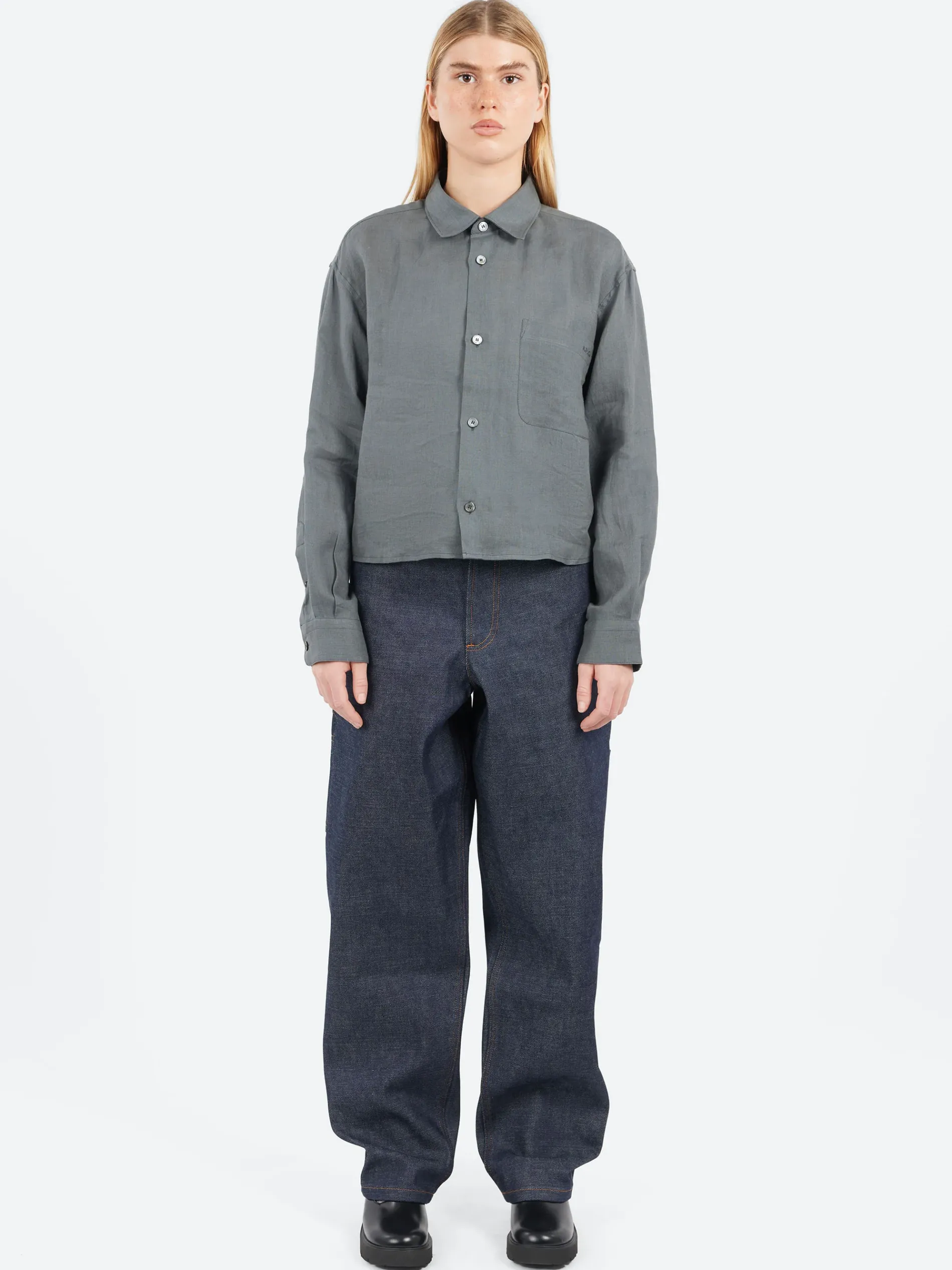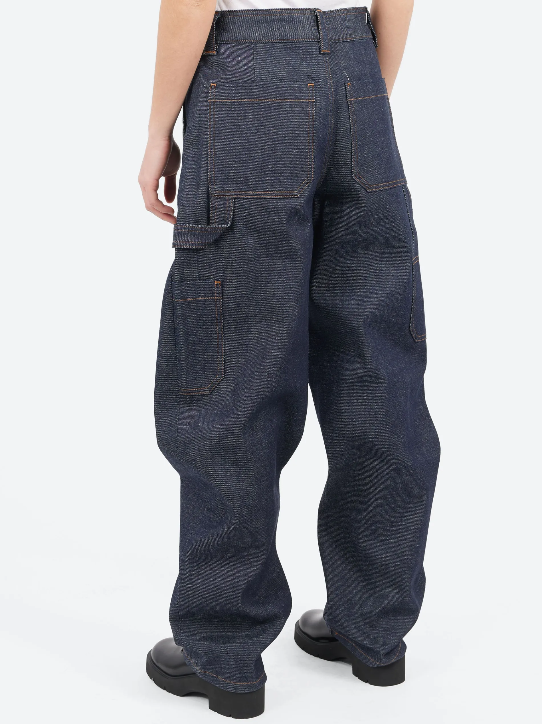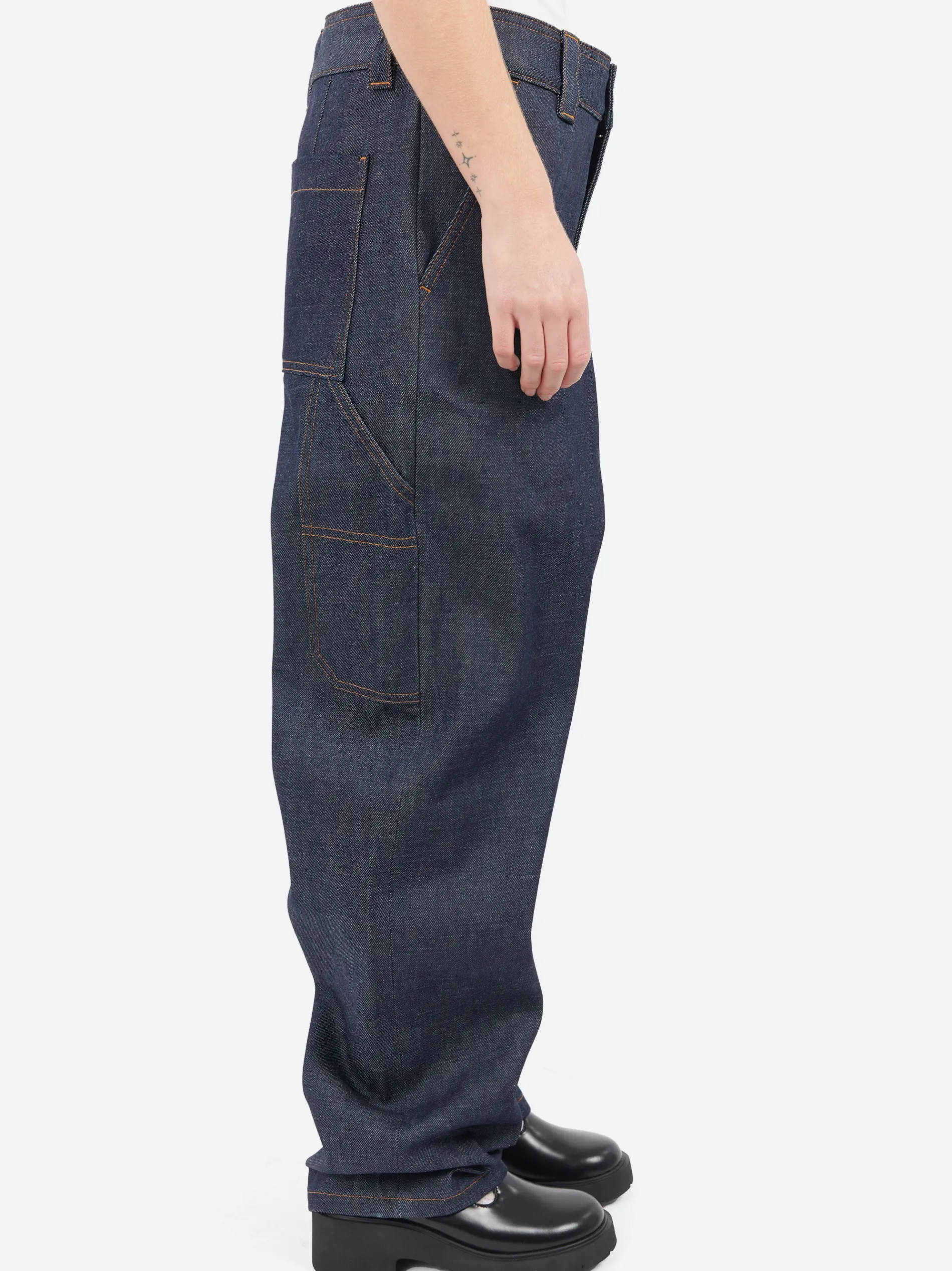 These wide-leg carpenter jeans are made from iconic A.P.C. Japanese denim, offering both style and durability. With a straight cut and loose fit, they provide a relaxed, comfortable silhouette that sits at a mid-rise. The design features multiple pockets for added functionality. A hammer pocket on the left leg adds to the workwear-inspired aesthetic.