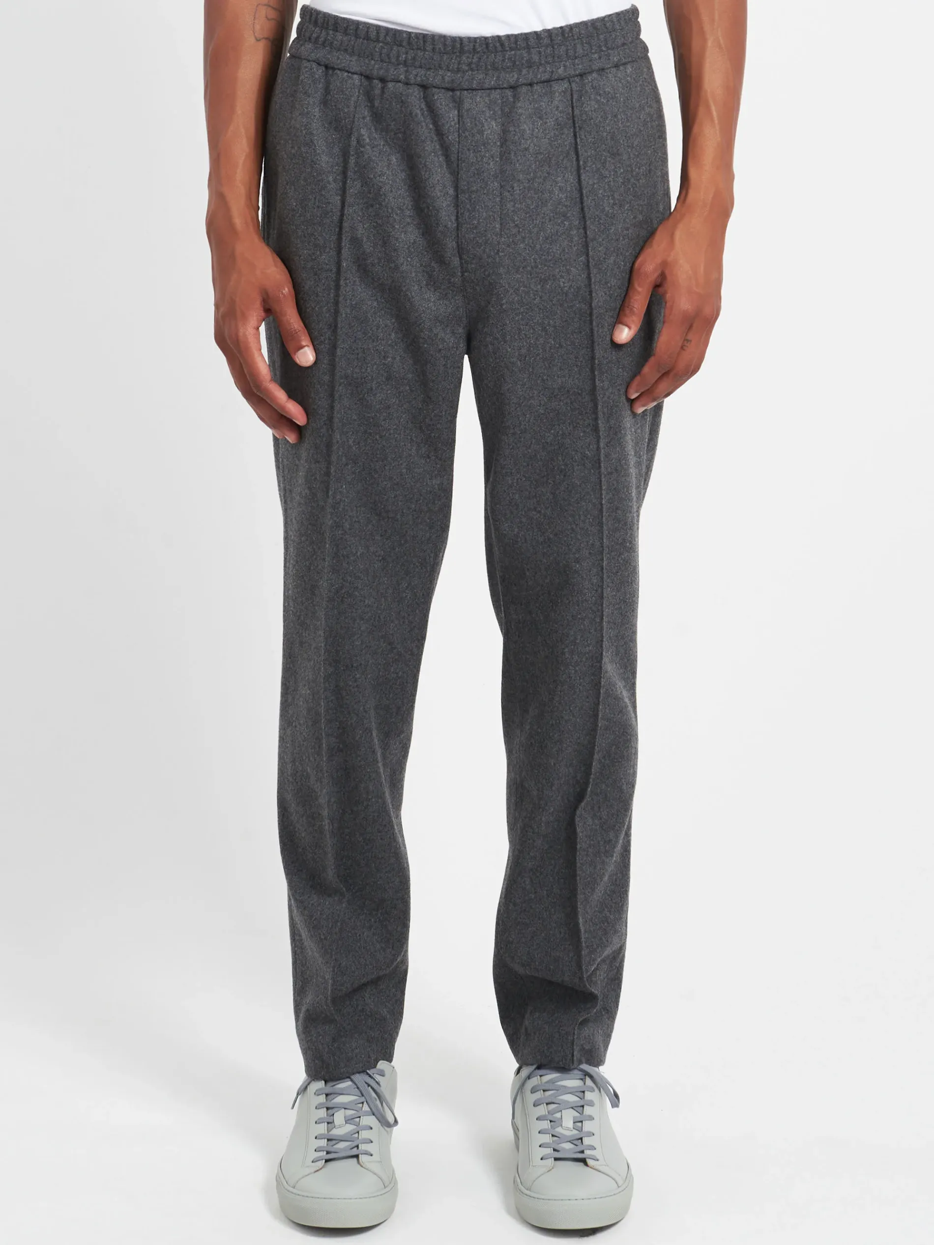 Heather navy blue pants made from a wool blend with a soft, easy drape. Neatly tailored with a straight leg.
