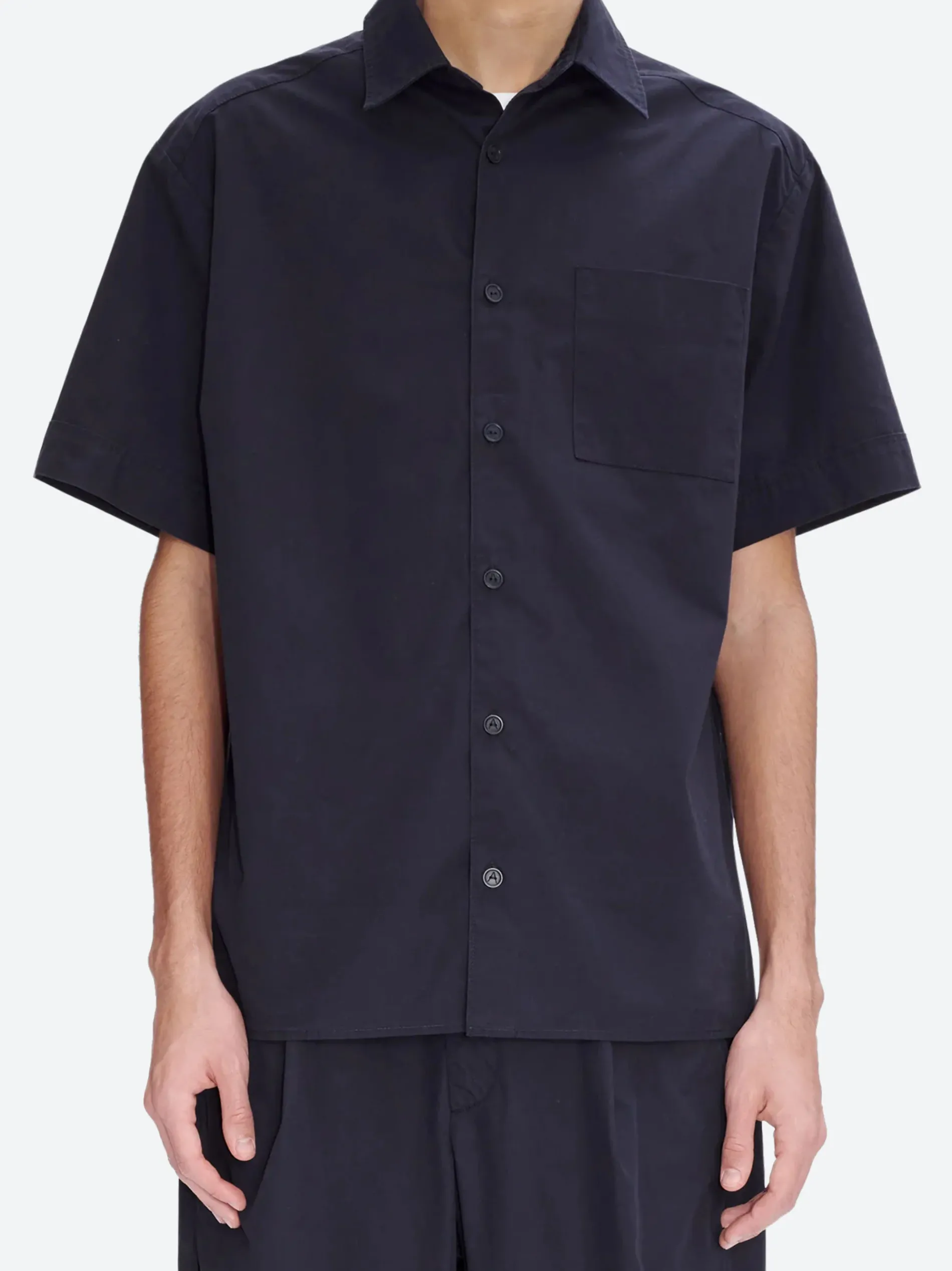 Loose dark navy blue short-sleeve shirt in organic cotton with small A.P.C. logo.