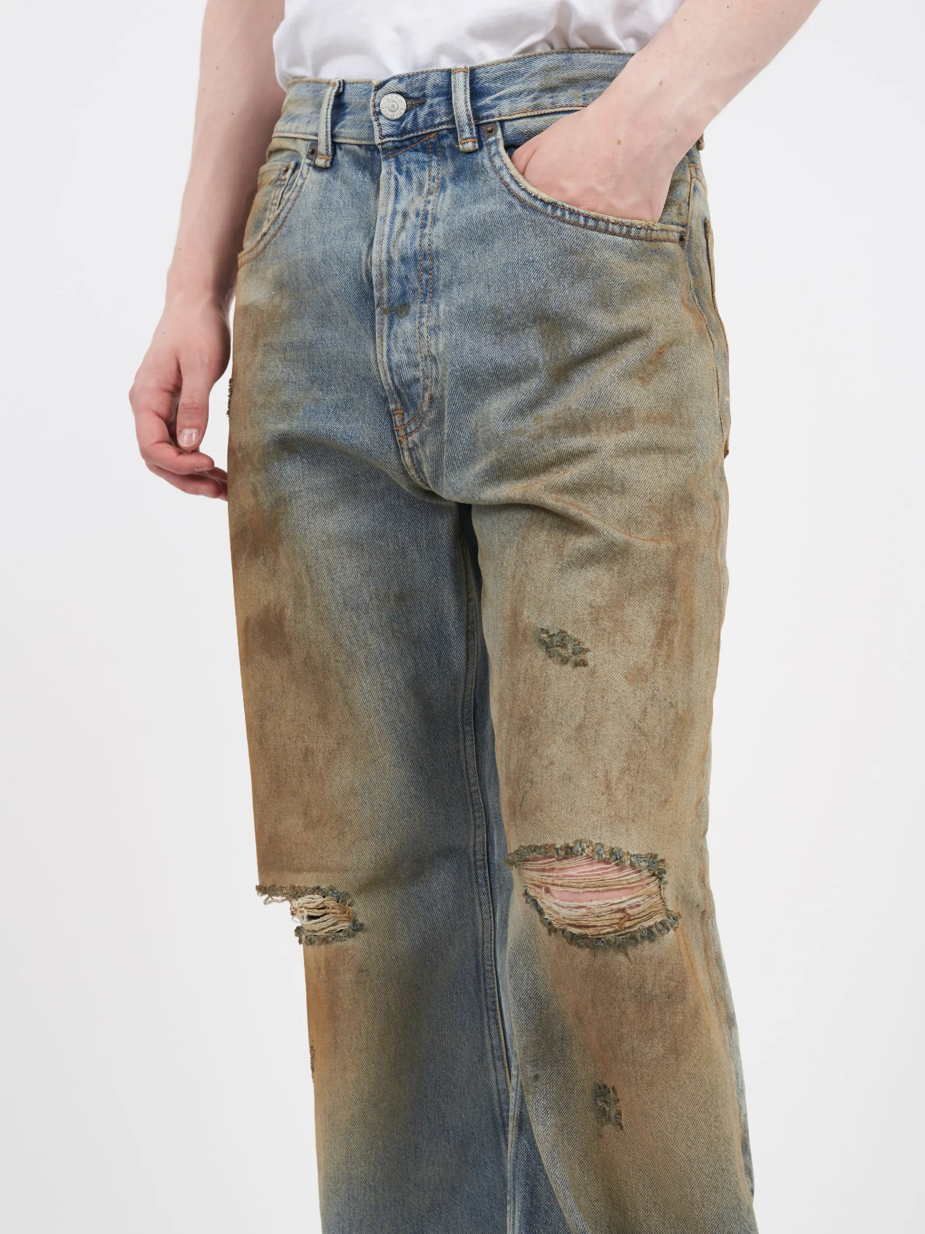 Acne Studios mid blue jeans are cut to a loose fit with a mid waist, wide leg and long length. Crafted from rigid denim made of cotton, adorned with distressed details and a seasonal garment dye finish.