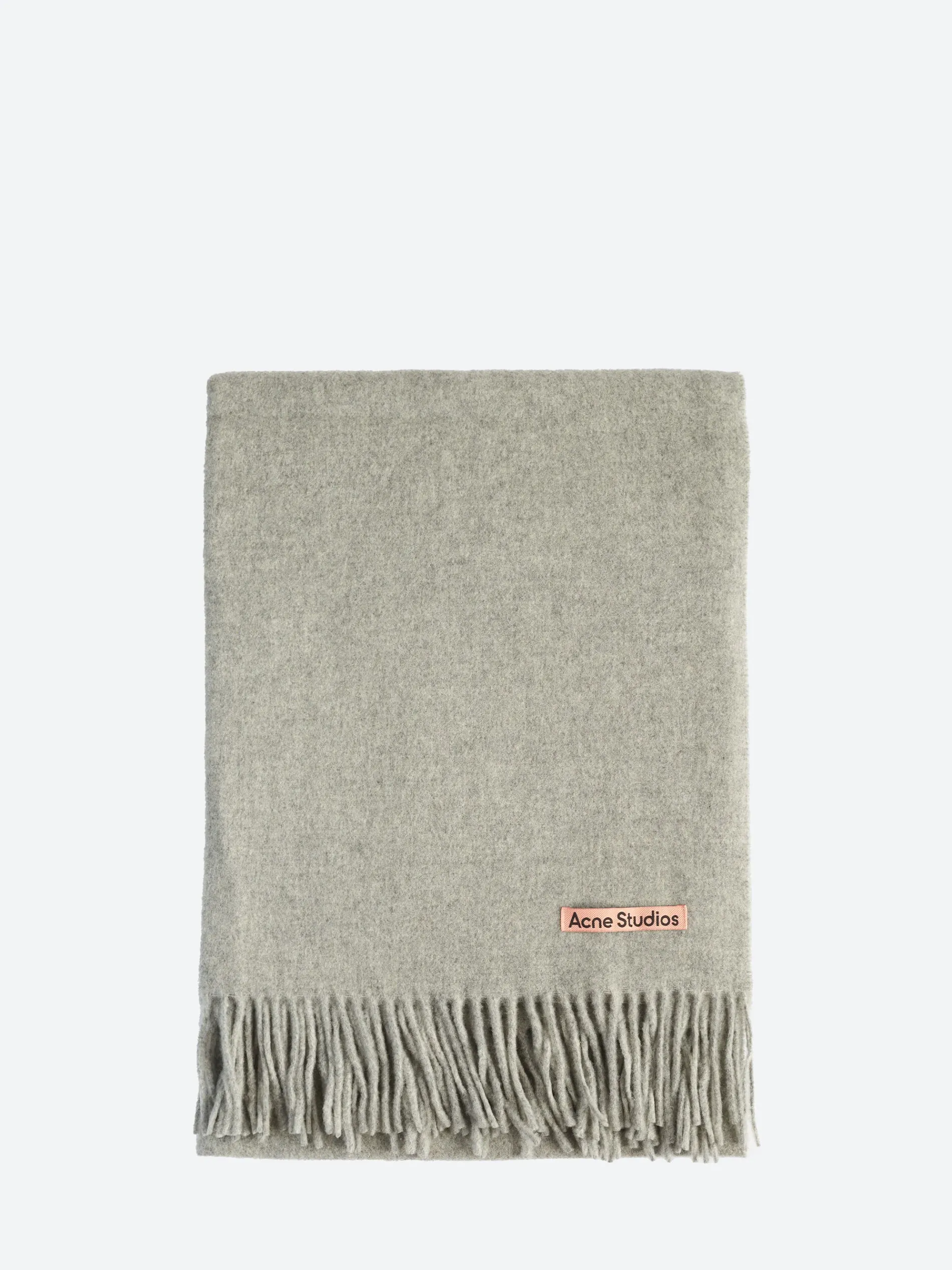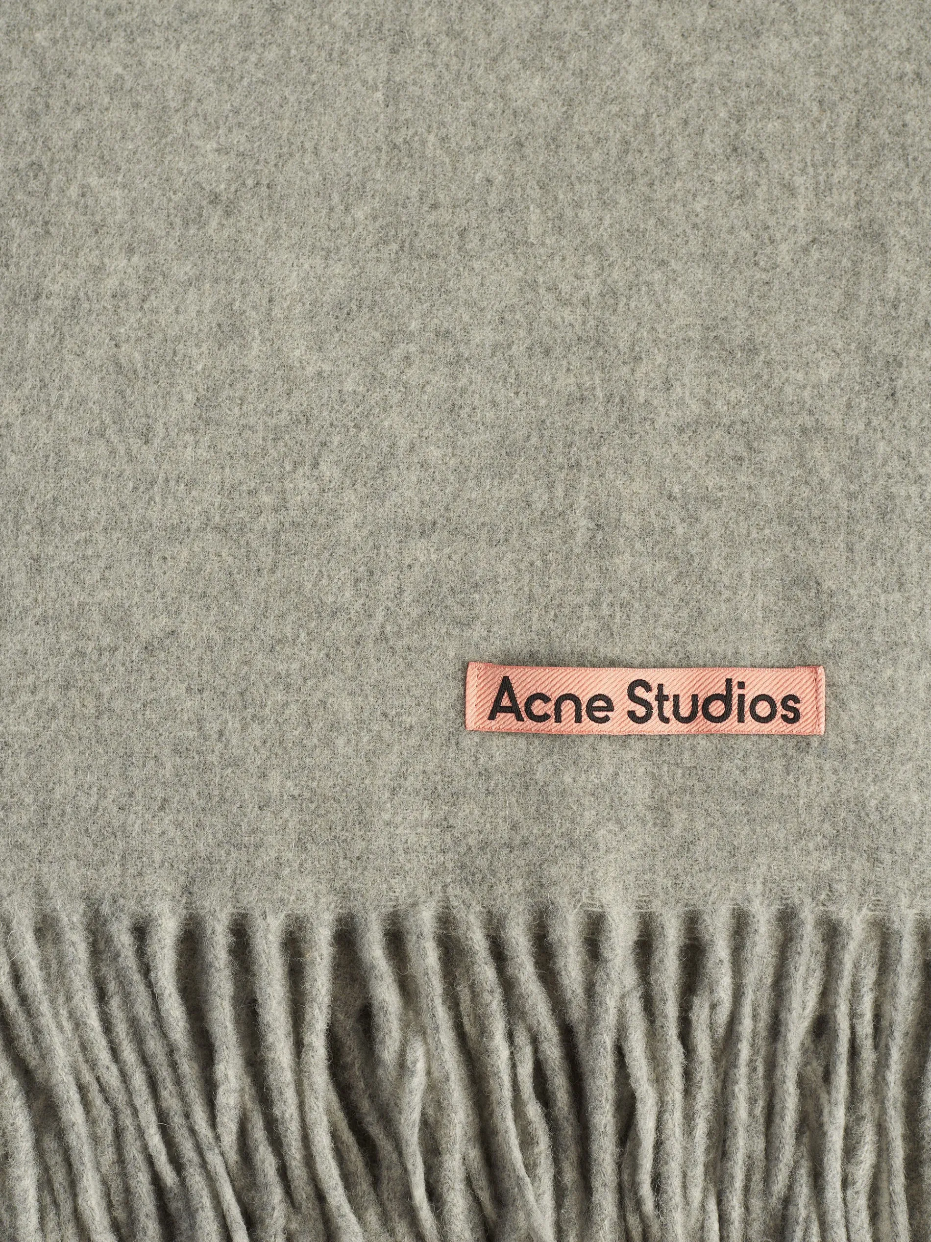 Acne Studios Canada New scarf is crafted to a wide dimension from pure wool and has fringed ends and a logo label stitched diagonally at the corner.