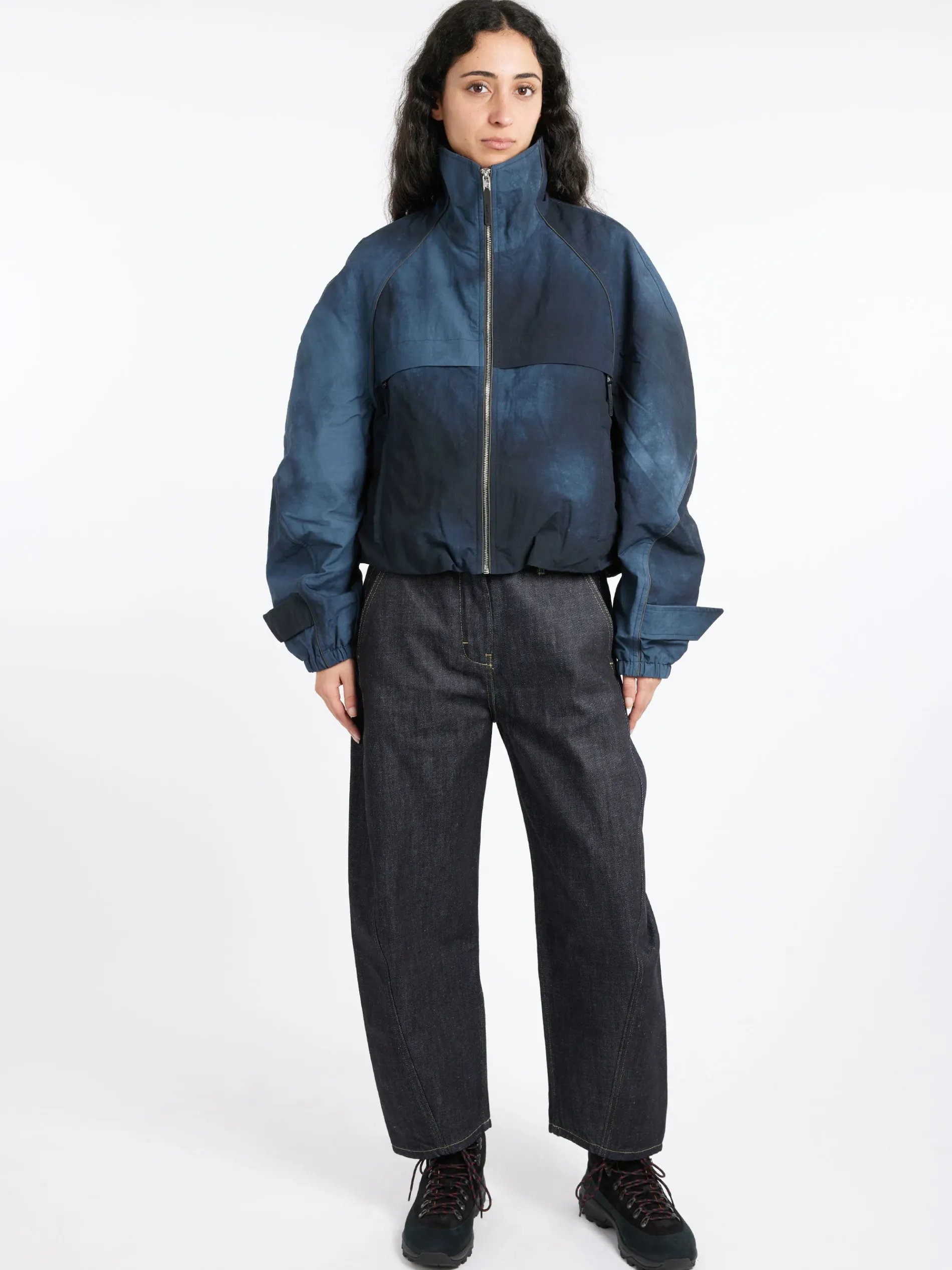 Jacket crafted from nylon with a garment-dyed finish, detailed with an Acne Studios logo patch on the center back neckline. Cut to a relaxed fit with a high neckline and below waist length.
