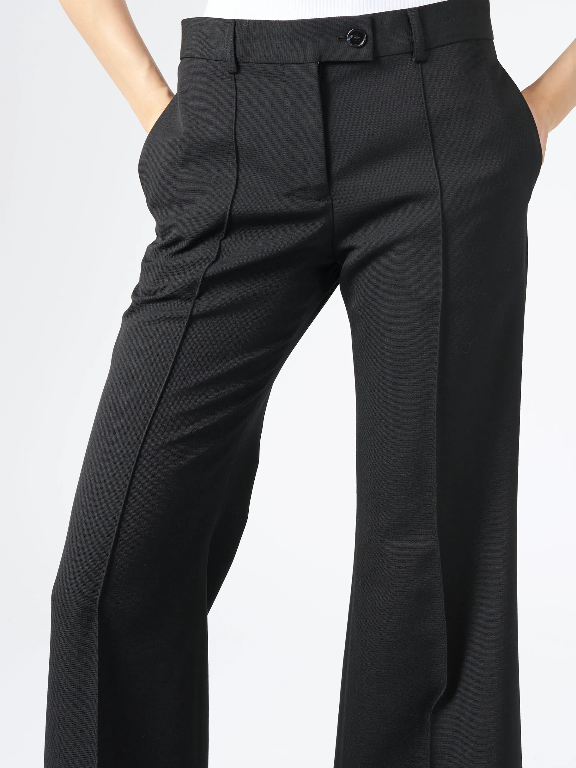 Acne Studios tailored trousers are crafted from a wool blend, detailed with front topstitched leg pleats and fold-up hem. Cut to a regular fit with a mid-waist, flared leg and long length.