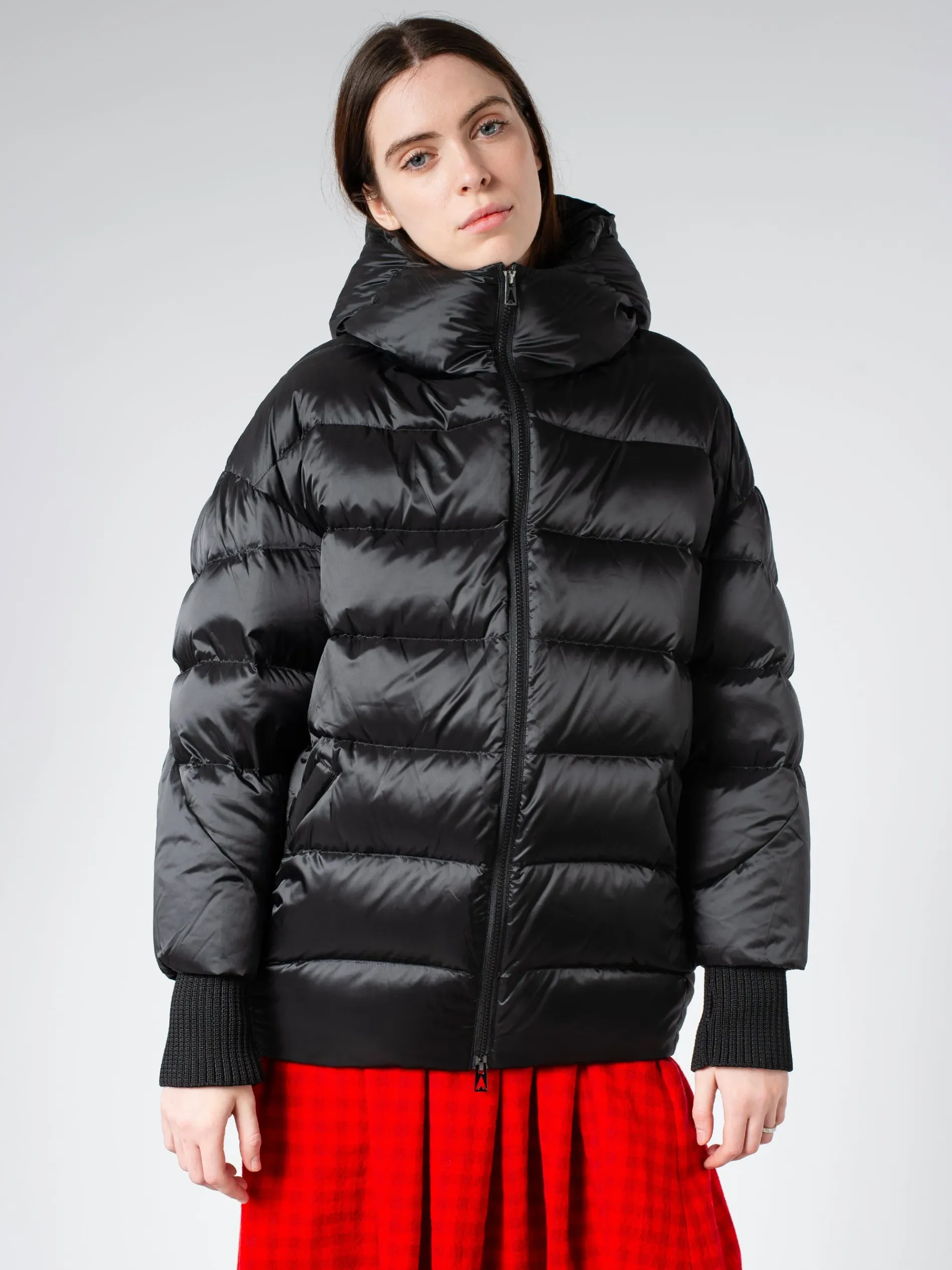 The Puffer Dome with goose down is an oversized jacket, the iconic Ahirain quilted model in a fabric of sophisticated and shiny “Rain Satin” nylon, waterproof and windproof.