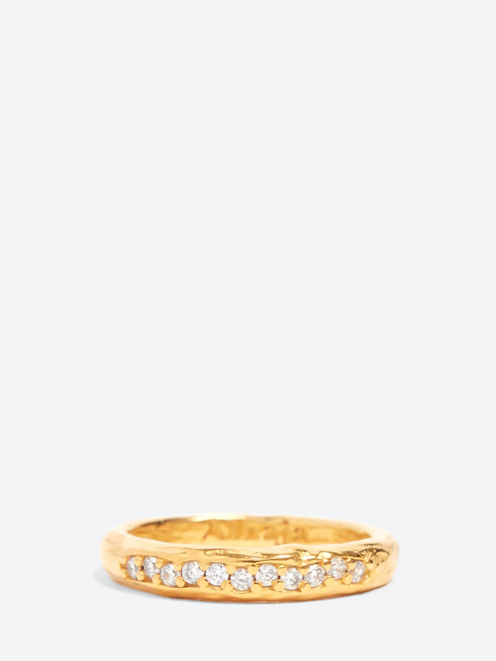 The Casilda Gold Ring from Alhaja is an elegant eternity band that combines timeless design with a touch of ancient inspiration. Crafted with a textured finish reminiscent of ancient relics, this ring features a row of carved zircons, adding a subtle sparkle to its rugged aesthetic.