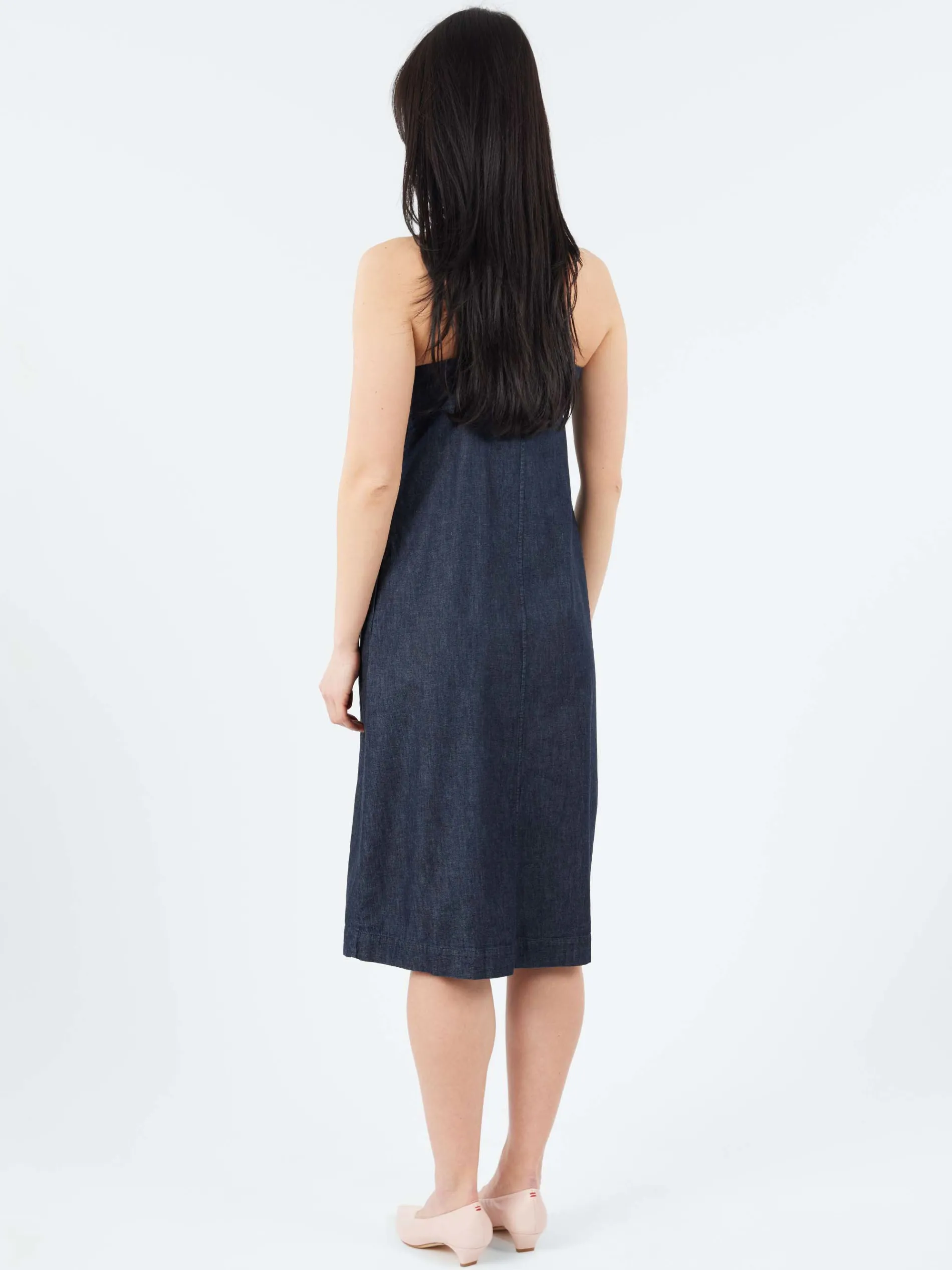 This long cotton denim dress features a V-neckline and spaghetti straps, offering a sleeveless design for a light, breezy feel. The skirt flares at the bottom, with an inverted pleat down the center, adding movement and structure to the silhouette. With its regular fit, this dress combines comfort and style, making it a versatile option for various occasions.
