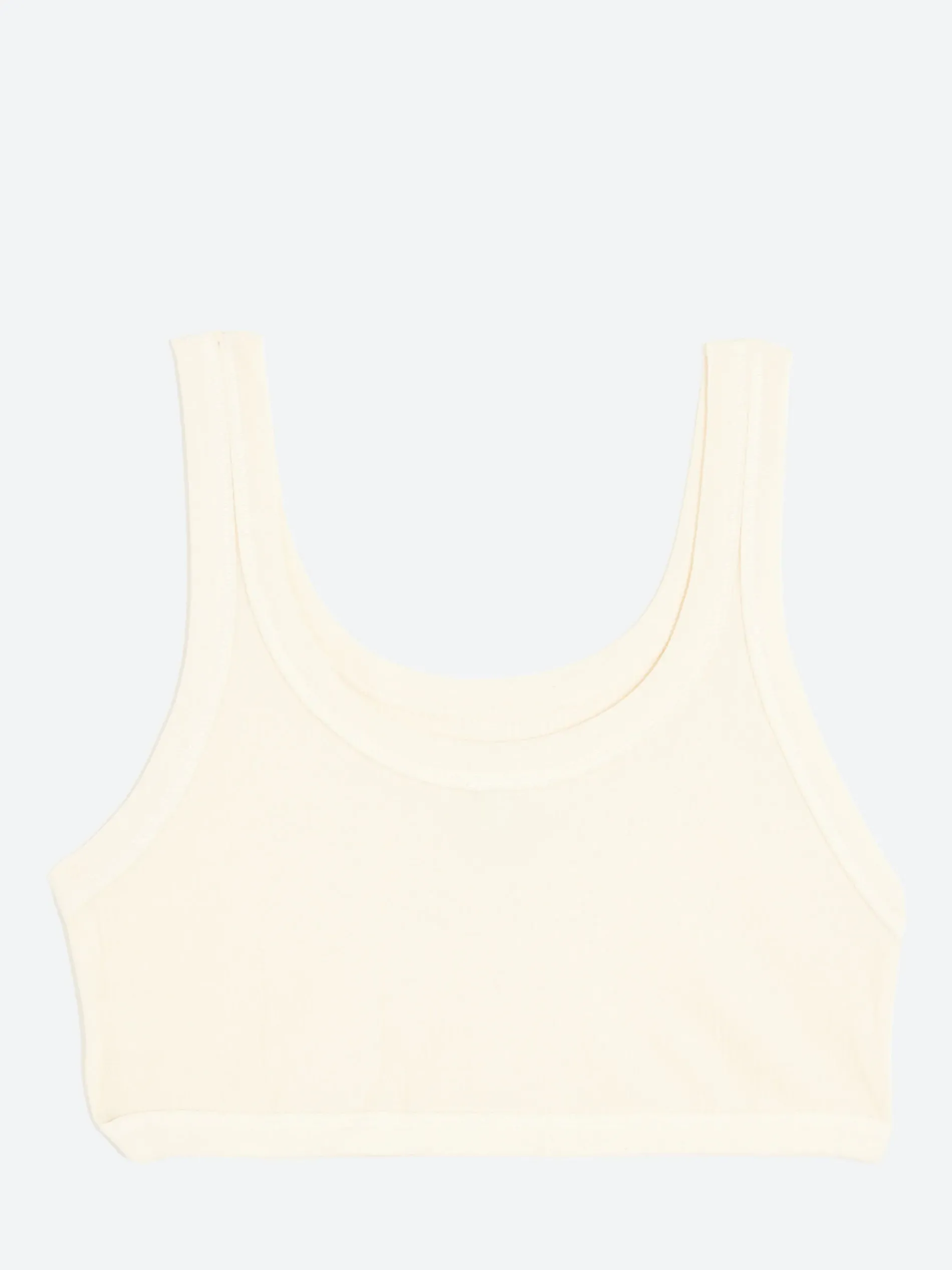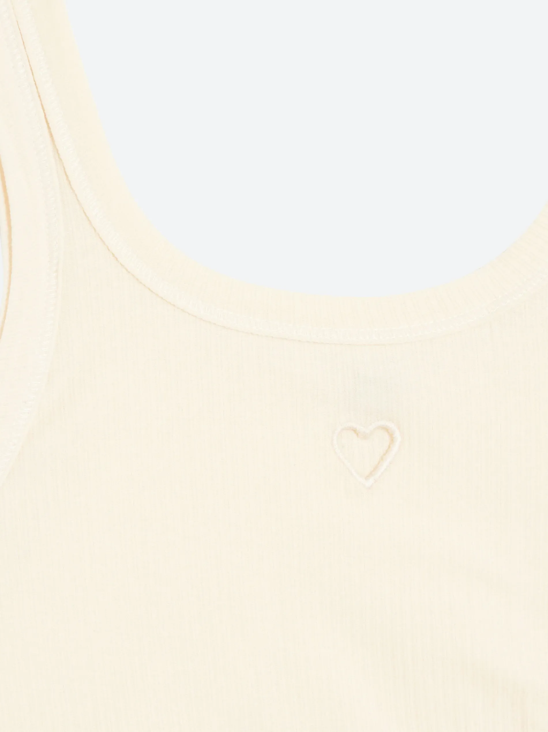 A soft, eco-friendly organic cotton rib bra with heart-shaped embroidery, a front cut-out, and a scoop neckline. Features elastic trim at the neckline and hem, made from cotton for a natural, sustainable touch.