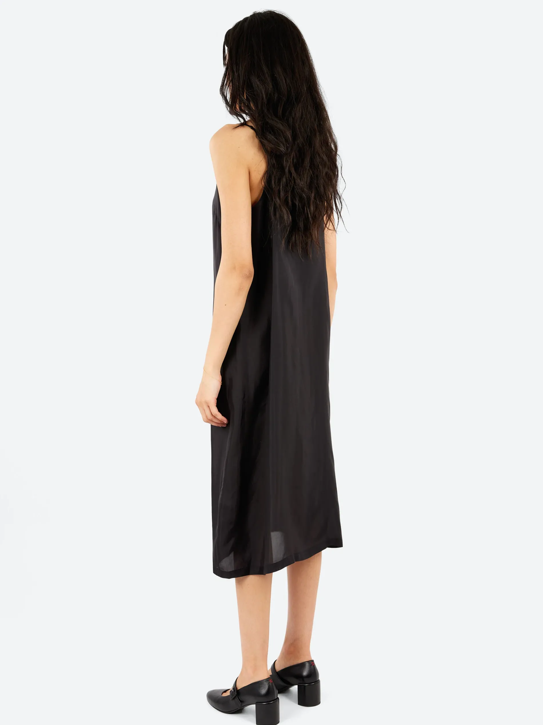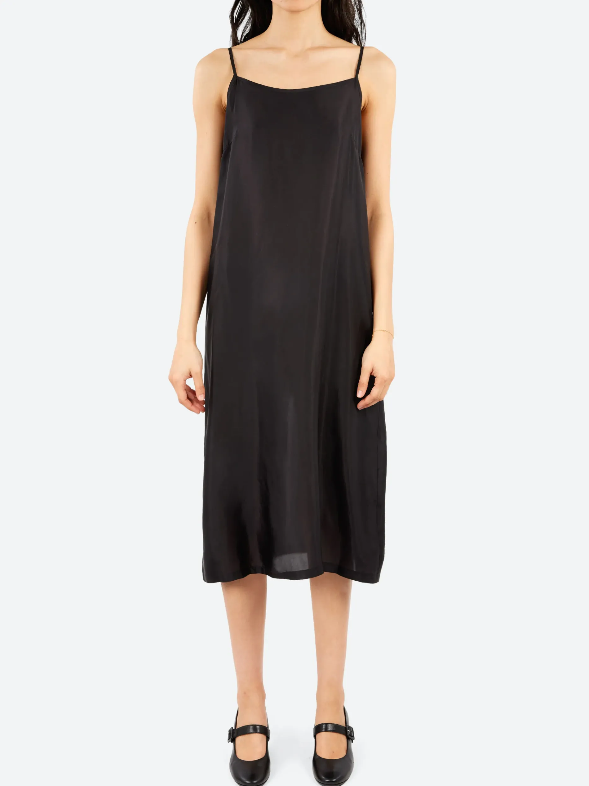 Pas de Calais slip dress featuring thin adjustable straps and a round neckline. Made from lightweight and smooth cupro taffeta, this dress offers a sleek, comfortable fit with a luxurious feel. Its minimalist design makes it a versatile and elegant addition to any wardrobe.