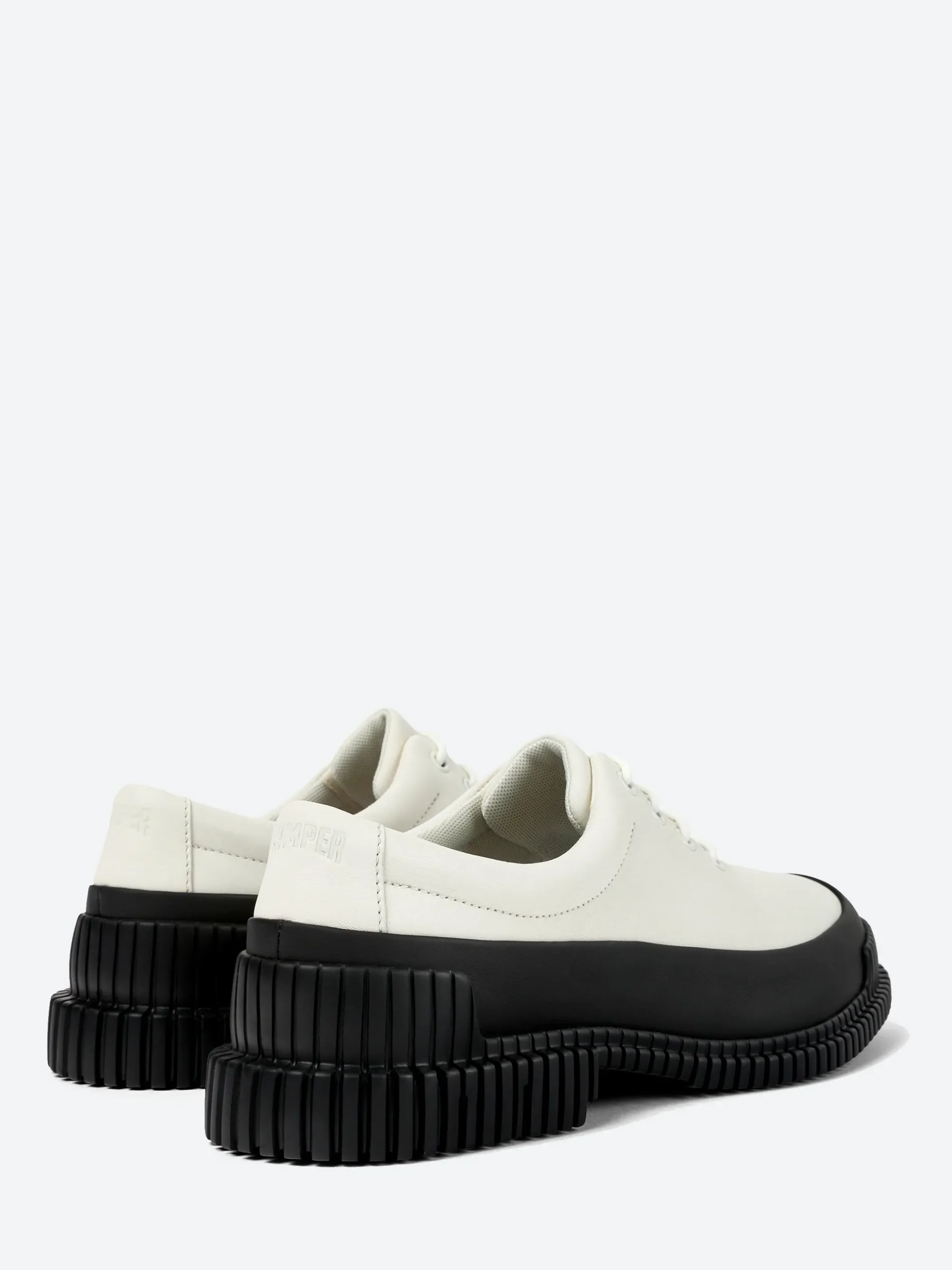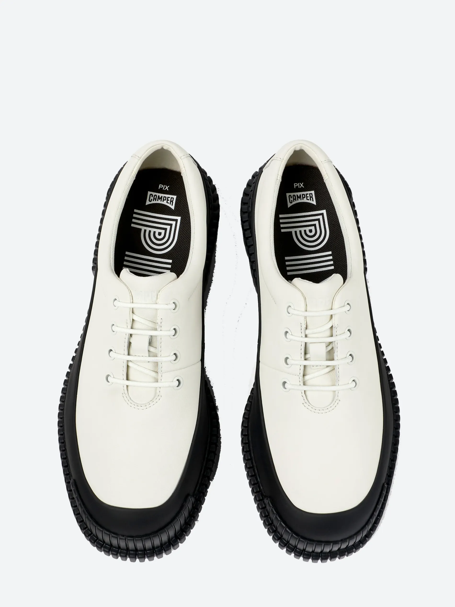 Camper Pix are playful in shape, with smooth leather and a sport grade outsole for superior flexibility. The iconic 3D outsoles beneath are incorporated with X-shaped torsion technology for enhanced stability.