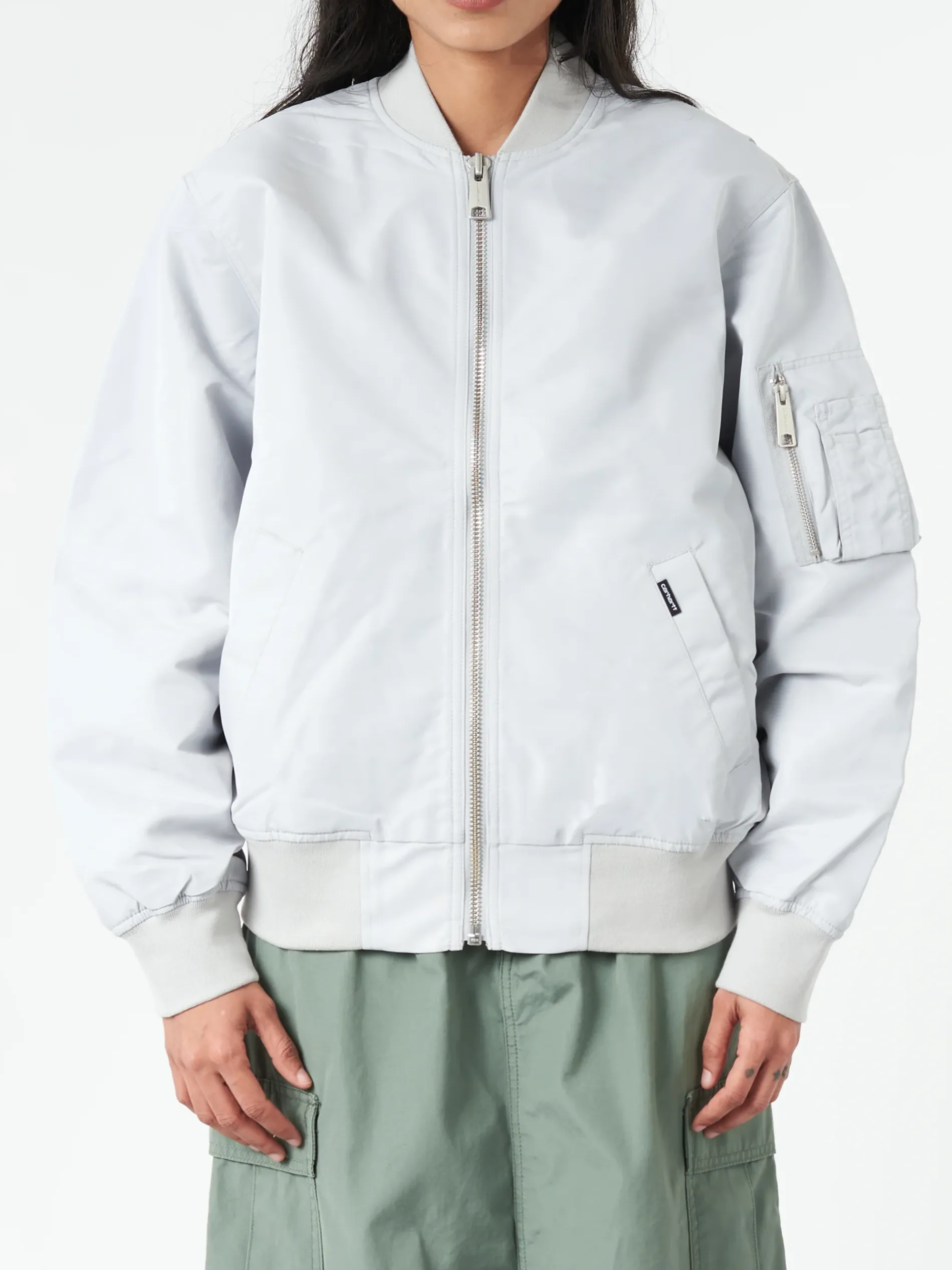 The Women’s Otley Bomber is made from water-repellent nylon twill and is lined with nylon taffeta. It has a rib-knit bottom band and cuffs, which create a cinching effect.
