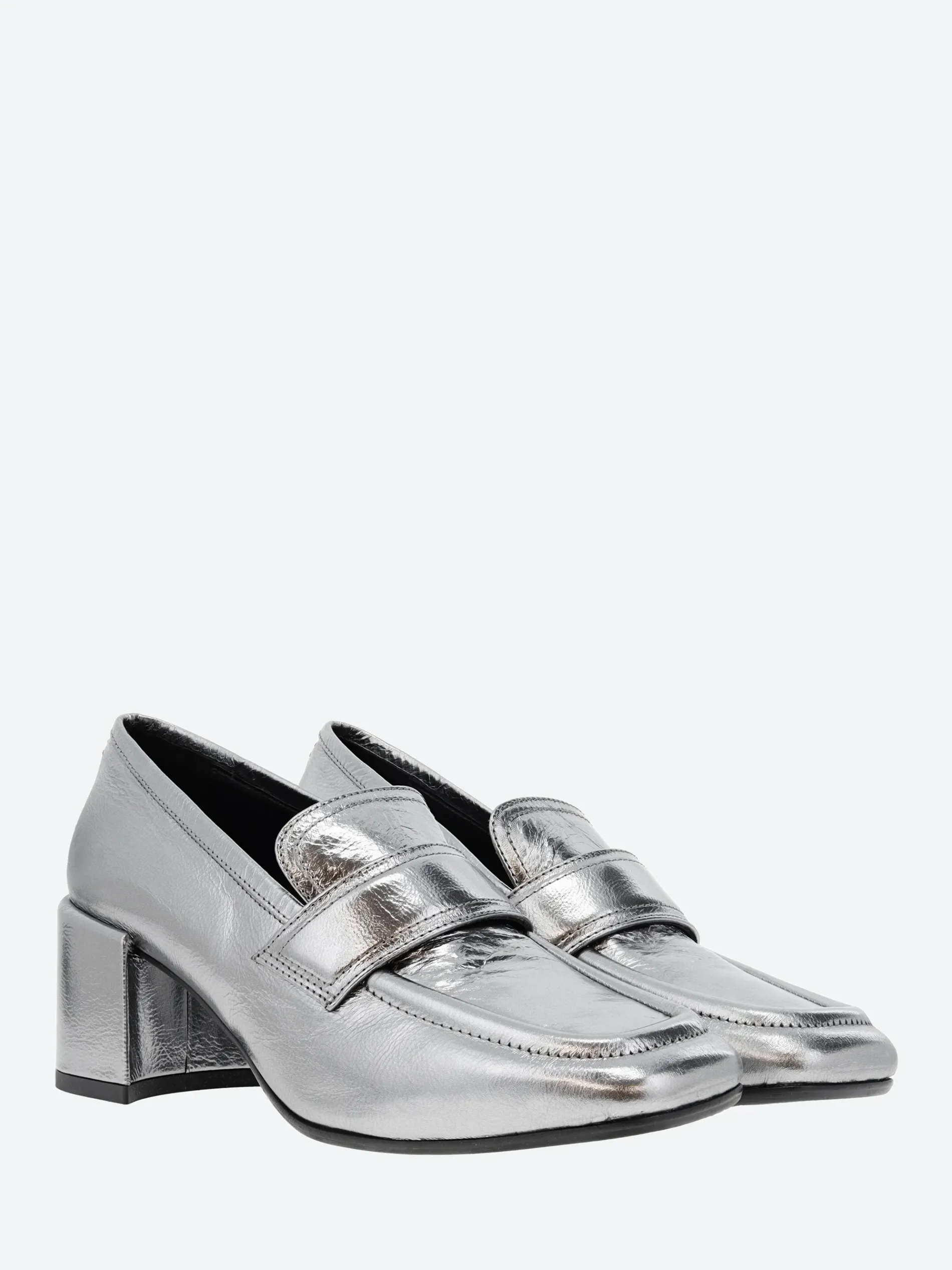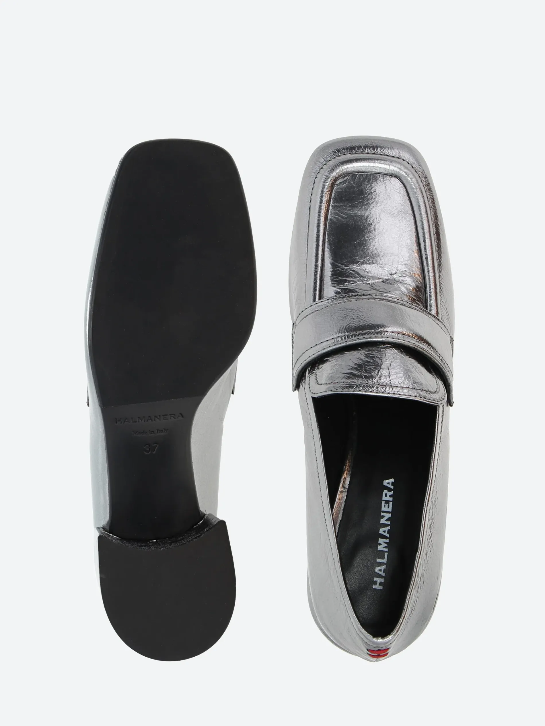 Halmanera heeled loafer in shiny leather. A slip-on style for easy on and off. Finished with a self covered wooden heel.