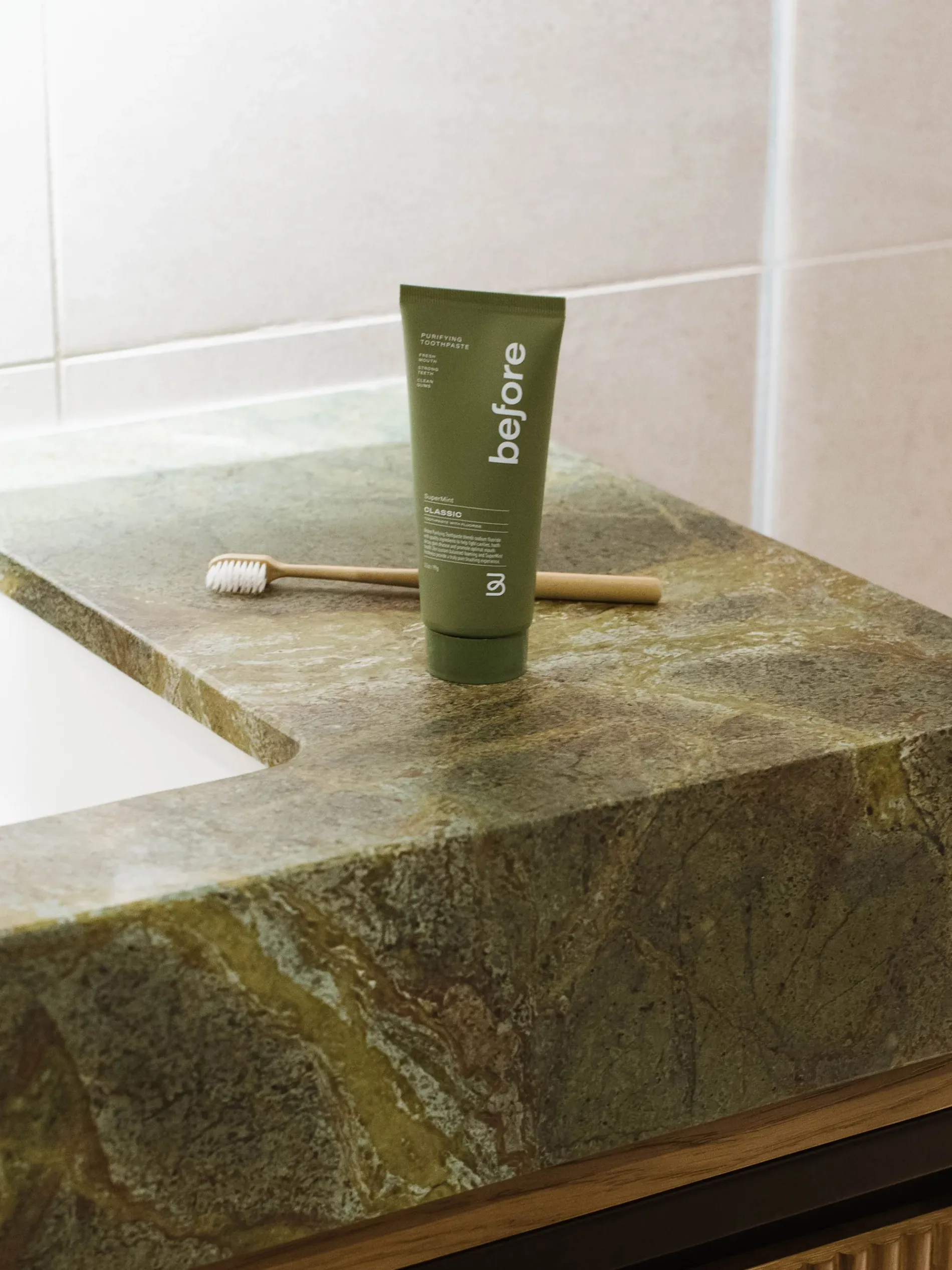 Upgrade your brushing routine with Before’s natural Purifying Classic Toothpaste. Perfectly balanced foaming, soothing Supermint flavour and silky low-abrasion texture. Fight cavities, remineralize your tooth enamel, and level up your mouth health without harmful chemicals and synthetic ingredients.