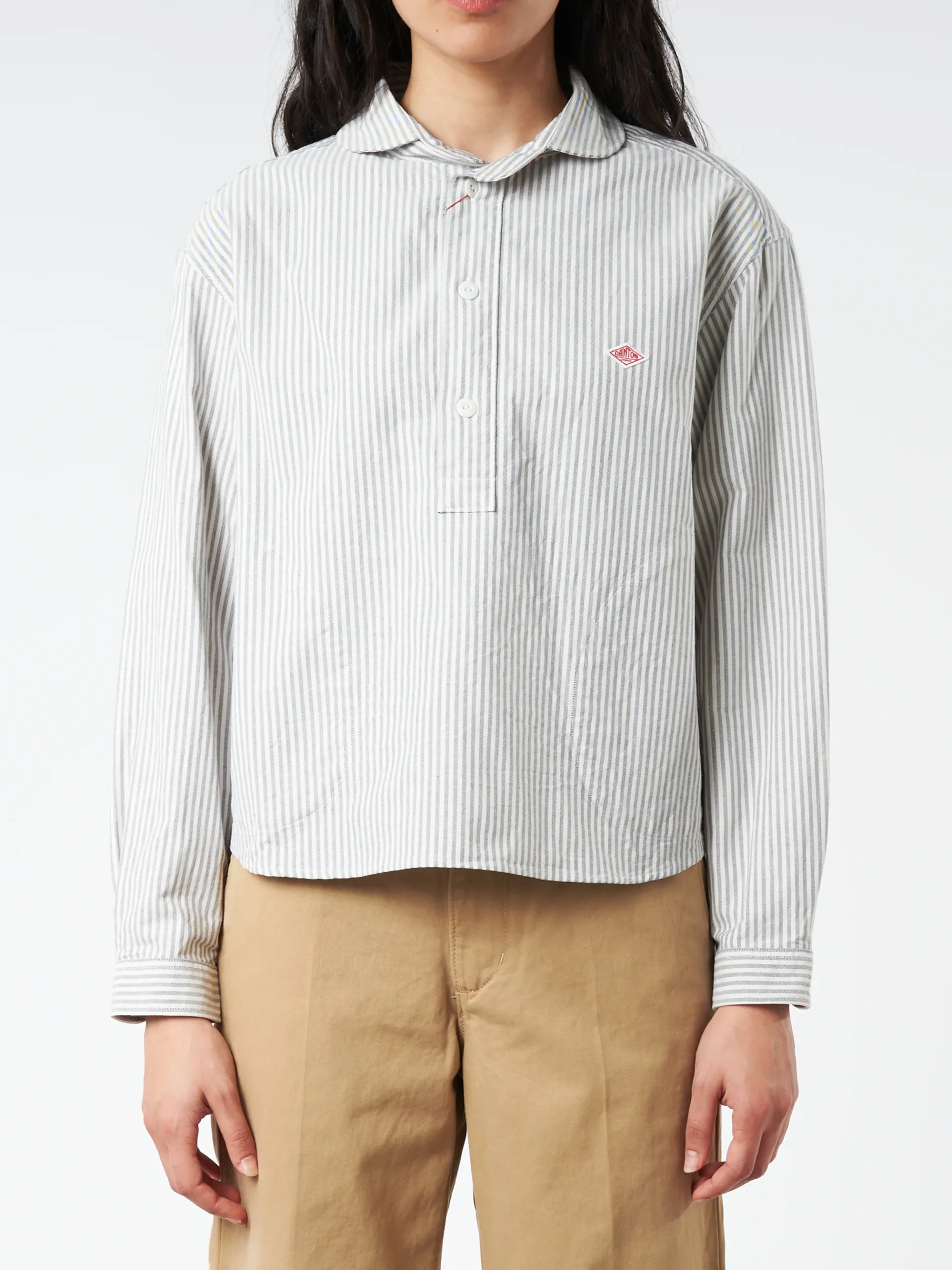 Danton’s signature round collar shirt with newly designed wide silhouette. Made with Japanese oxford fabric woven with high quality supima cotton, which is known for its extra-fine quality and texture.