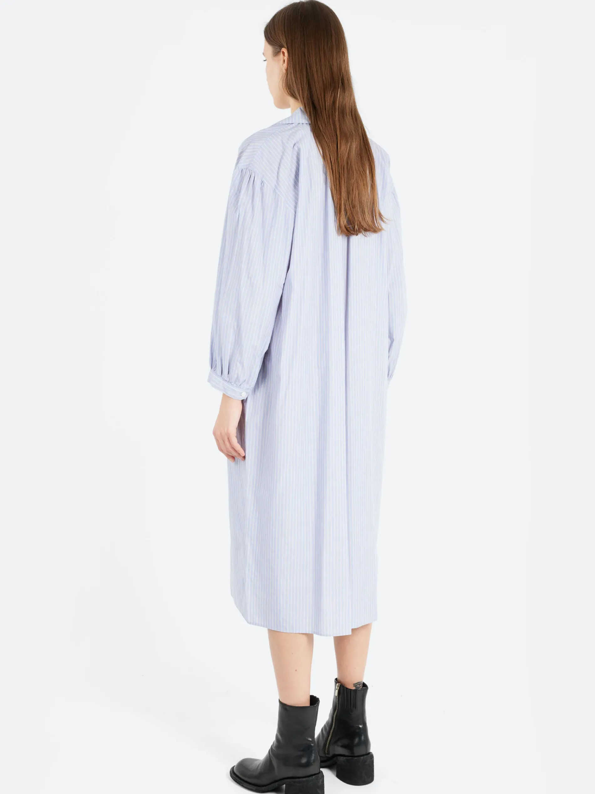 A pullover dress with a wide-open collar. Made from a cotton typewriter fabric with soft and raised texture.
