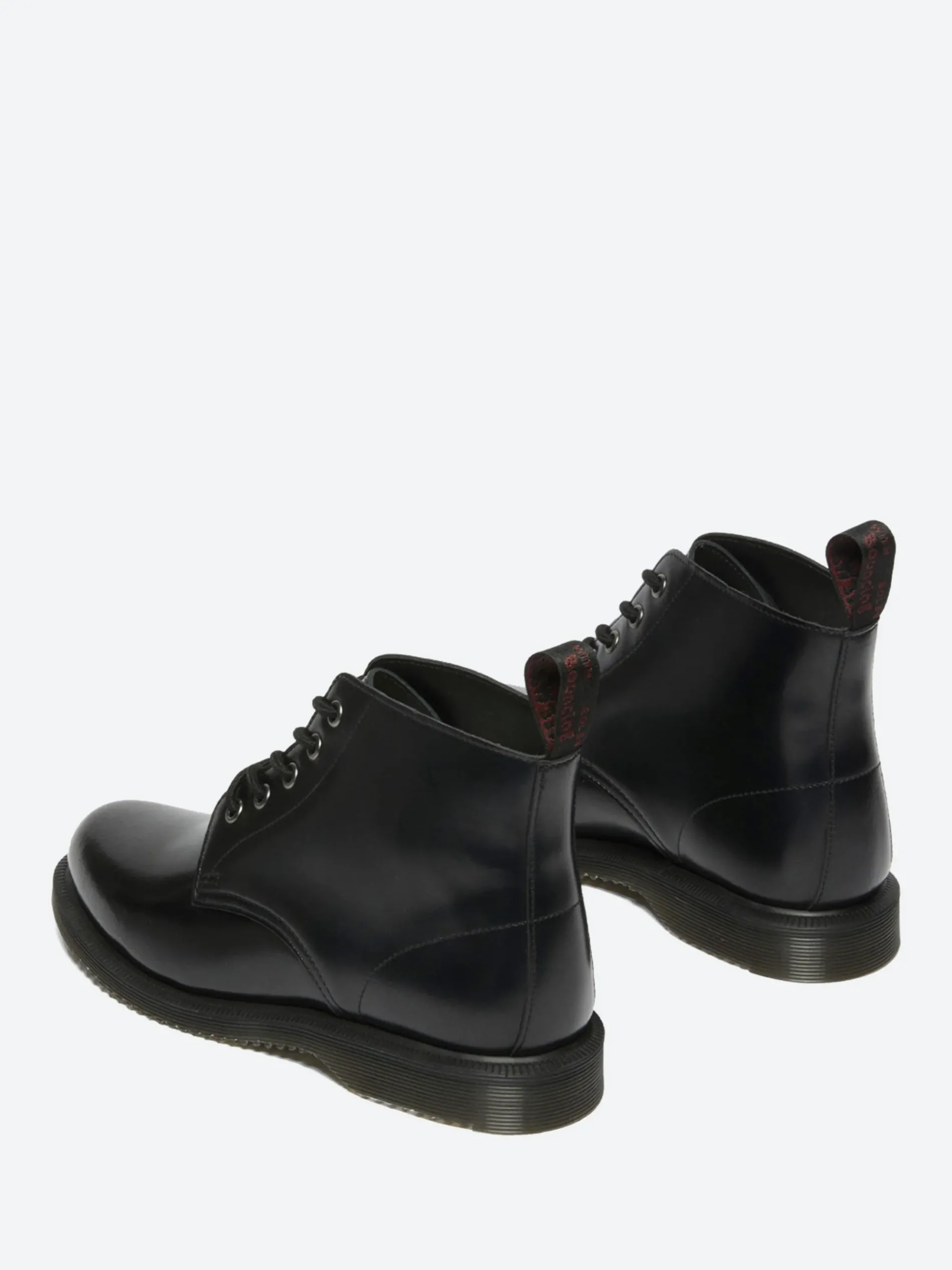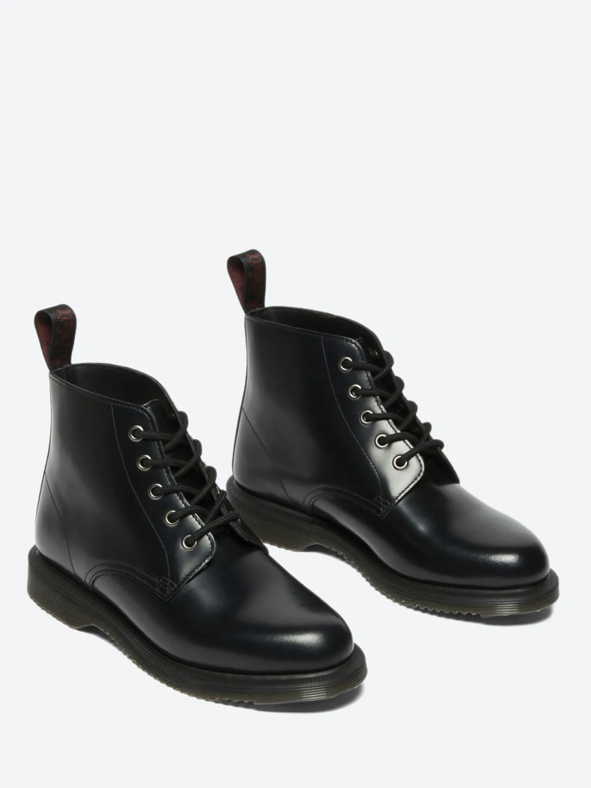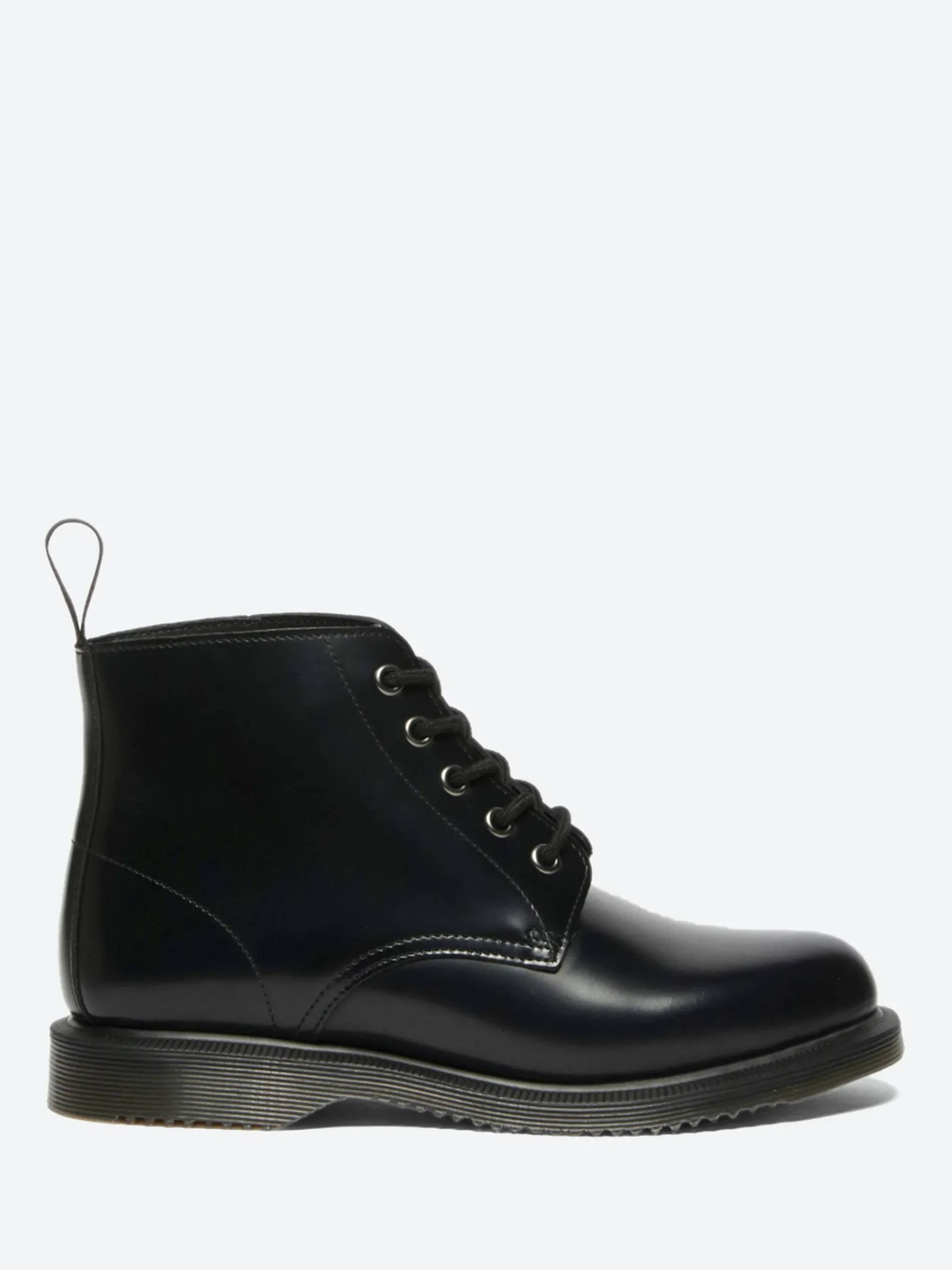 The Emmeline is a sleek 5-eye boot with a tapered toe shape. It is built from black Polished Smooth leather and punched with silver eyelets. It stands on a low-profile grooved sole secured with a plain welt for a sleek, minimalist finish.