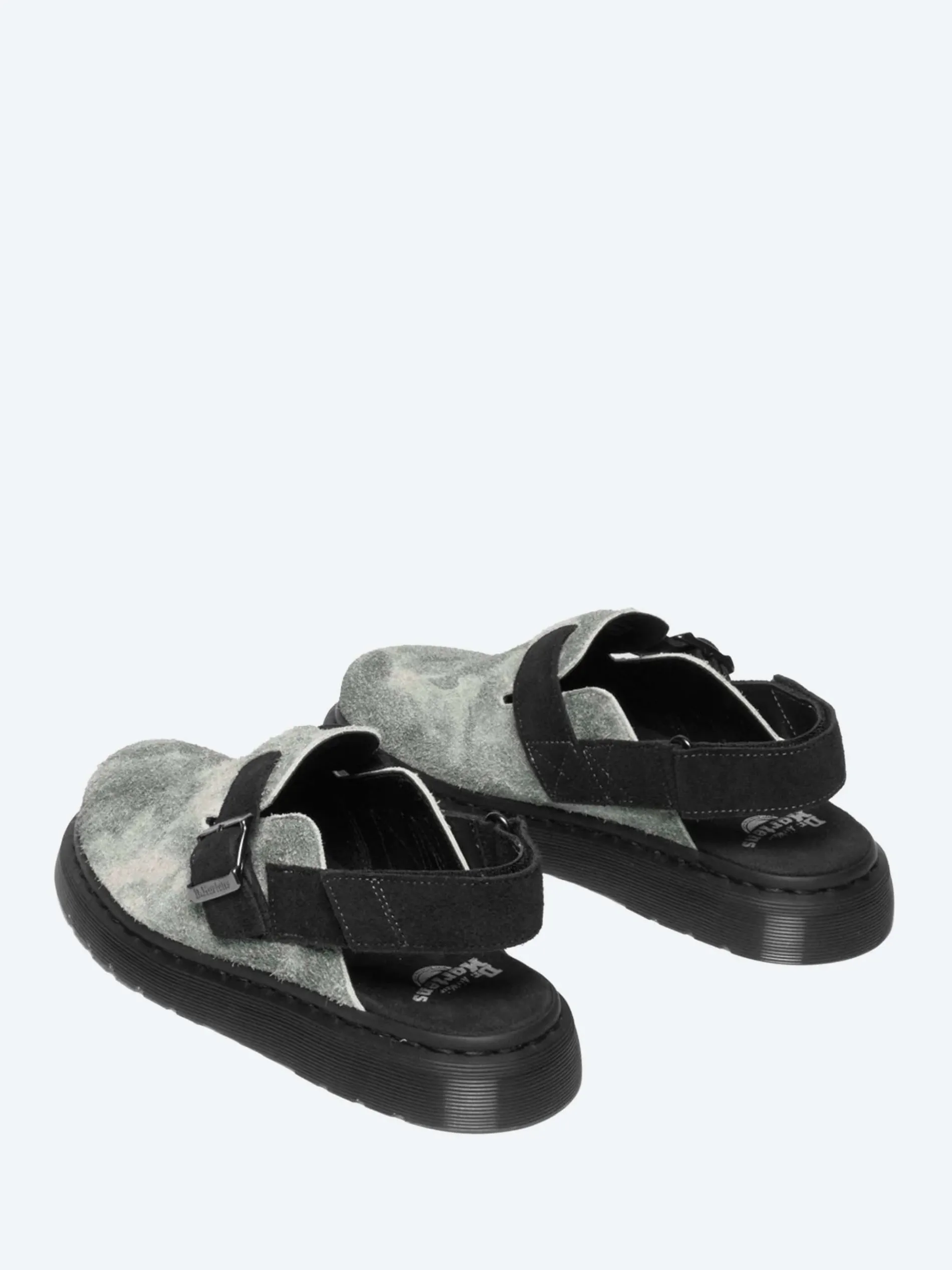 Dialed up with a distressed, worn-in-looking material, Dr. Martens slip-on Jorge mule returns in newly tanned Stonewashed Hairy suede. Part shoe, part sandal, the versatile mule is fitted with gunmetal buckles for a secure fit.
