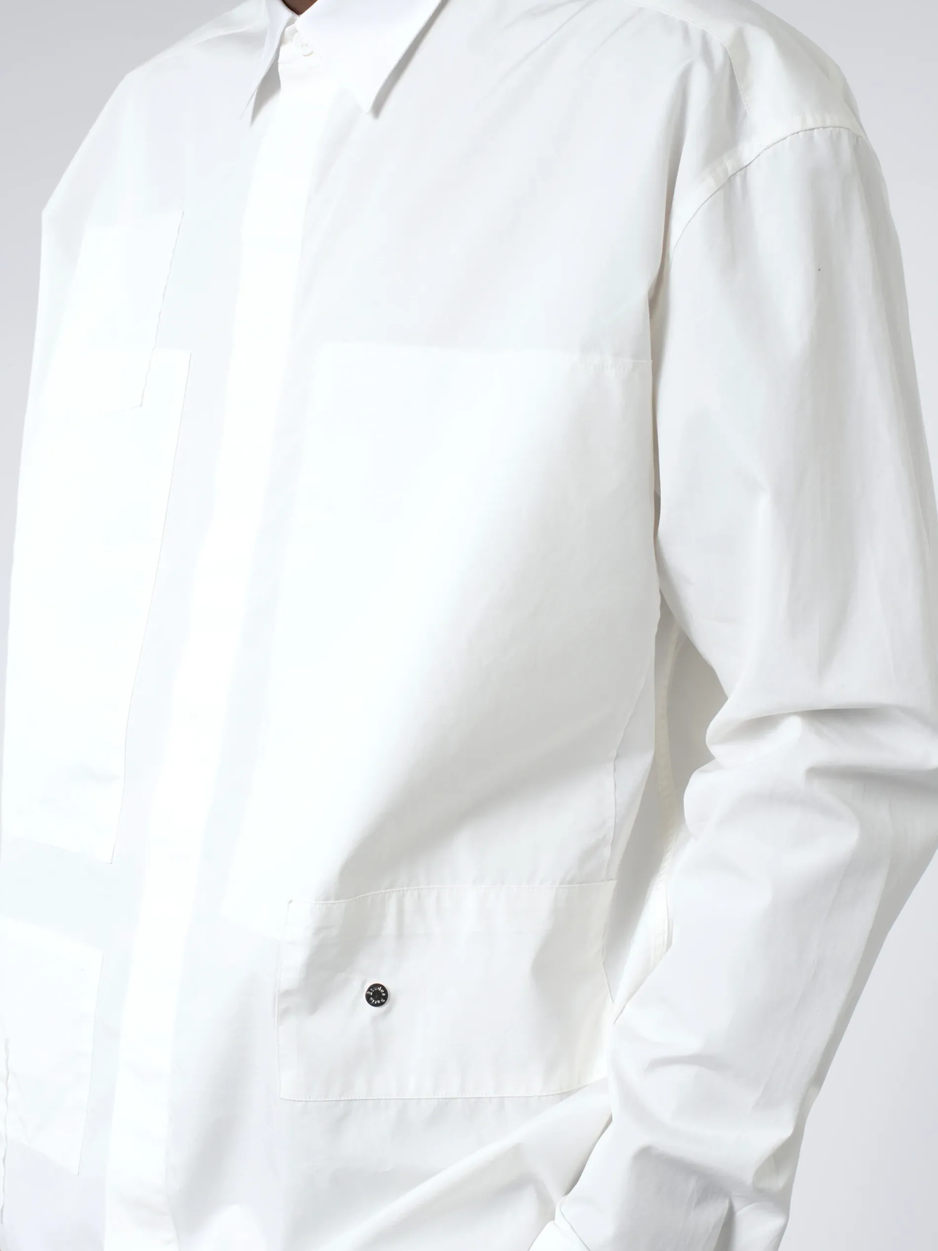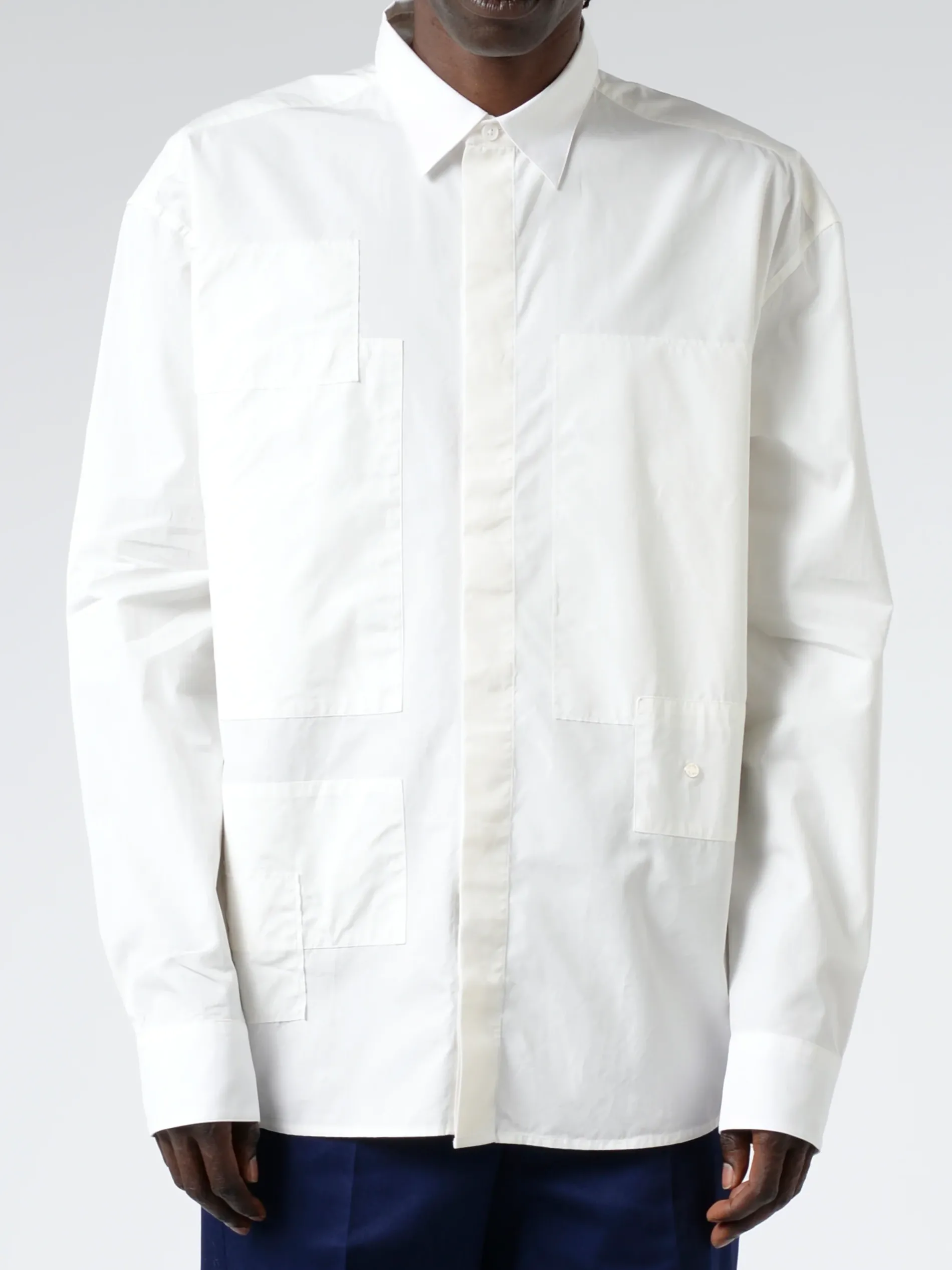 The Paysage is a long sleeve oversized cotton shirt. This shirt is composed of a hidden button placket with button closure, sewn-on patches and an Études rivet on the front.