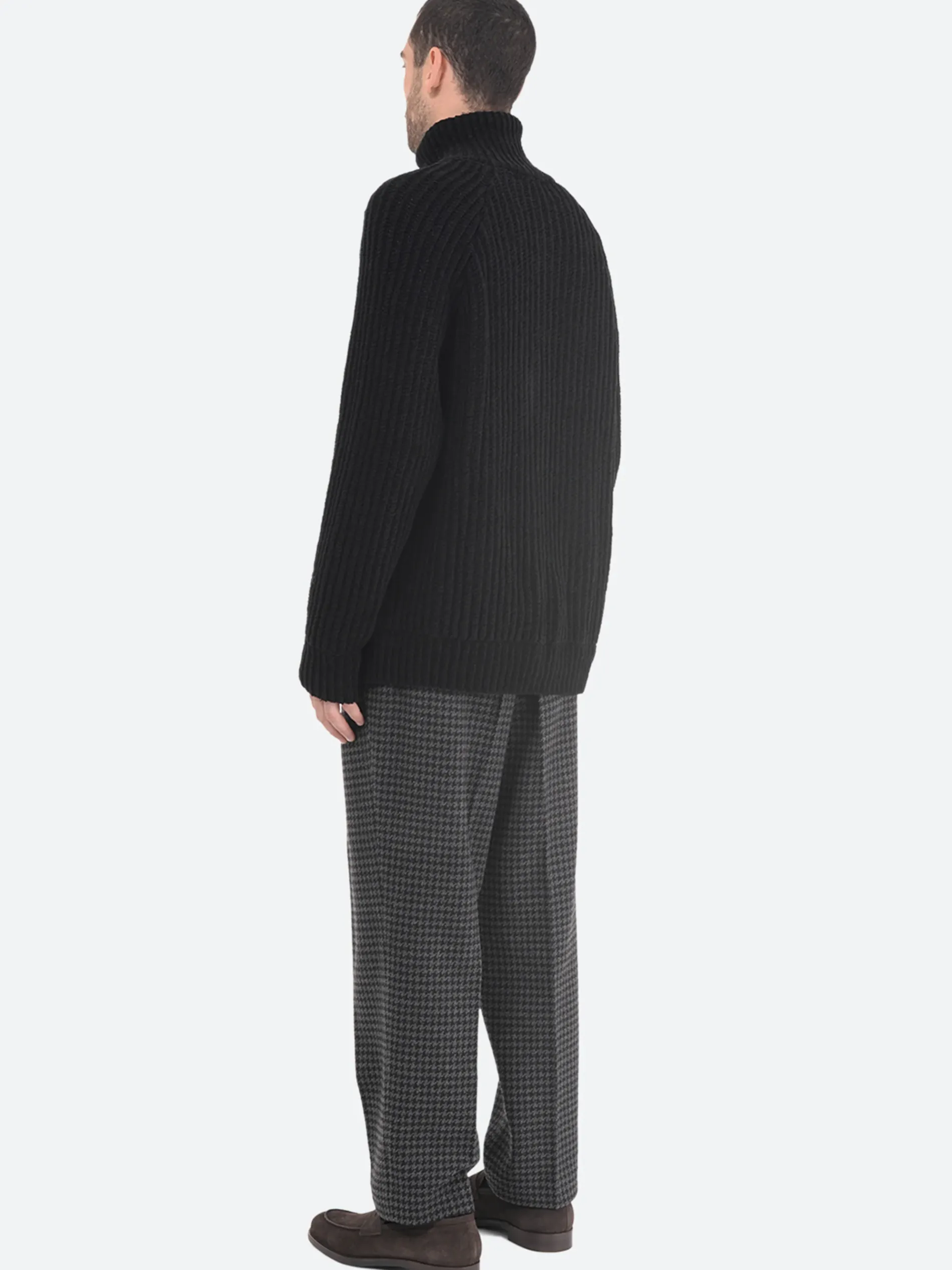 The Vassili Black is a half-zipped knitted turtleneck sweater. It is made of a soft wool blend material.
