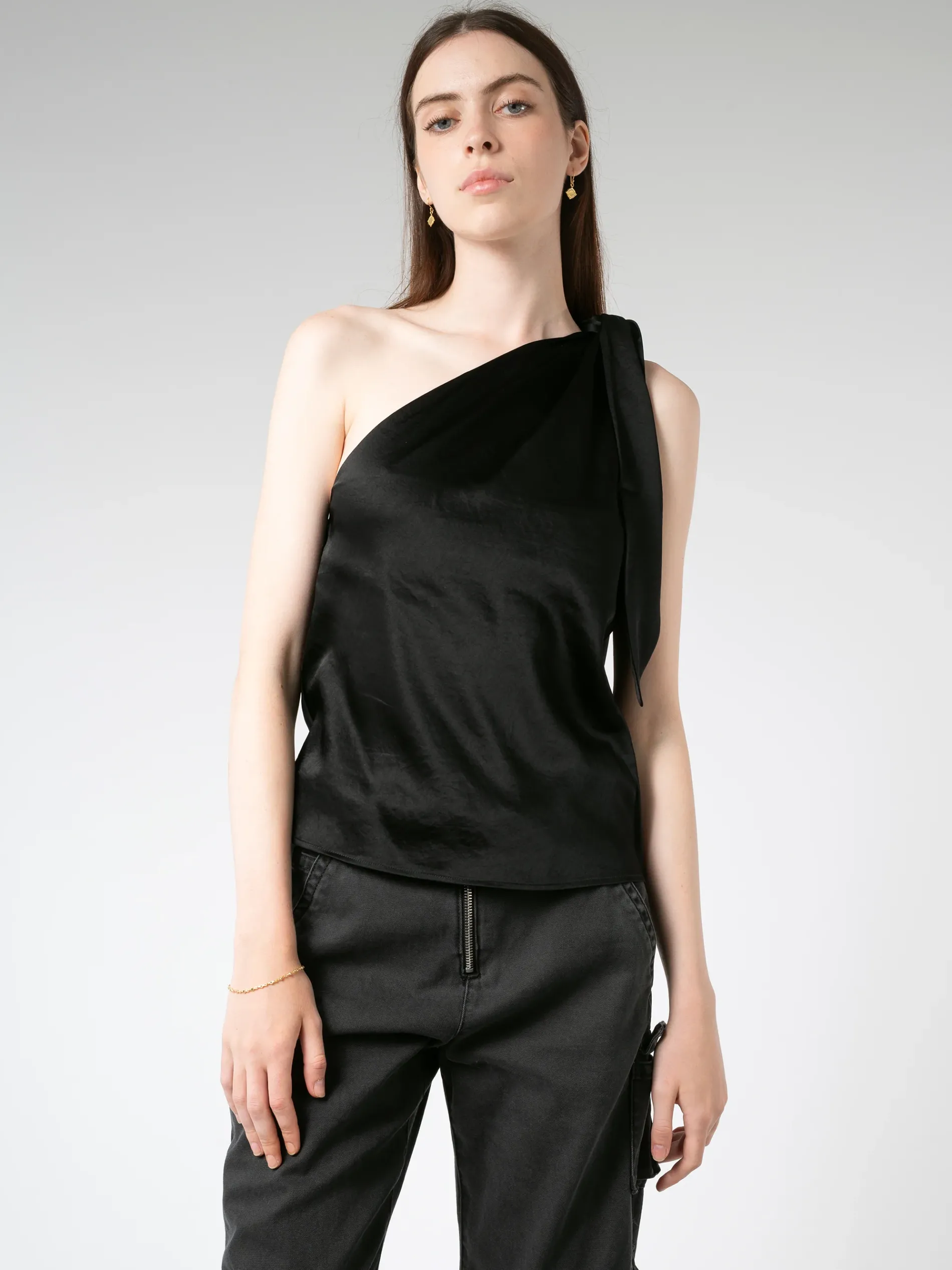 Asymmetric tank top in draped triacetate that’s wrinkle and static resistant, and has a hammered-effect finish.