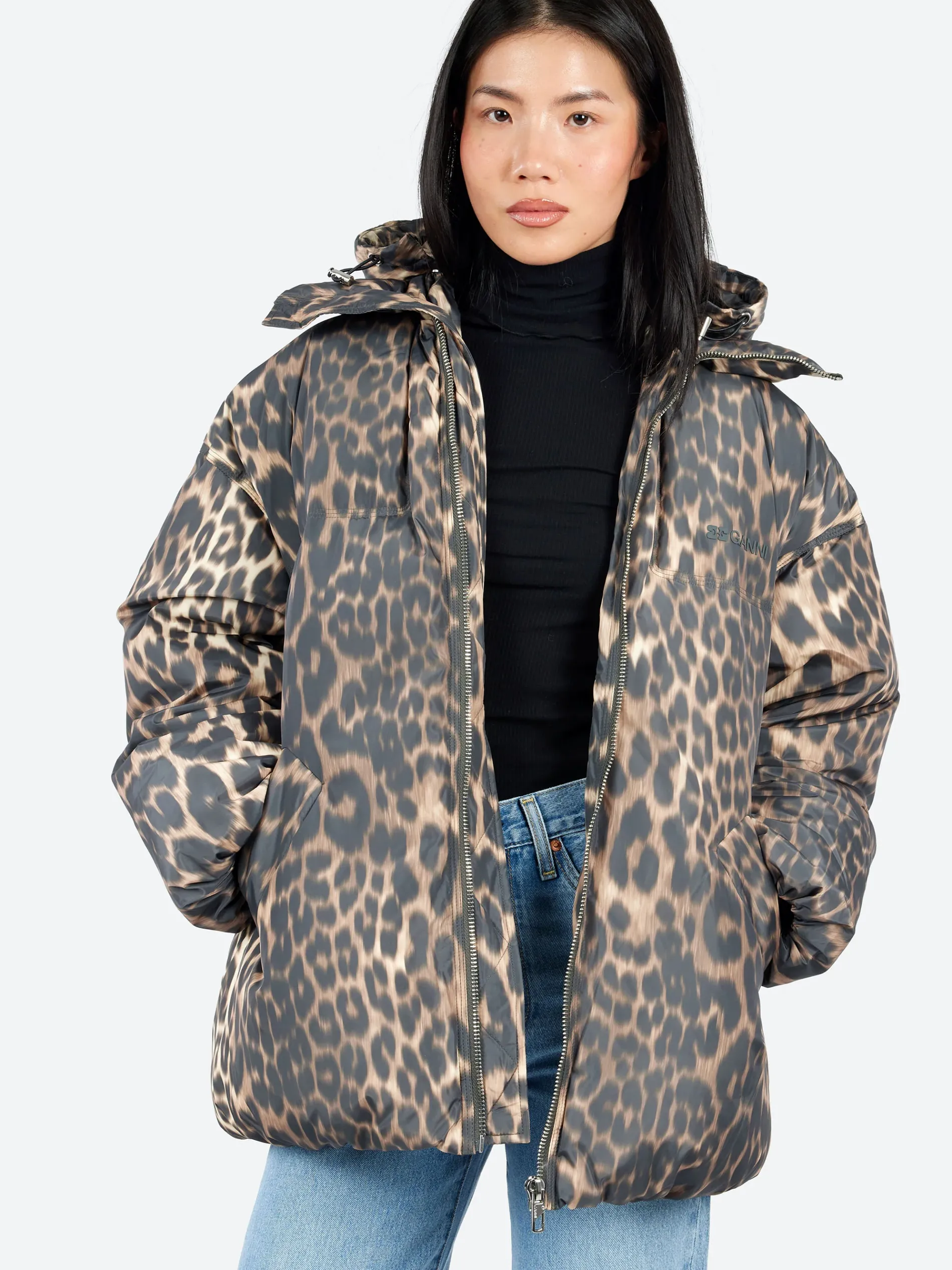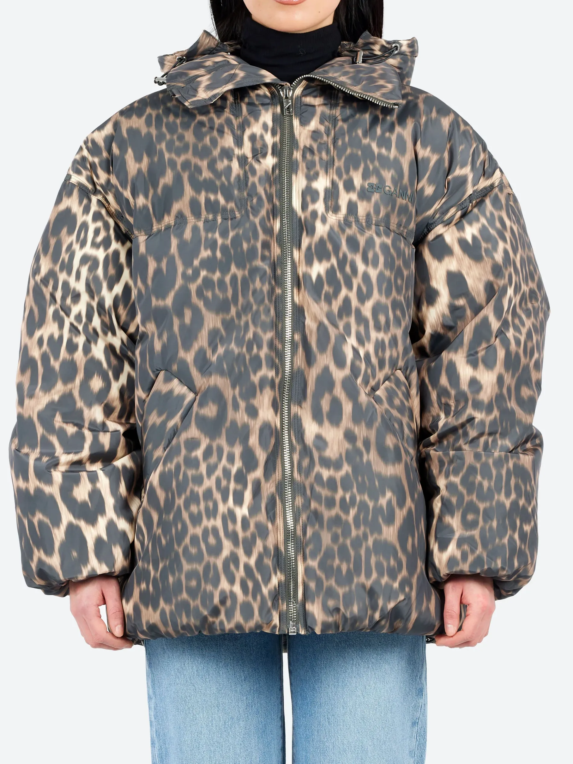 The GANNI Down Jacket blends style and practicality effortlessly. Featuring a distinctive leopard-inspired spotted pattern, it’s crafted from shiny, waterproof material, making it perfect for unpredictable weather. The oversized, boxy silhouette provides a trendy, modern fit, while the wide sleeves and spacious hood ensure comfort and freedom of movement. With a front zipper for added functionality, this jacket combines both fashion and utility, making it a standout piece for colder days.
