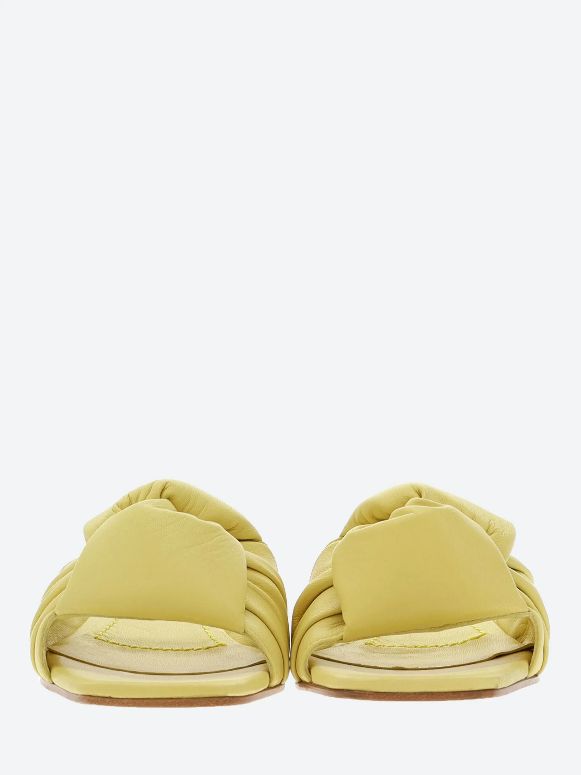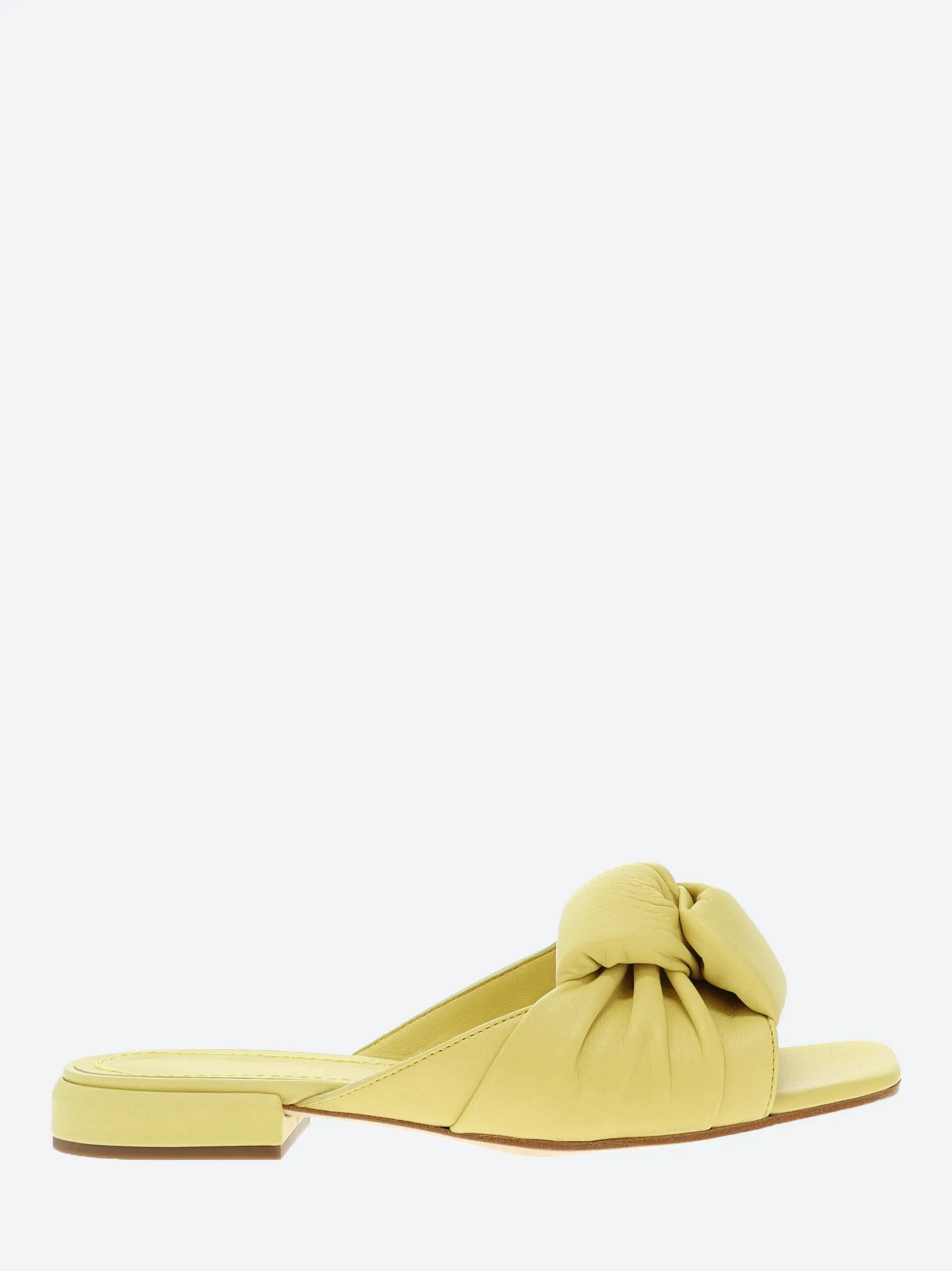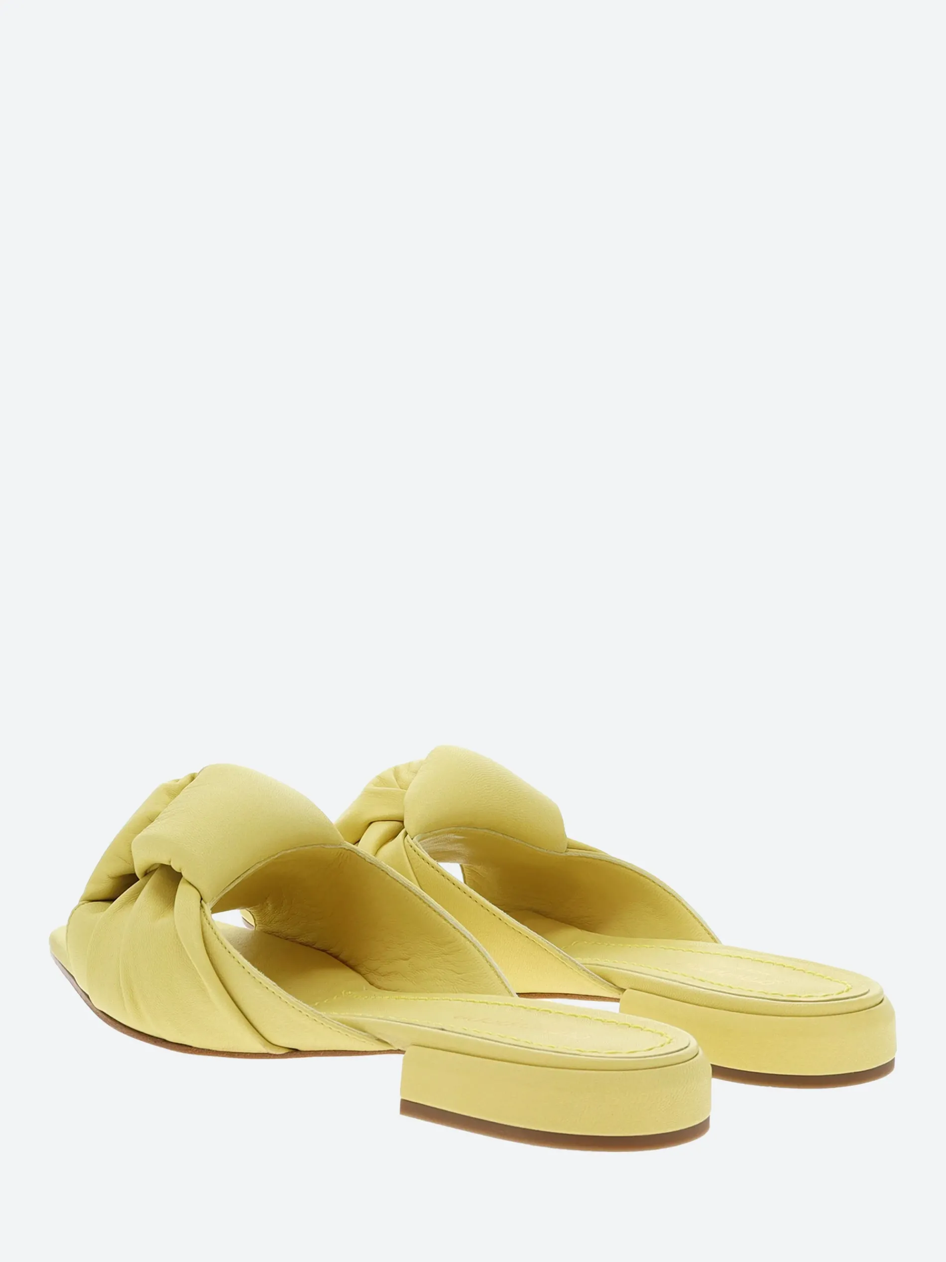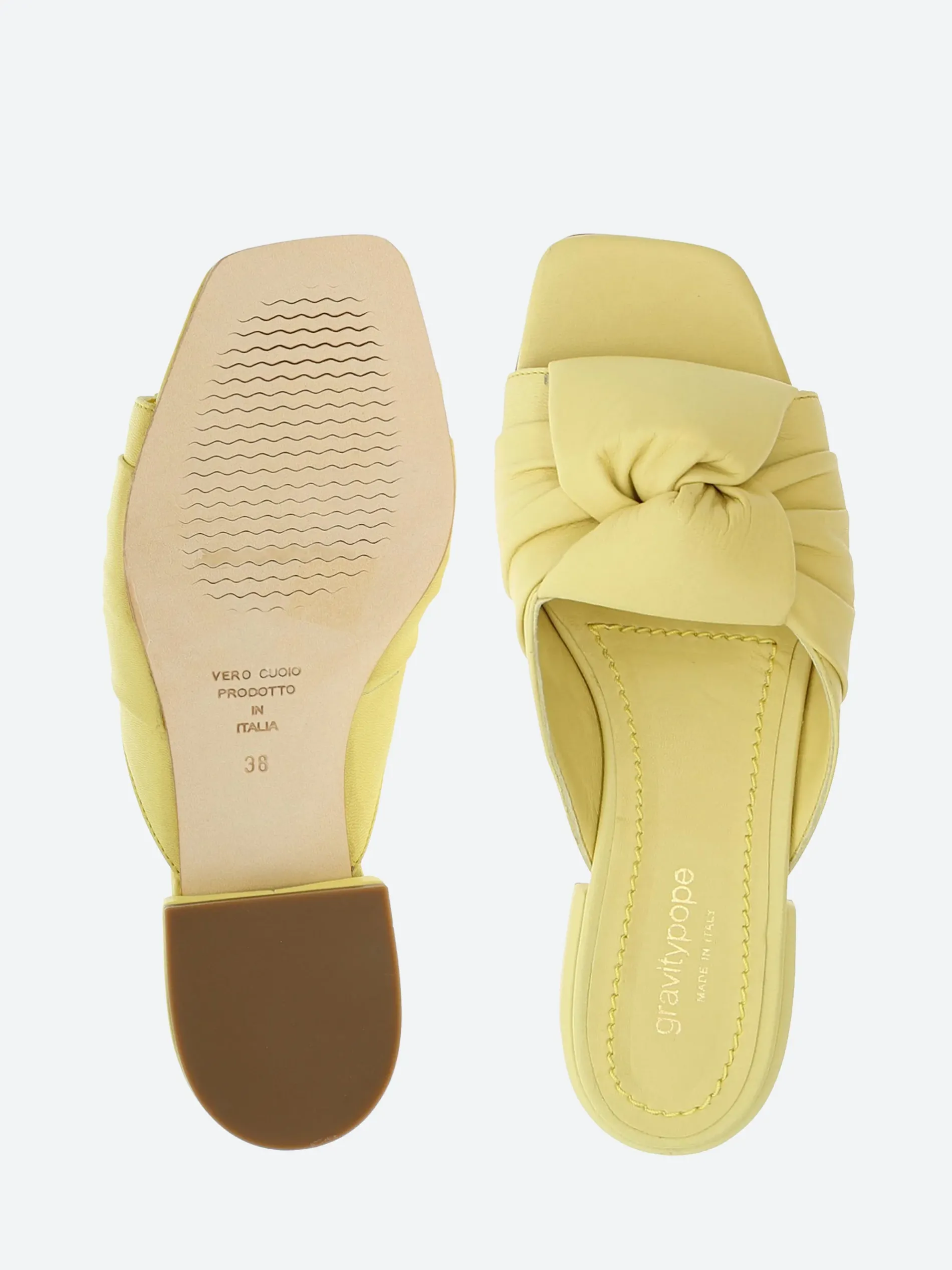 Luxe gravitypope leather slide sandals with a playful knot motif at the wide strap. A supportive, contoured footbed sitting on a very slight heel.