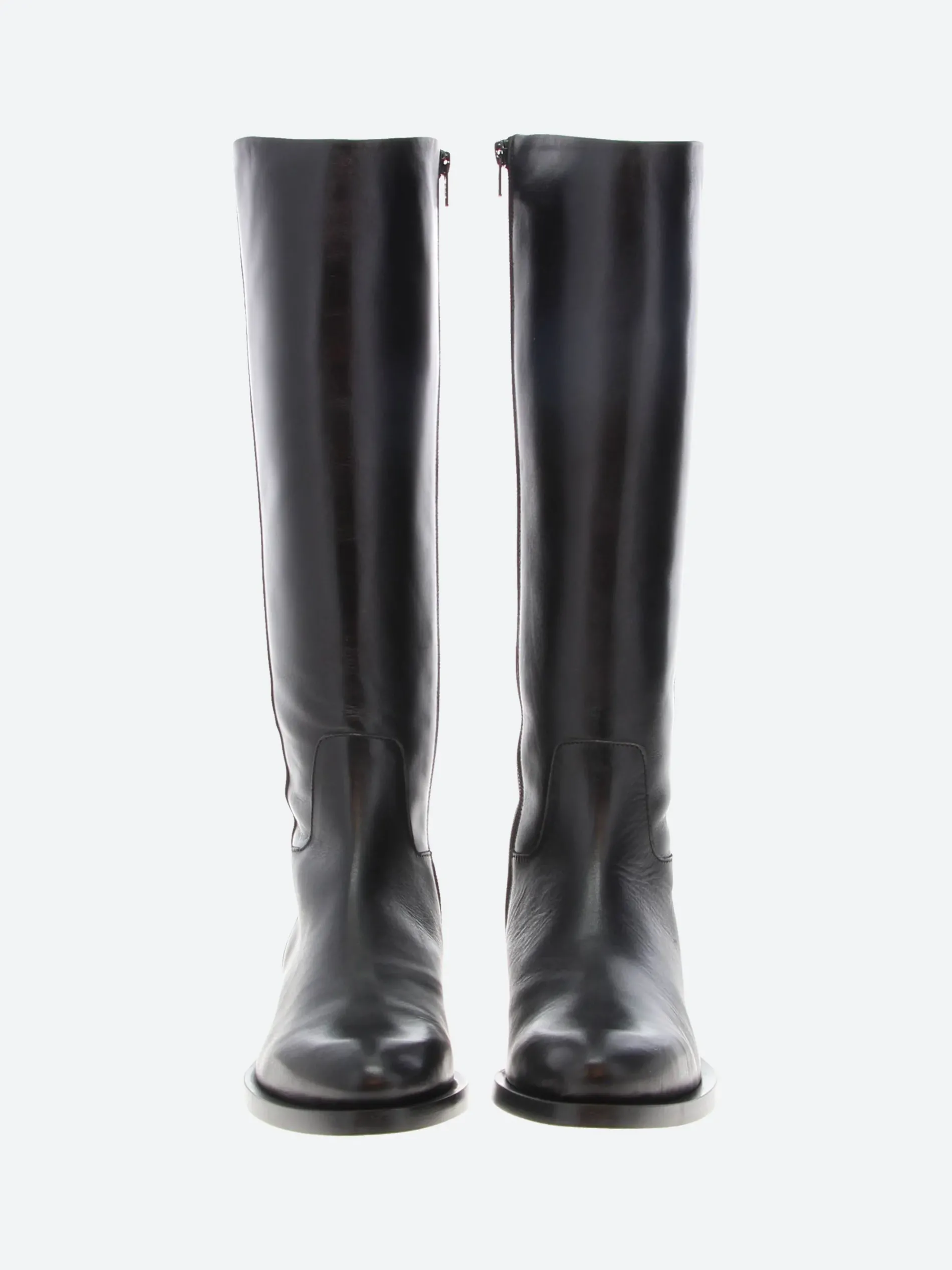 gravitypope sleek black riding boot offers the perfect blend of elegance and functionality. Made from high-quality Italian leather, the boot features a smooth, polished finish that’s both durable and comfortable. Its structured silhouette is designed to provide support and flexibility, with a sleek, knee-high design. The zip-up closure ensures a snug, secure fit.