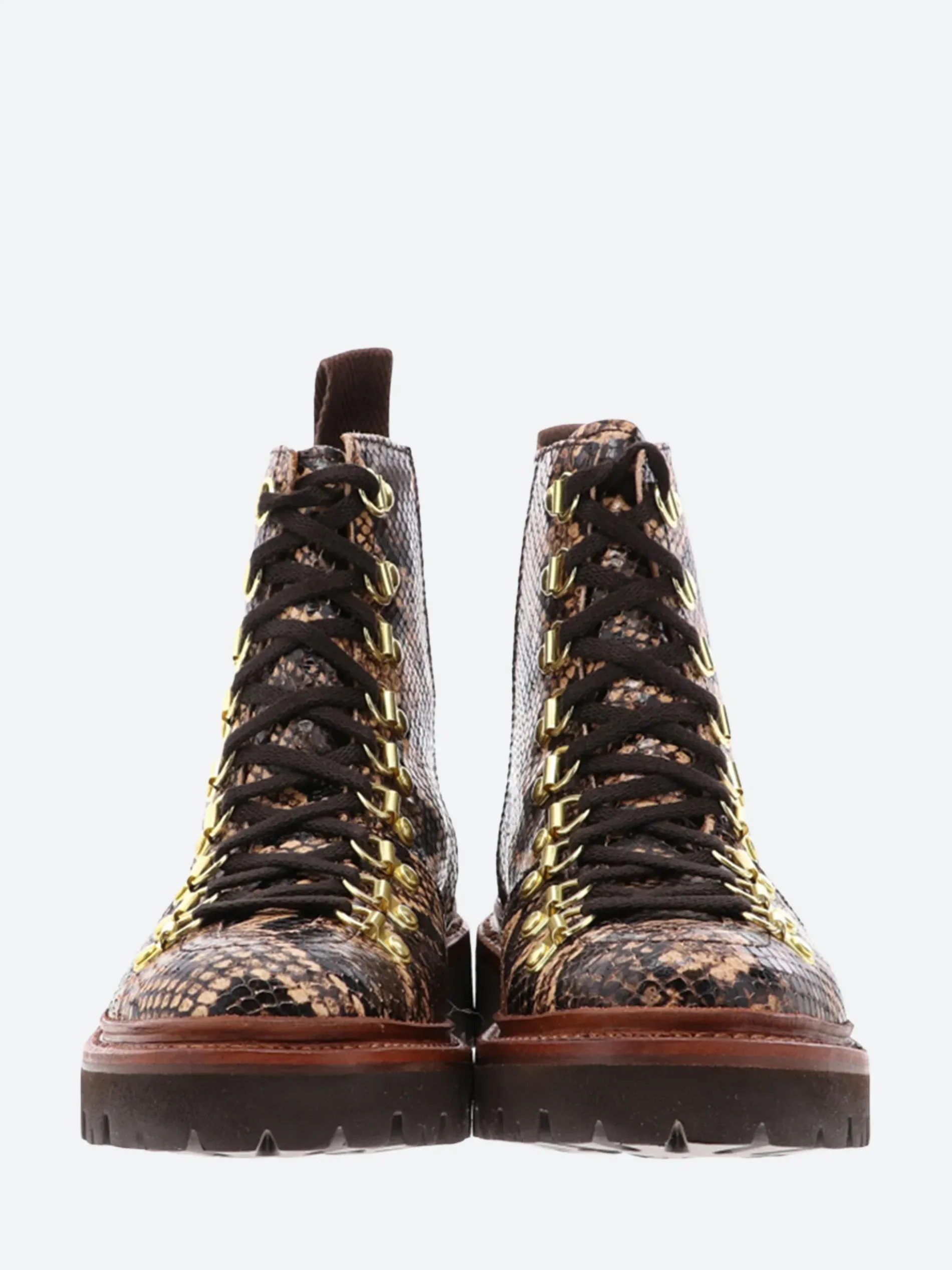 Grenson Nanette hiking boot with feature crossover lacing and a super lightweight Commando sole. Crafted from snake print leather with shiny brass eyelet loops with a natural welt and a brown sole that matches the dark tones of the snake print.