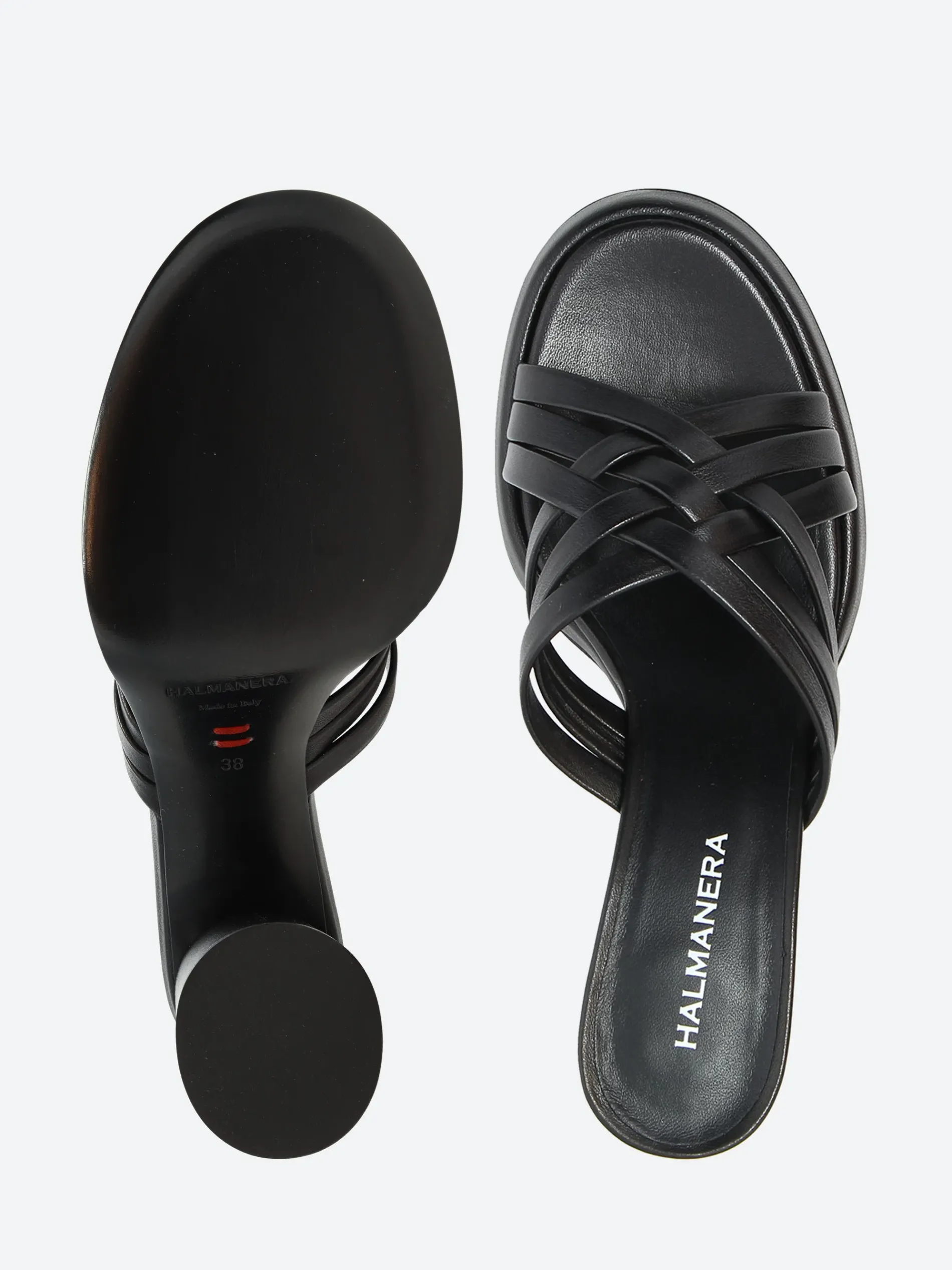 Crafted with woven leather straps, this versatile slide features a tubular wrapped heel for an elevated look.