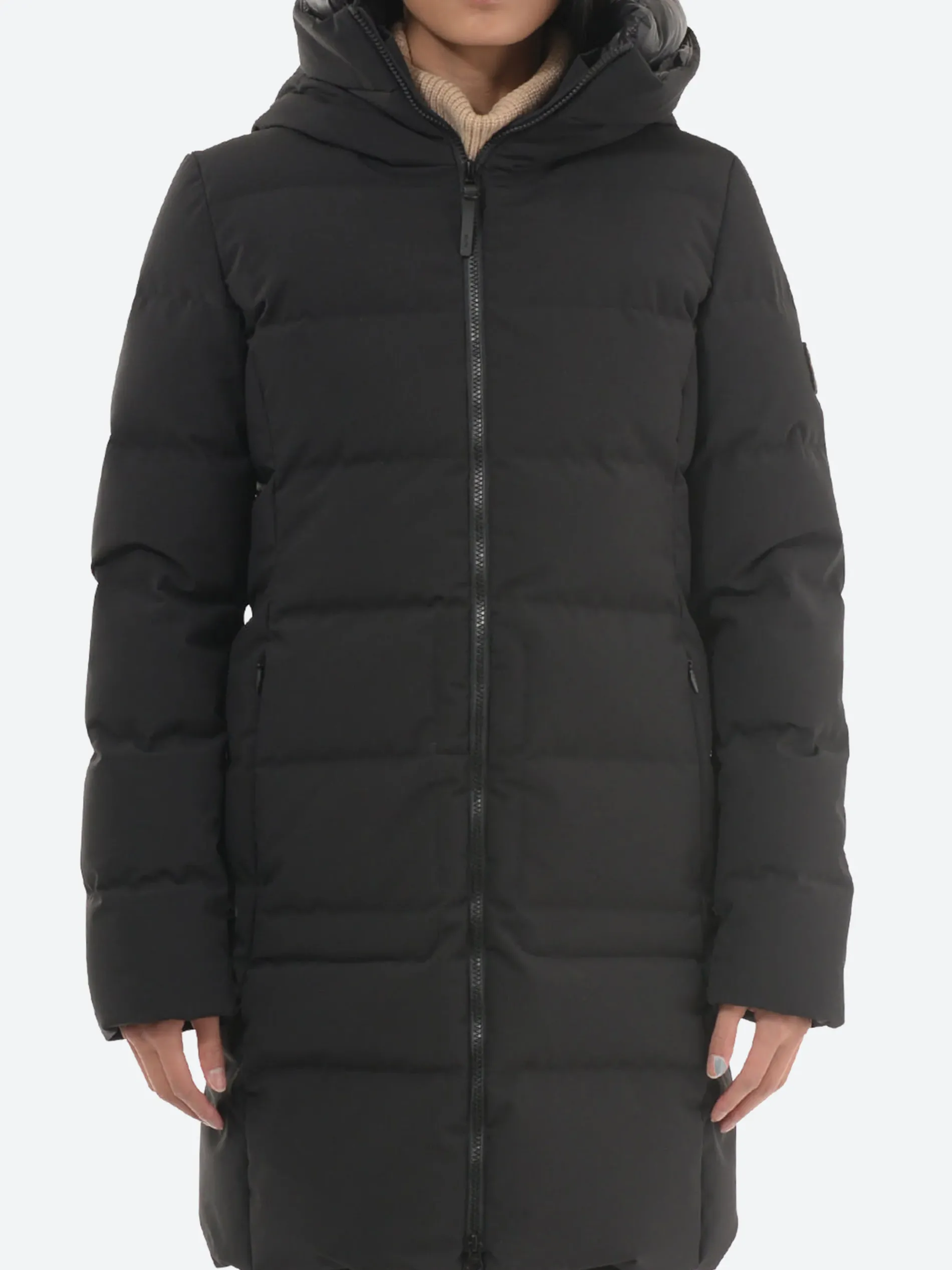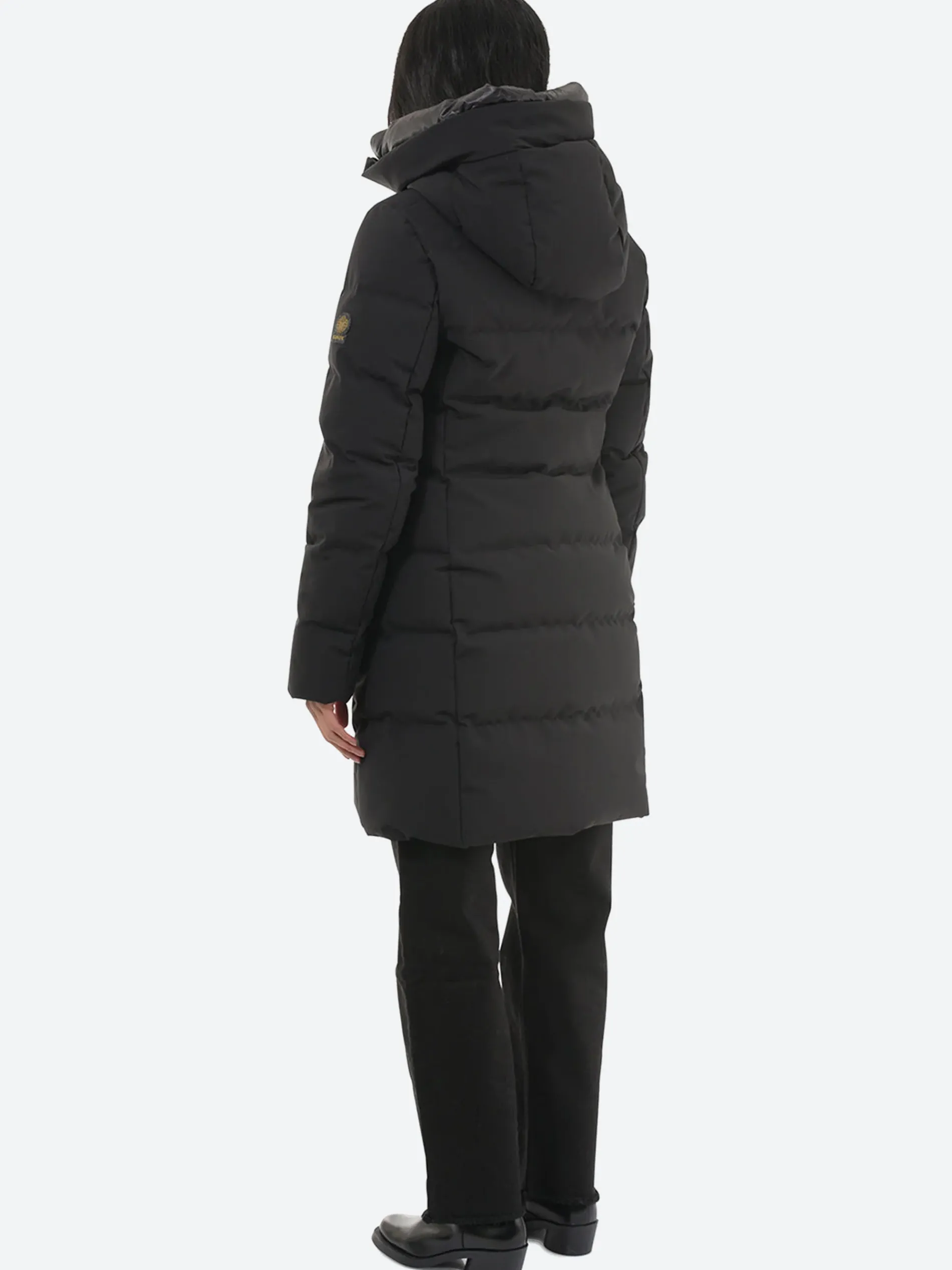 The sleek profile gives it city chic and the superb warmth and comfort of the 800-fill Canadian Hutterite White Duck insulation keep the elements at bay. The mini-ottoman exterior shell and the snug attached hood step up to inclement weather in style.
