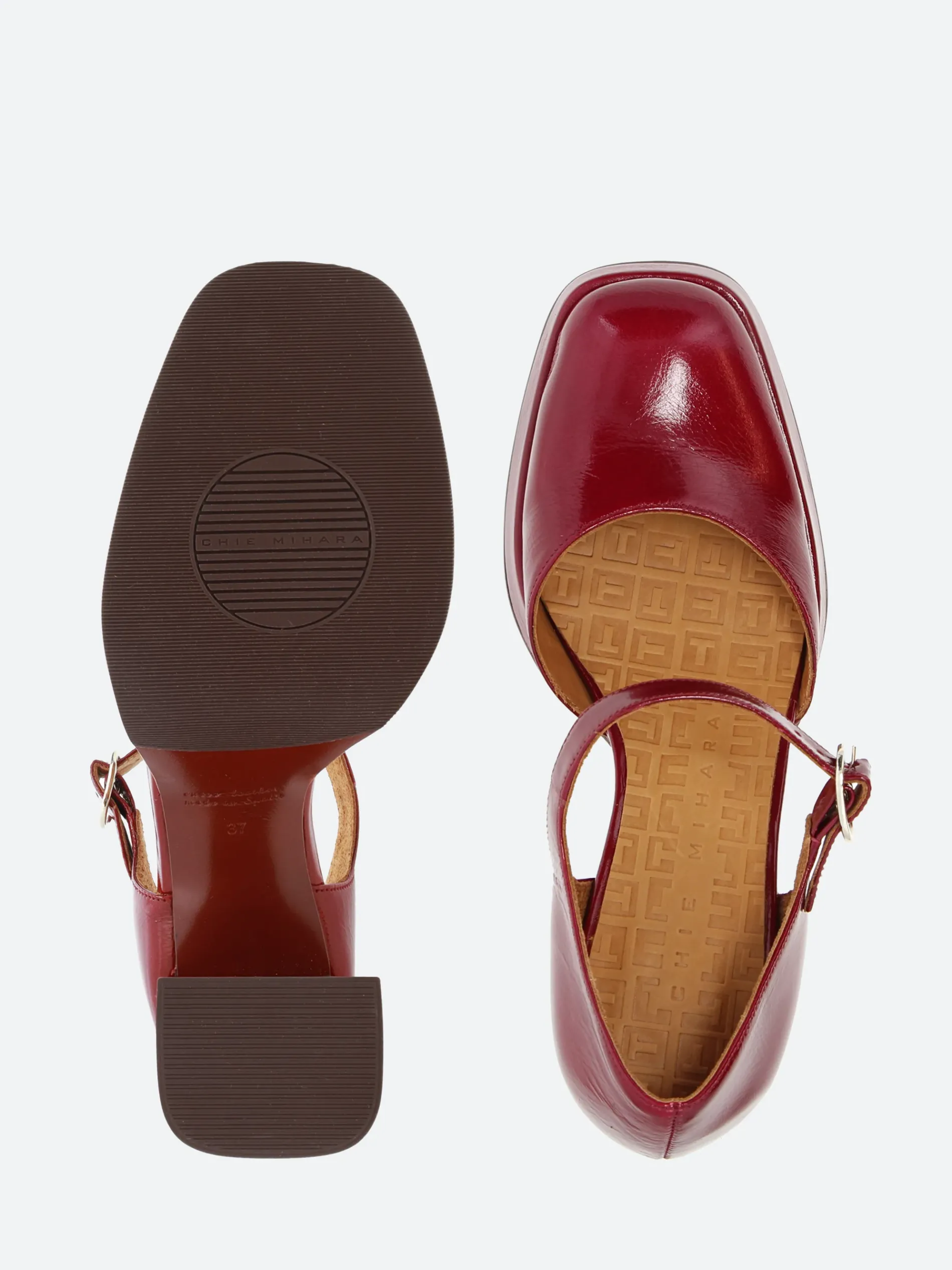 Chie Mihara Kento, an ankle strapped sandal with a soft leather upper, sitting on a high, stacked heel.