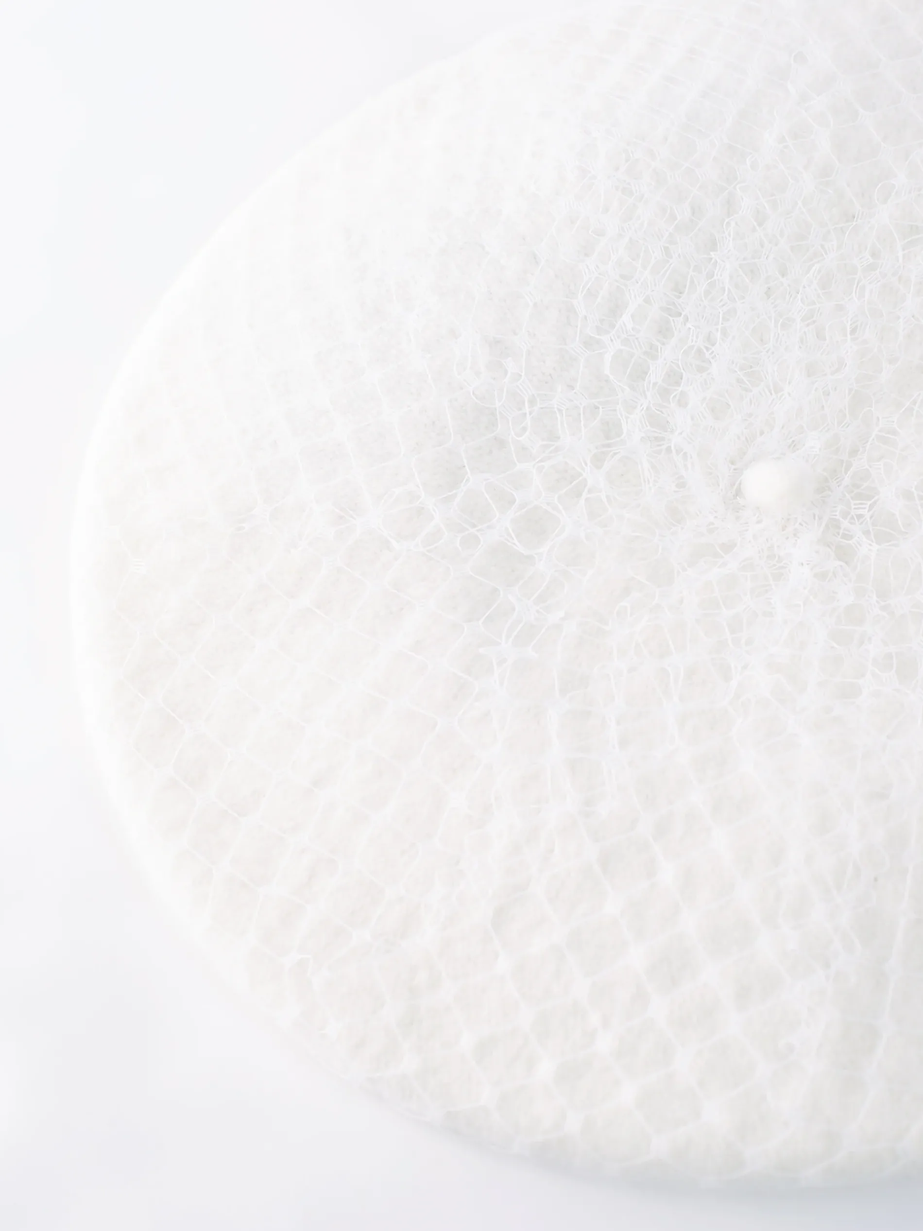 Small stylish classical beret with vintage cotton veiling, reminiscent of the 1970’s.
