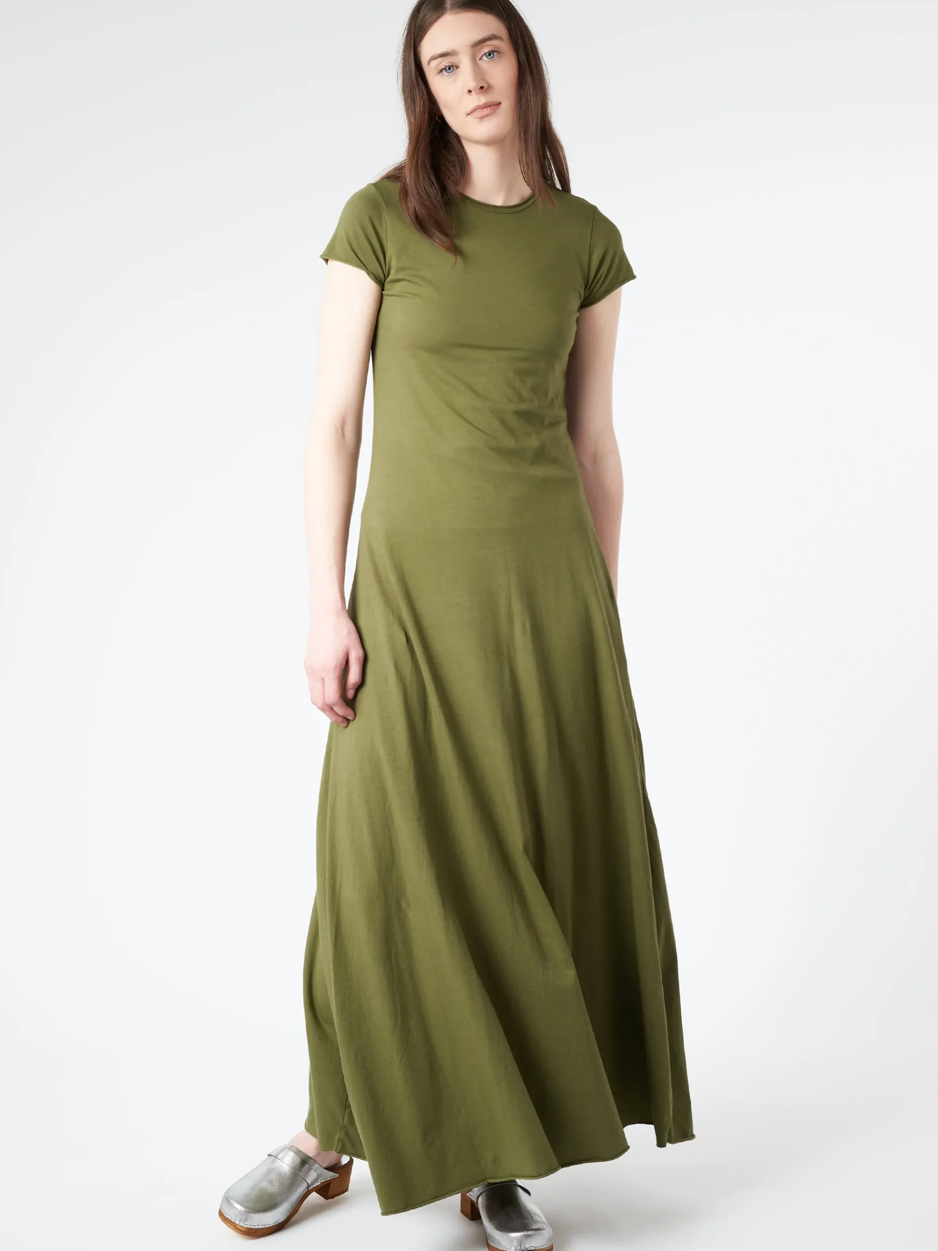 This stretch cotton jersey A-line dress features short cap sleeves and a flattering flared silhouette.