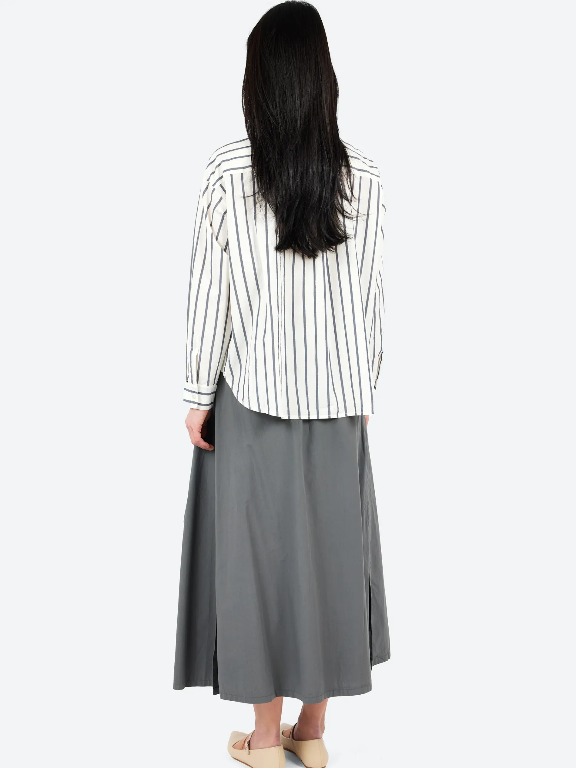 The Labo.Art Eolia Shirt is a classic button-up long-sleeve shirt, featuring shirring at the back yoke for a subtle, feminine touch. The shirt is designed in vertically striped woven cotton crepe, over-dyed for a unique, rich color. This iconic piece combines timeless style with modern details, making it a versatile addition to any wardrobe.