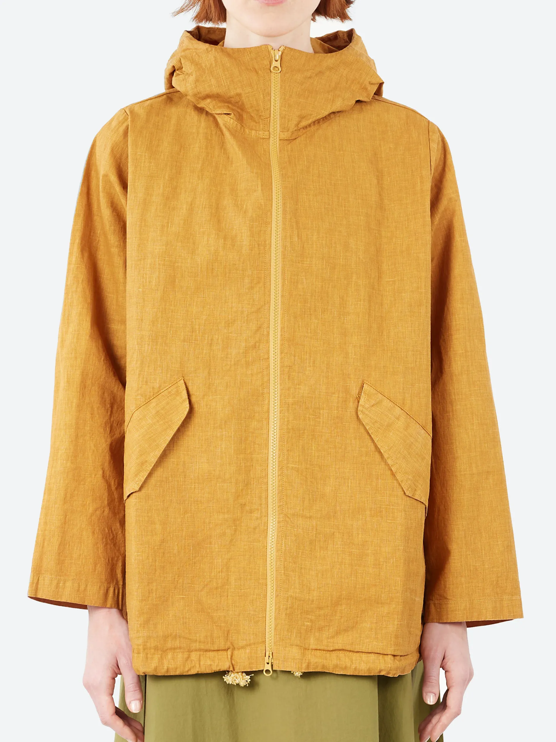The Labo.Art Ada hooded jacket features a zip closure, two side pockets for convenience, and a gathered drawstring at the bottom, allowing for a customizable fit and added style. Made from polyurethane-coated linen this jacket provides a sleek, water-repellent finish, making it perfect for unpredictable weather. Its minimalistic yet functional design ensures both comfort and versatility for everyday wear.