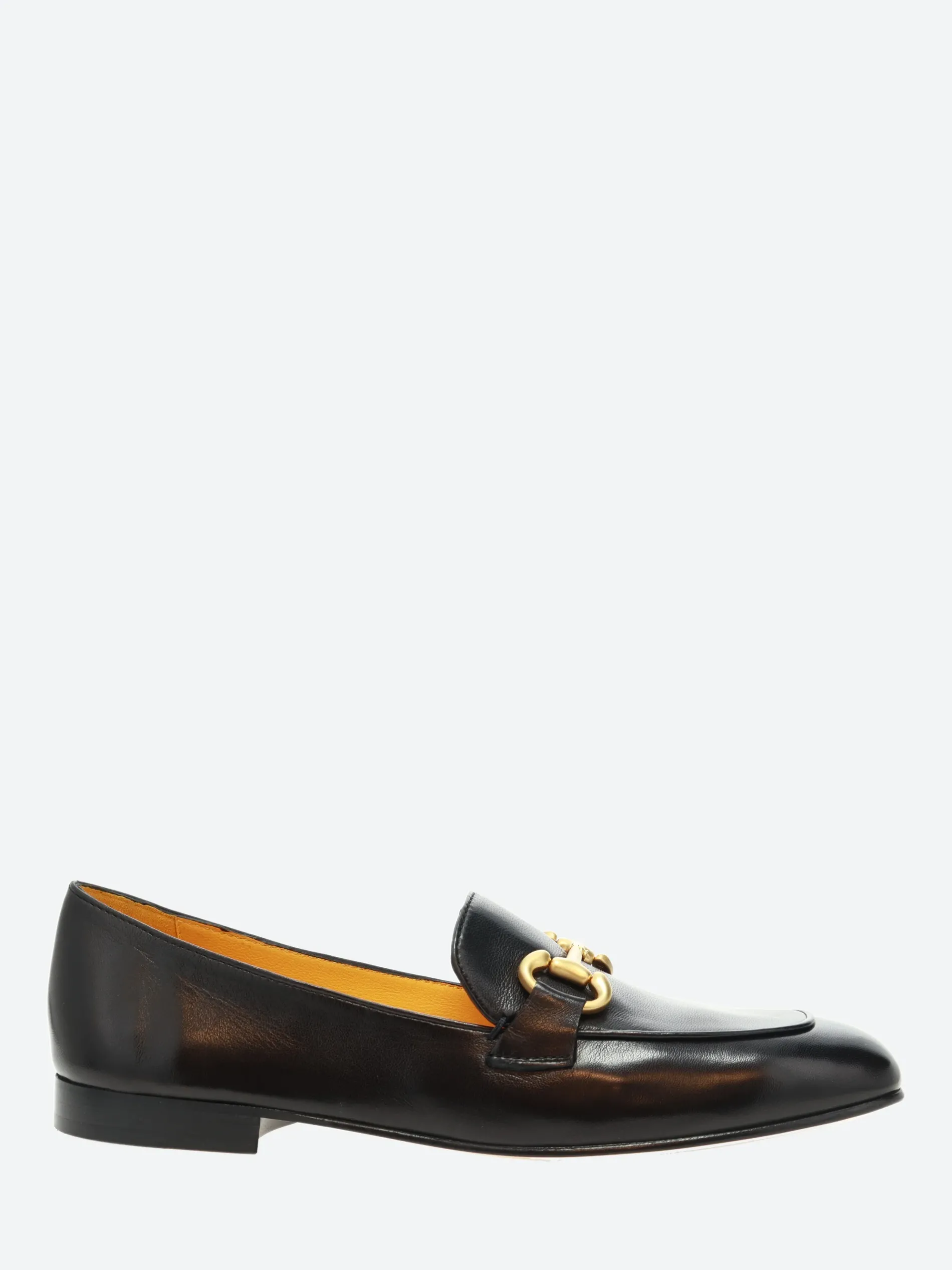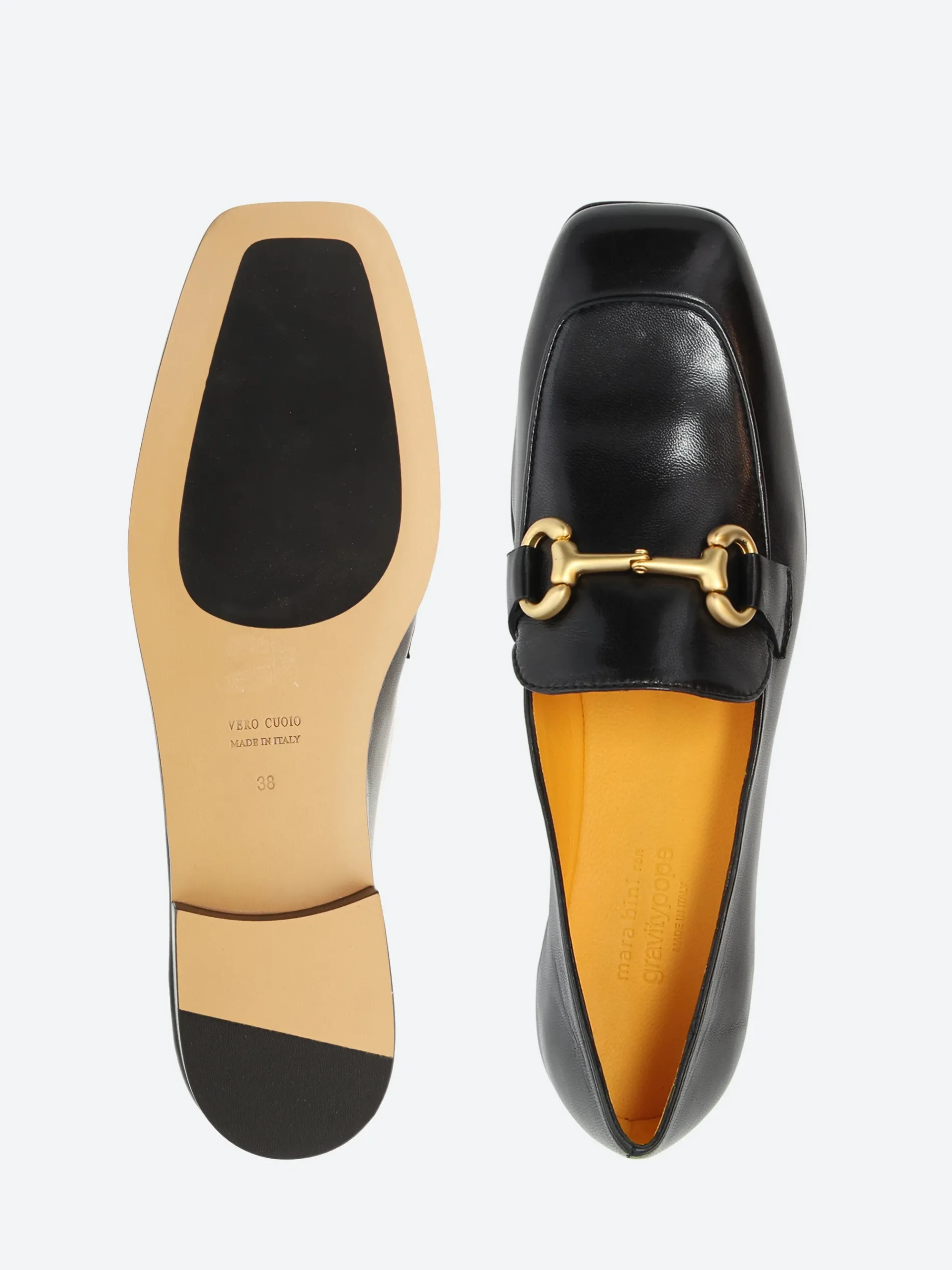 This contemporary loafer is made of smooth leather, with elegant additions of a gold-tone horse bit and a square toe.