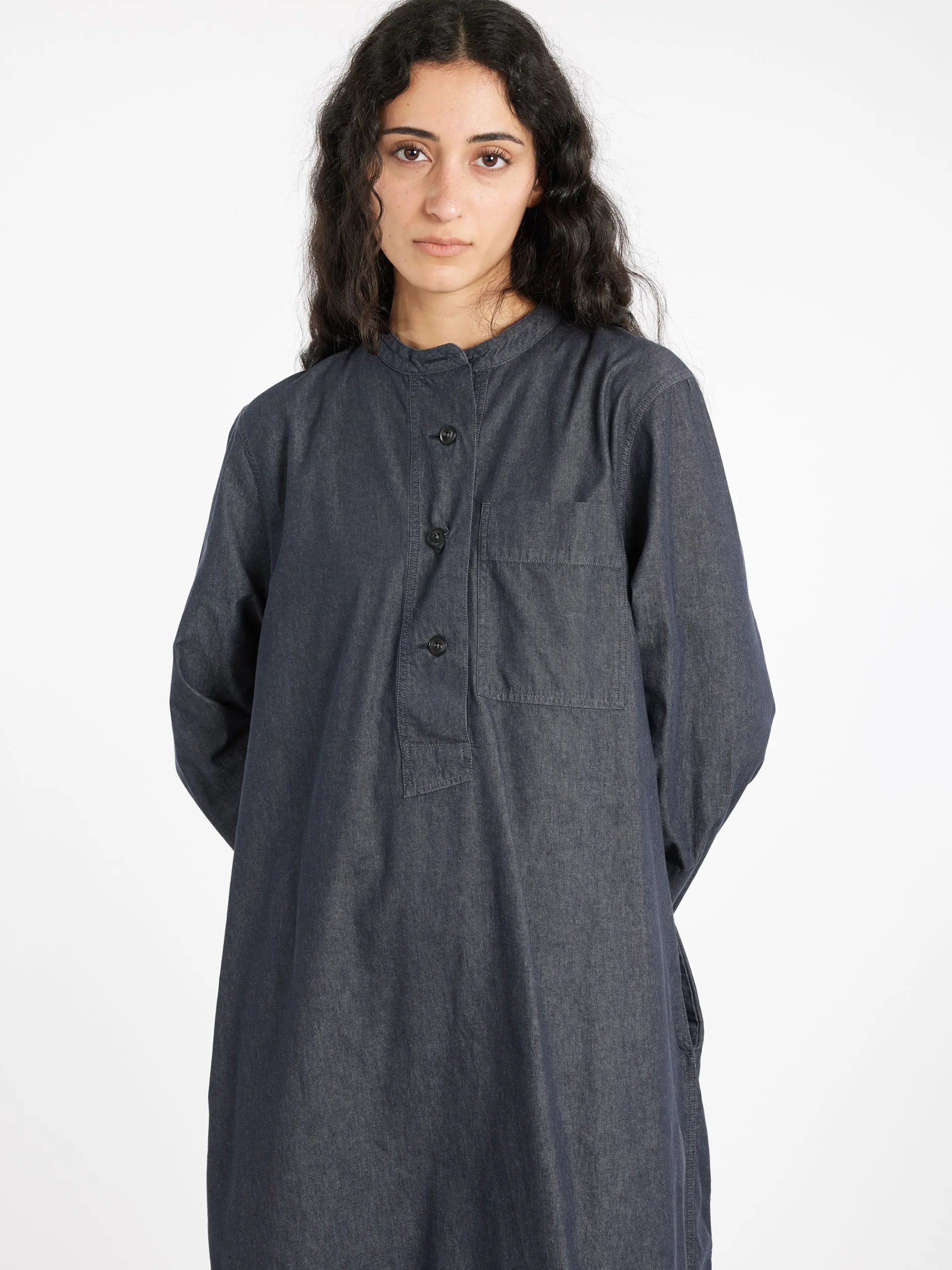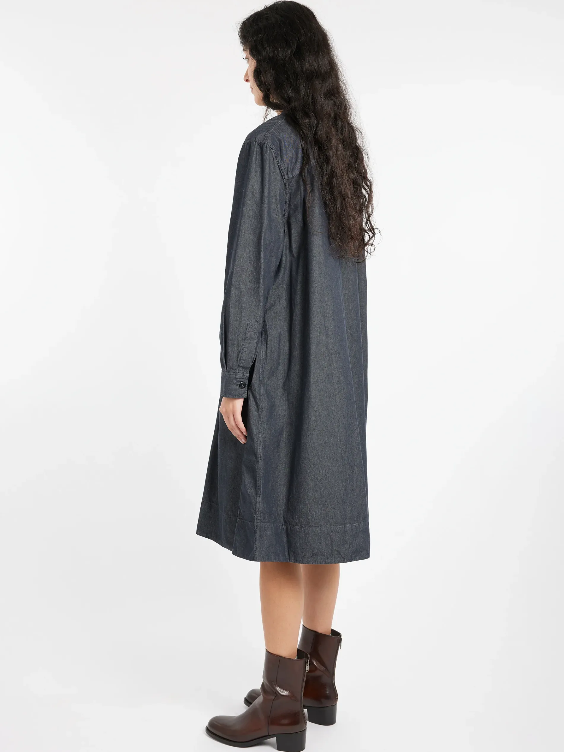 Margaret Howell collarless swing dress in a regular cut. Fabricated in Italian cotton chambray.