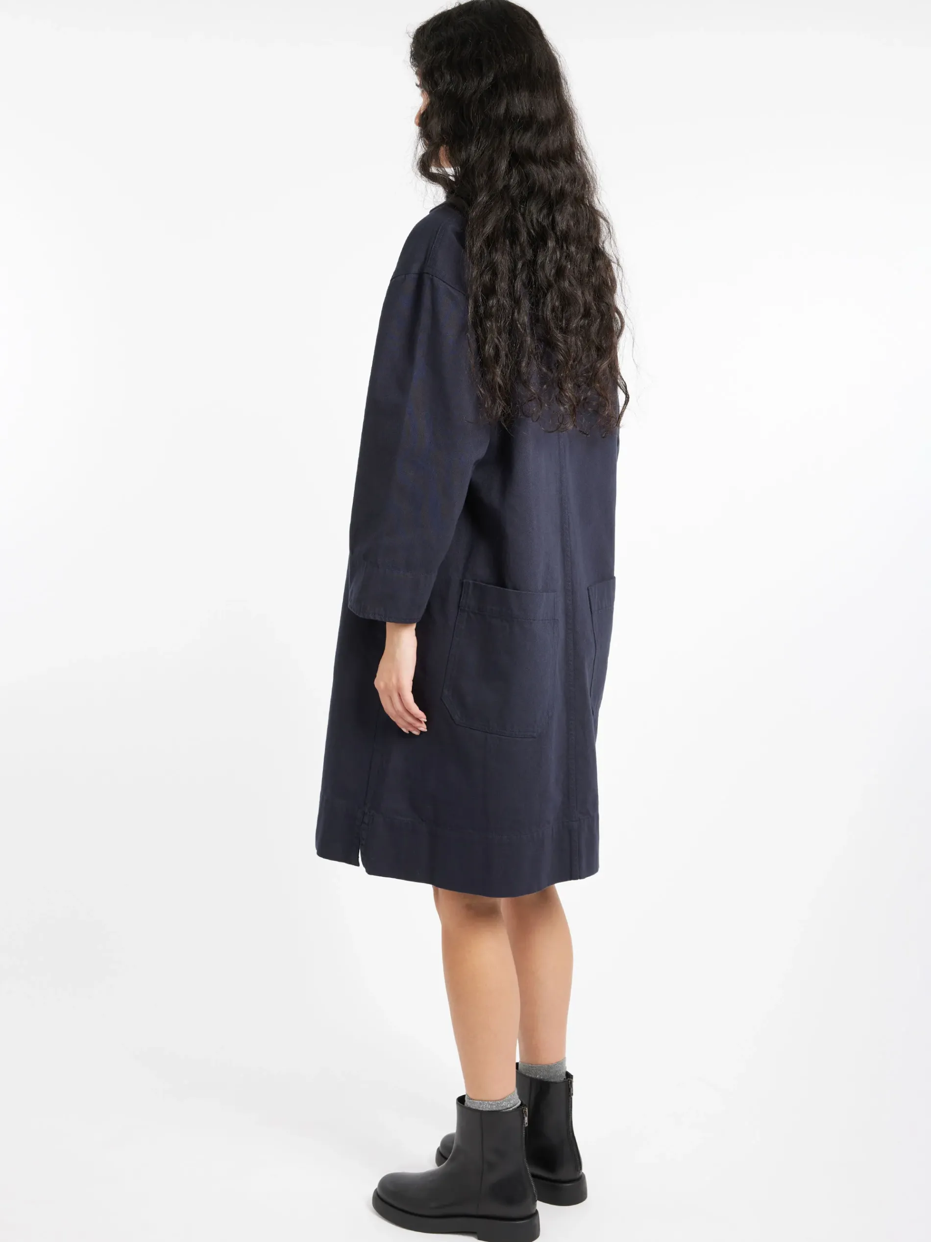 Margaret Howell cotton drill patch pocket smock dress with a relaxed cut. Fabricated in dense Italian cotton drill.