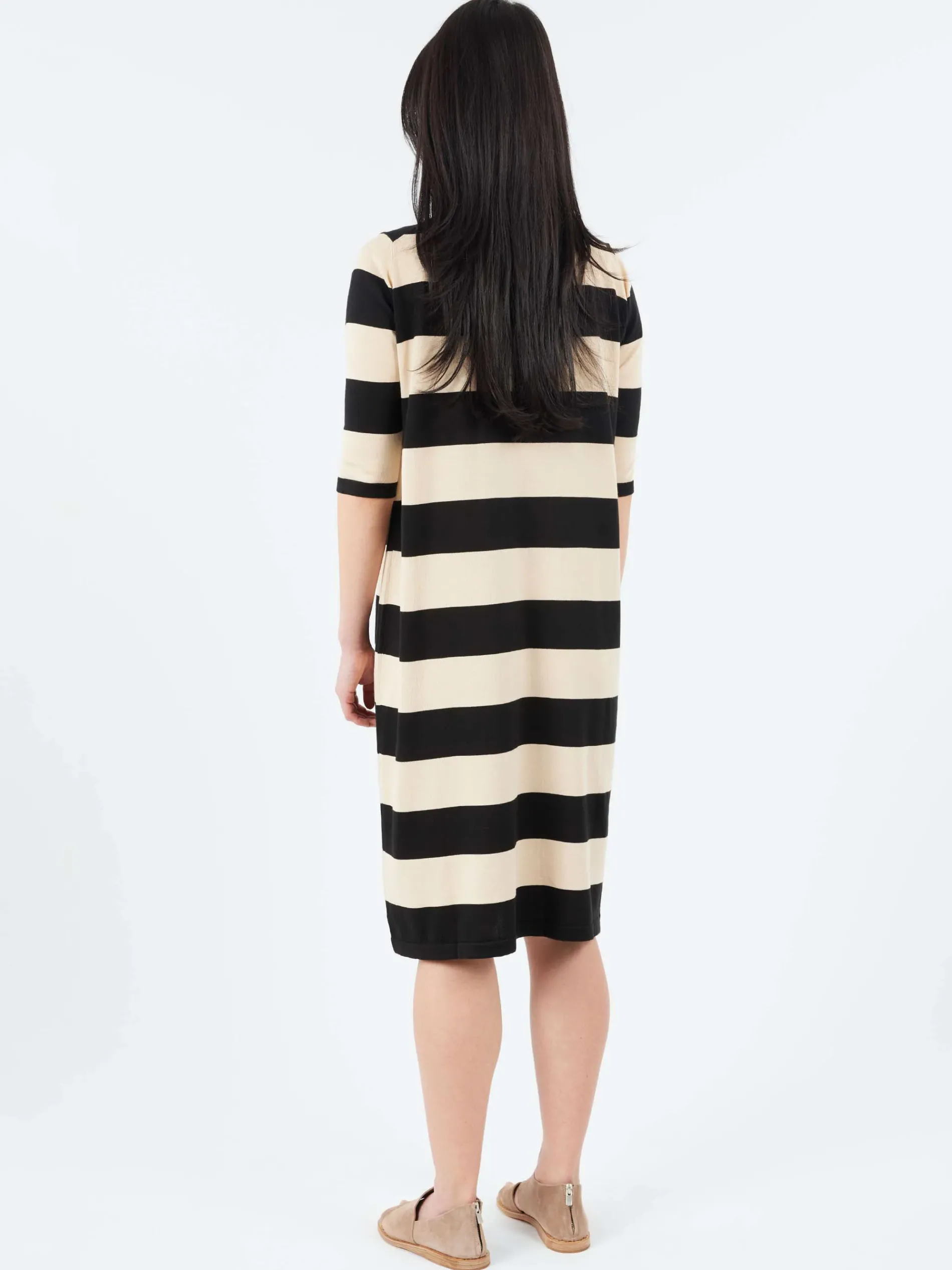 The MJ Watson Pima Cotton Stripe Knit Dress is a refined, lightweight pullover dress crafted in Italy from 100% cotton. Designed for effortless elegance, it features a round neckline and elbow-length sleeves, making it ideal for warm-weather layering or solo wear.