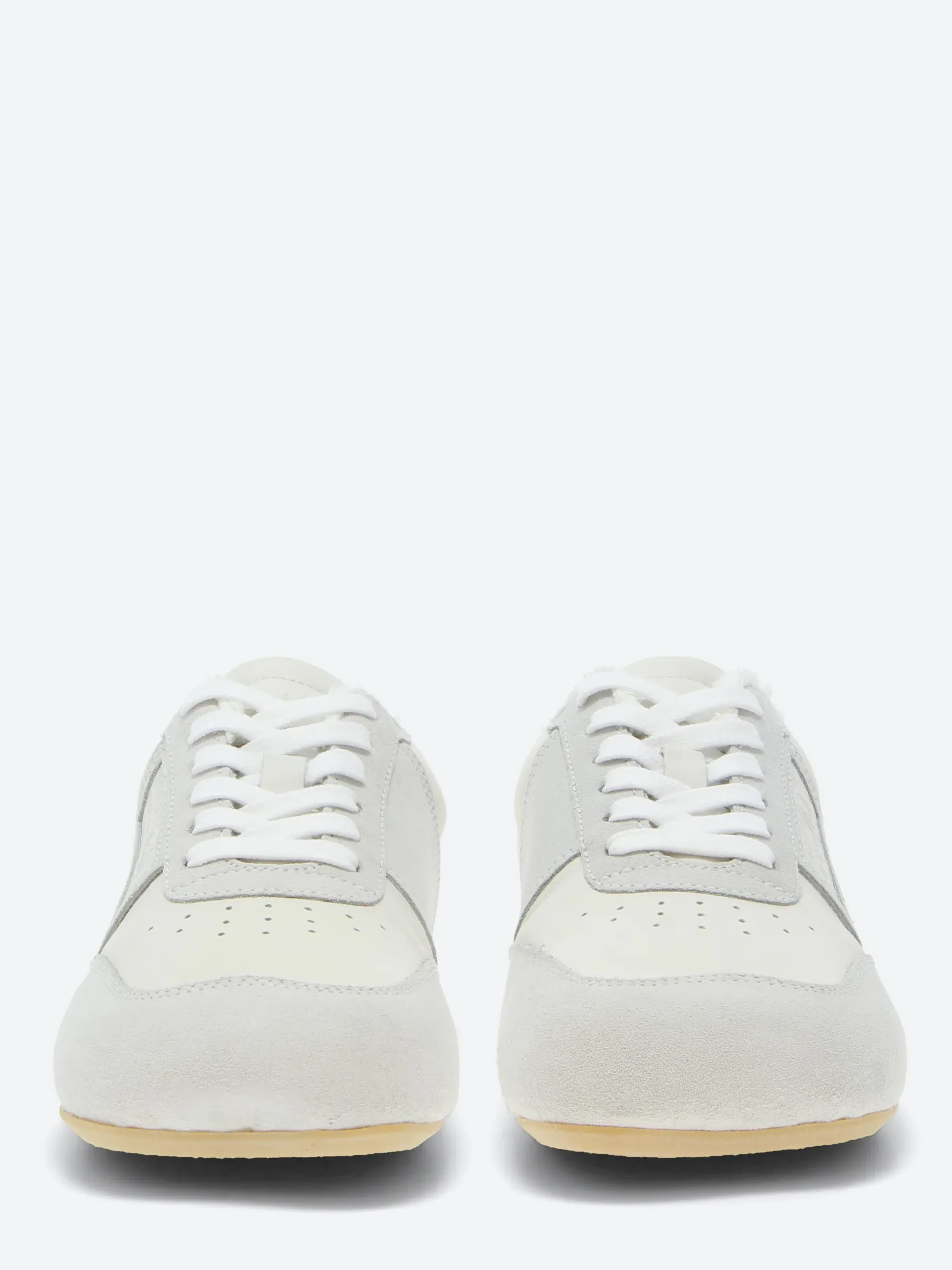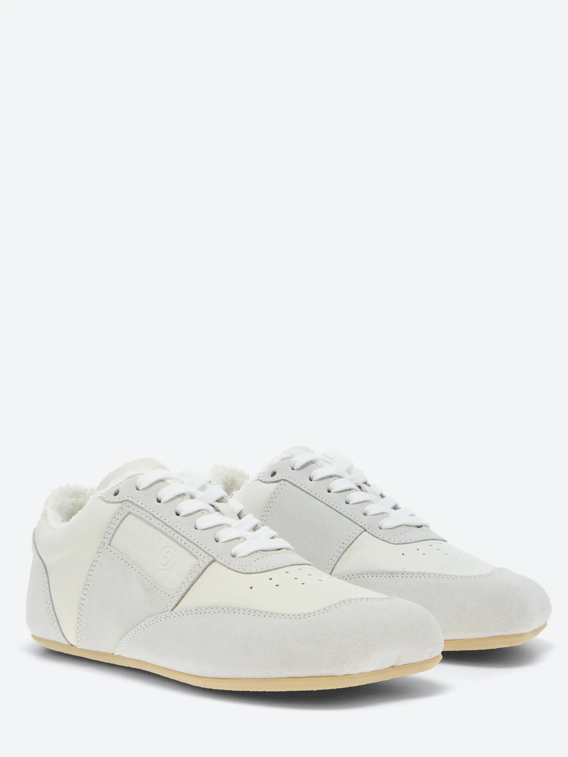 In a muted white palette, these sneakers refine everyday wear through a slim sole and an anatomic toe shape. The numeric signature at the side and signature white stitch line at the back encapsulate MM6’s subdued yet distinct language – an essential form distilled to its defining elements.