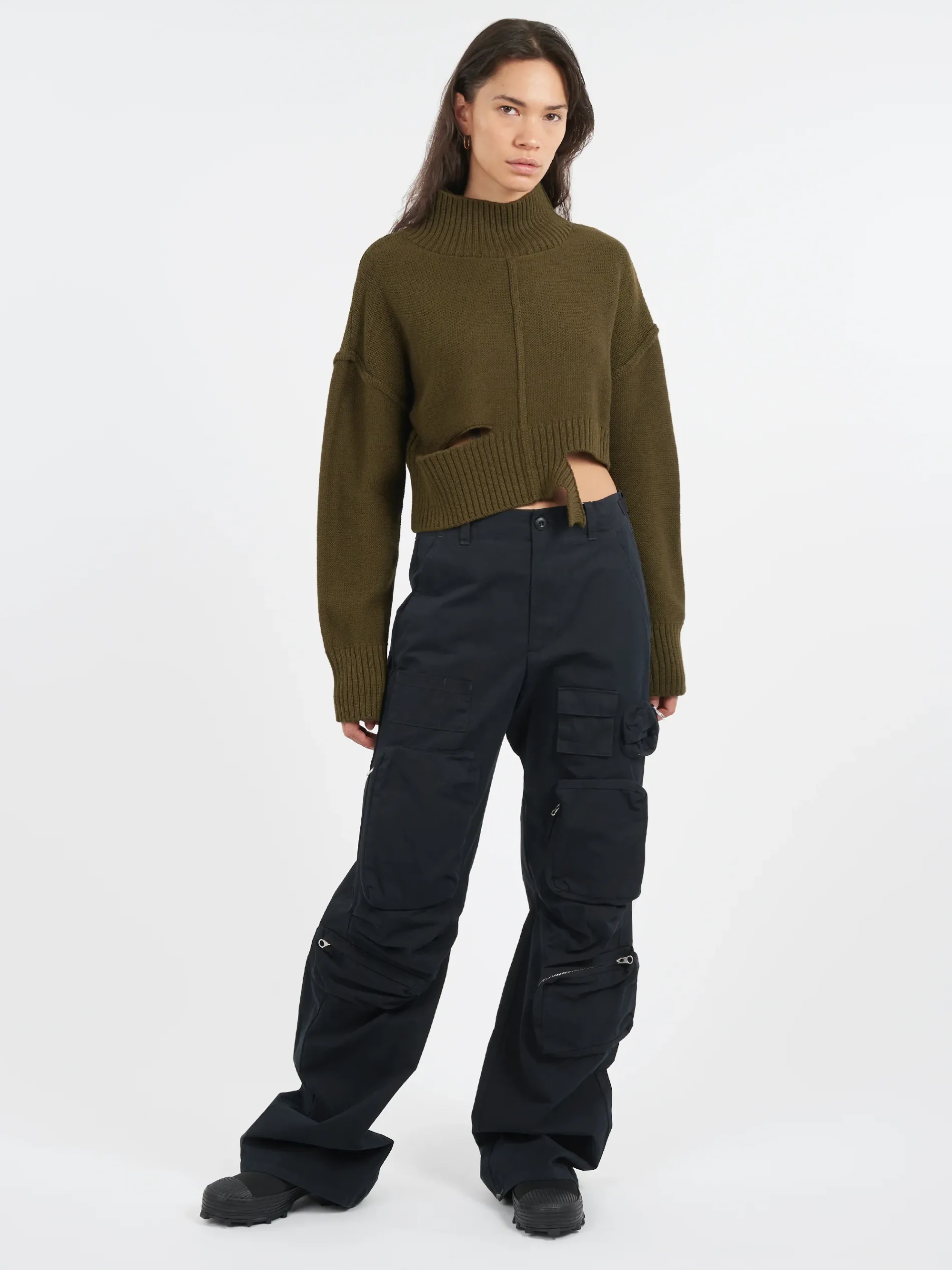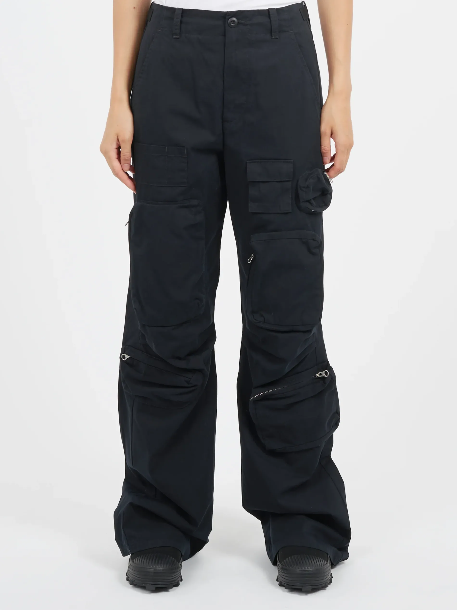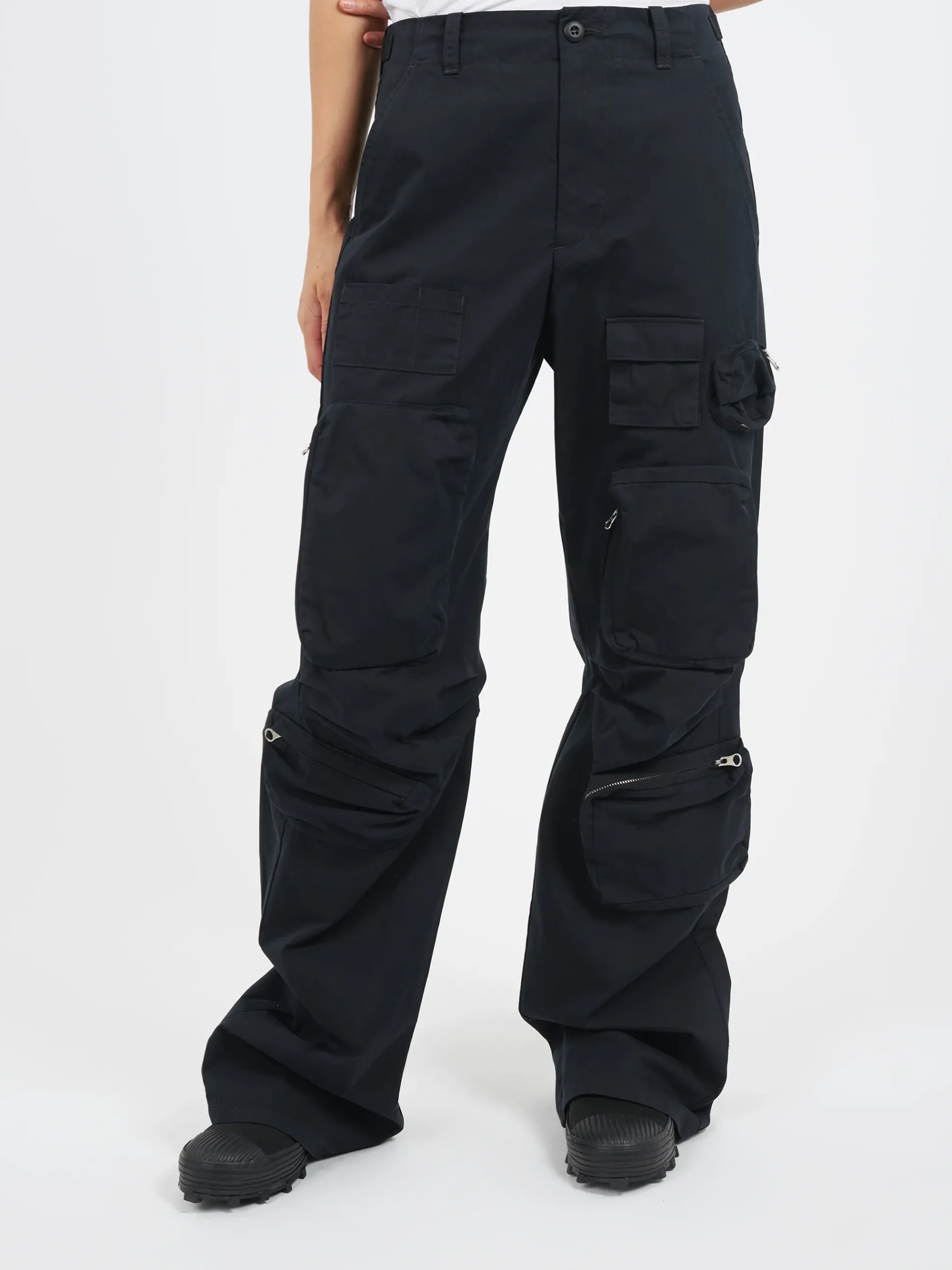Relaxed-fit straight leg cargo pants in black. Signature white stitching at back waist.