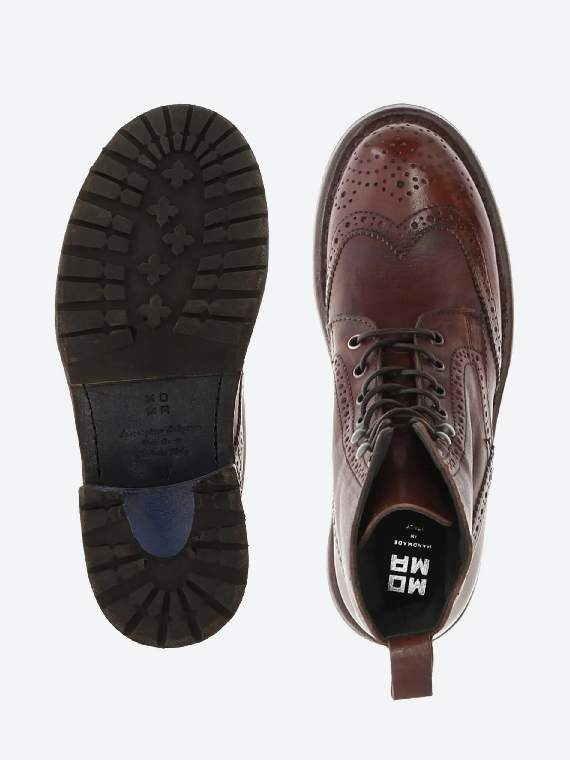Moma lace-up boot in vintage effect leather with a perforated detail throughout and an inside zip closure for easy on and off. Handmade in Italy with a non-slip rubber insert.
