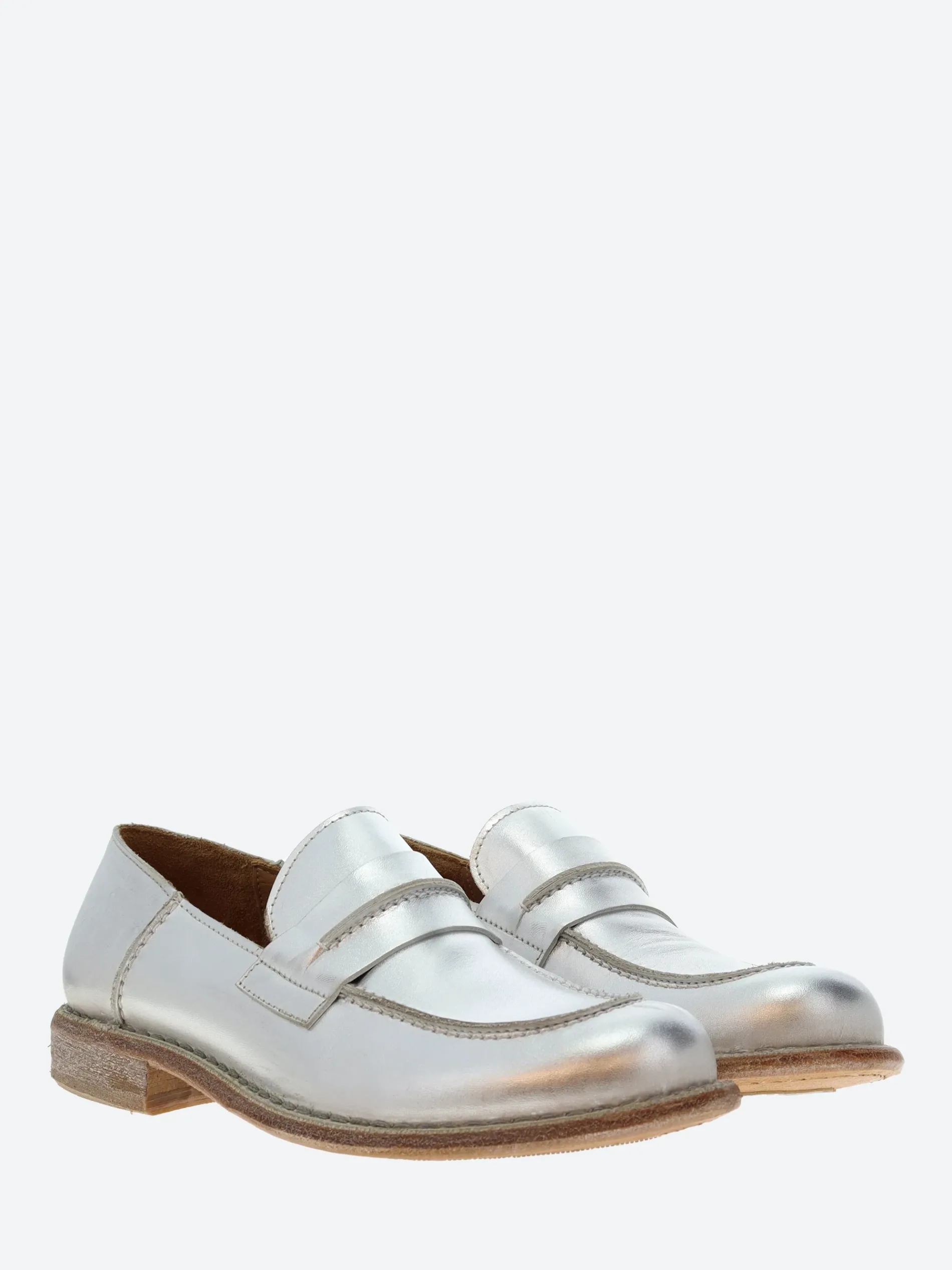 A classic penny loafer with a metallic finish, set on a slight heel.