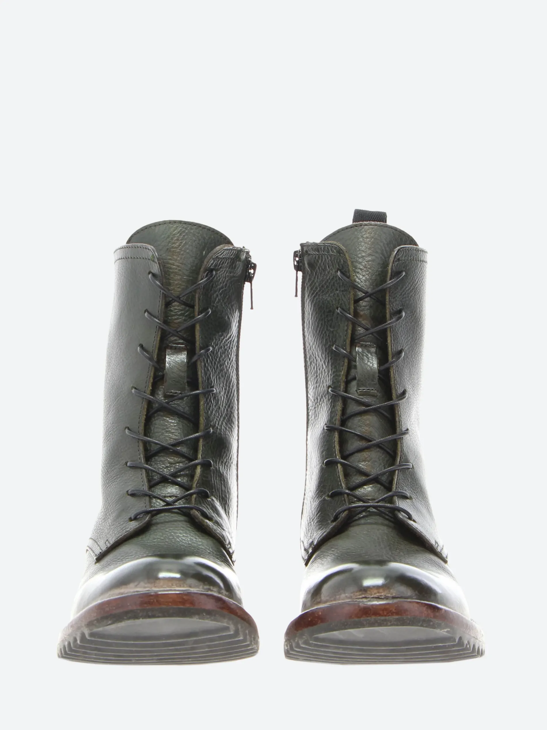 These combat boots are made using a green vintage-effect leather, finished with a toothed rubber outsole.