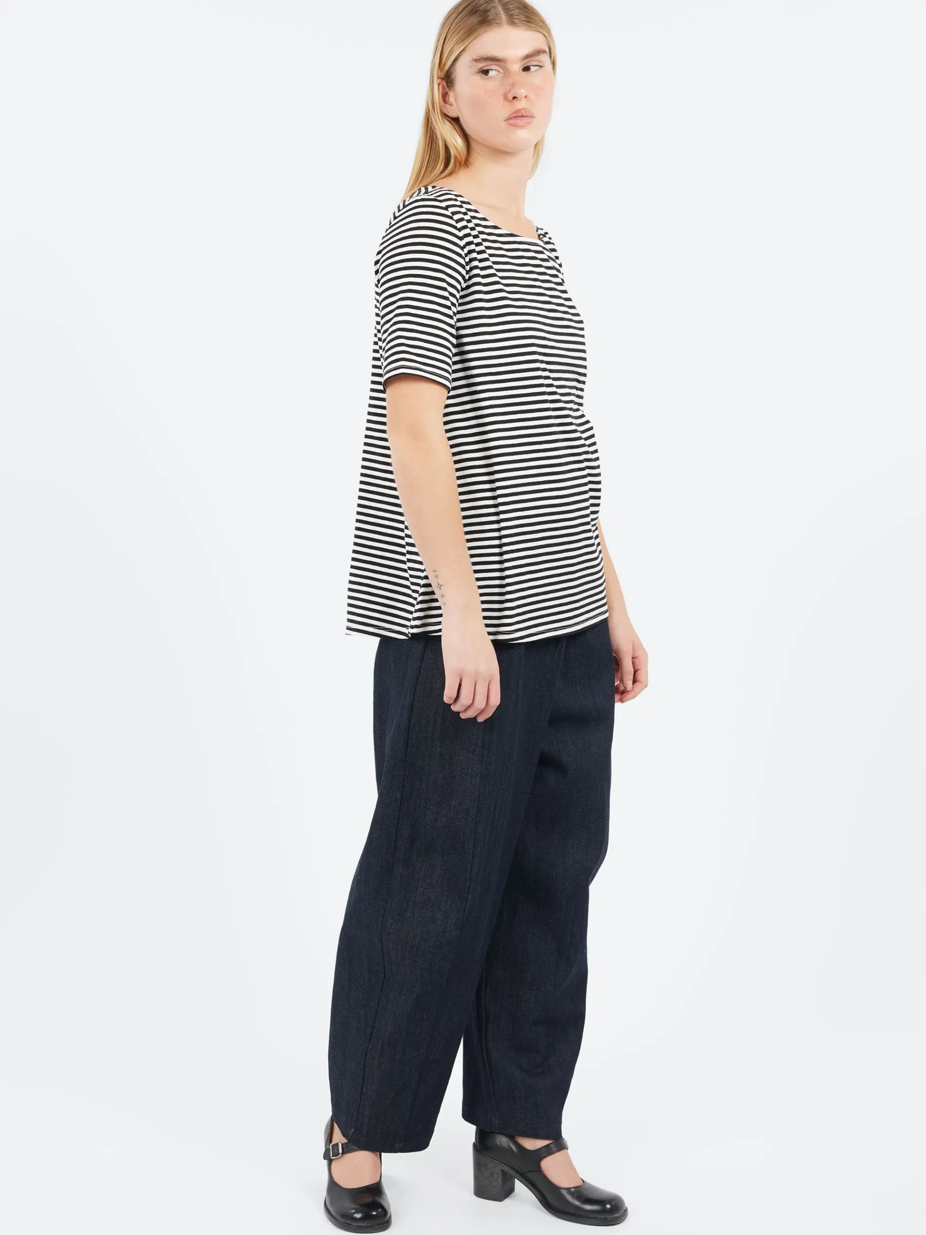 A basic t-shirt with a striped pattern and an A-line silhouette. Featuring a round neckline, short sleeves, and an easy fit, this piece embodies the relaxed essence of the Neirami silhouette. The wide, intentionally abundant lines are designed to enhance both comfort and dynamism, creating a stylish and effortless look.