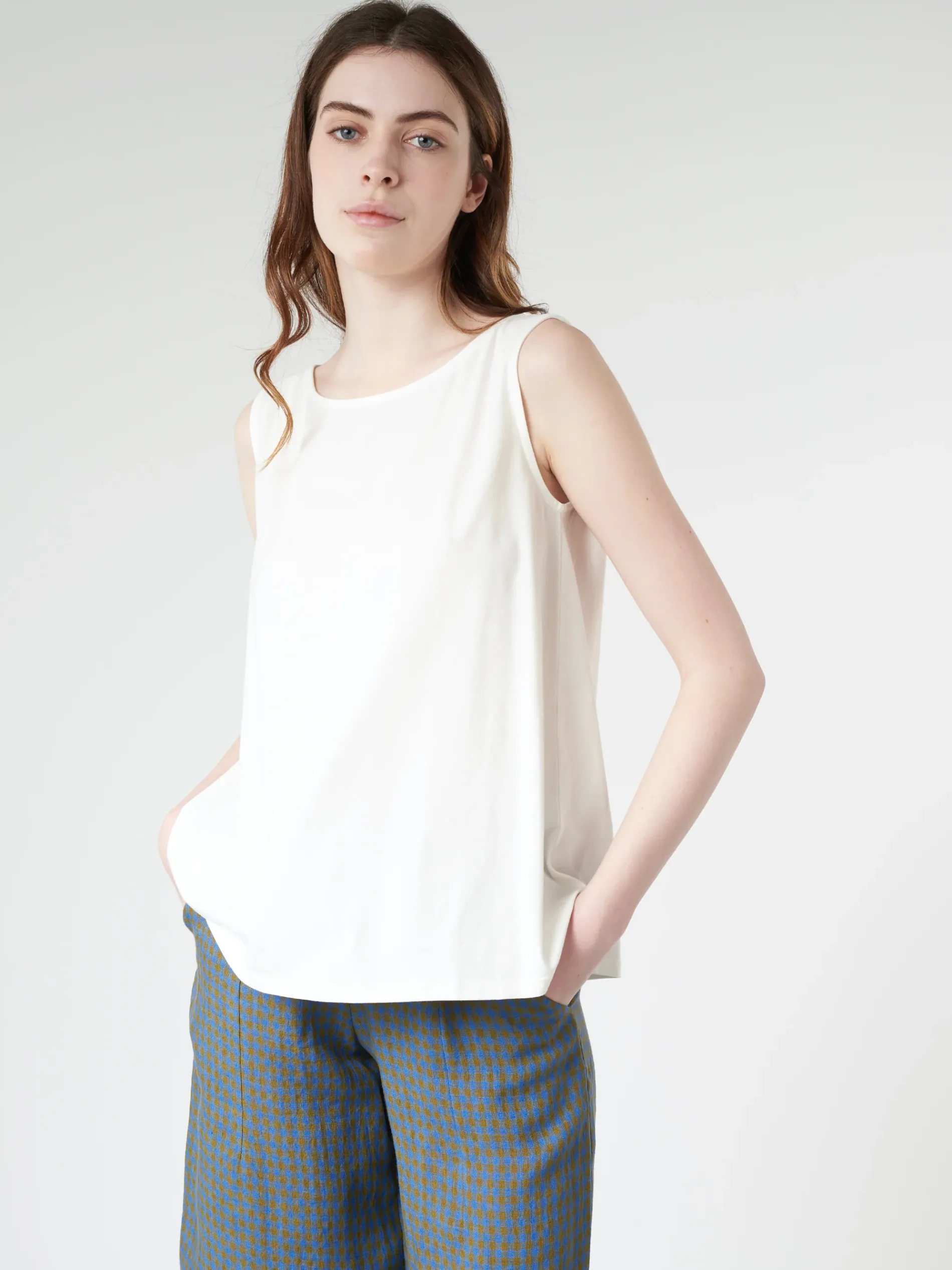 Basic crew-neck tank with wide shoulder and A-shape. Shallow neckline and comfortable fit.