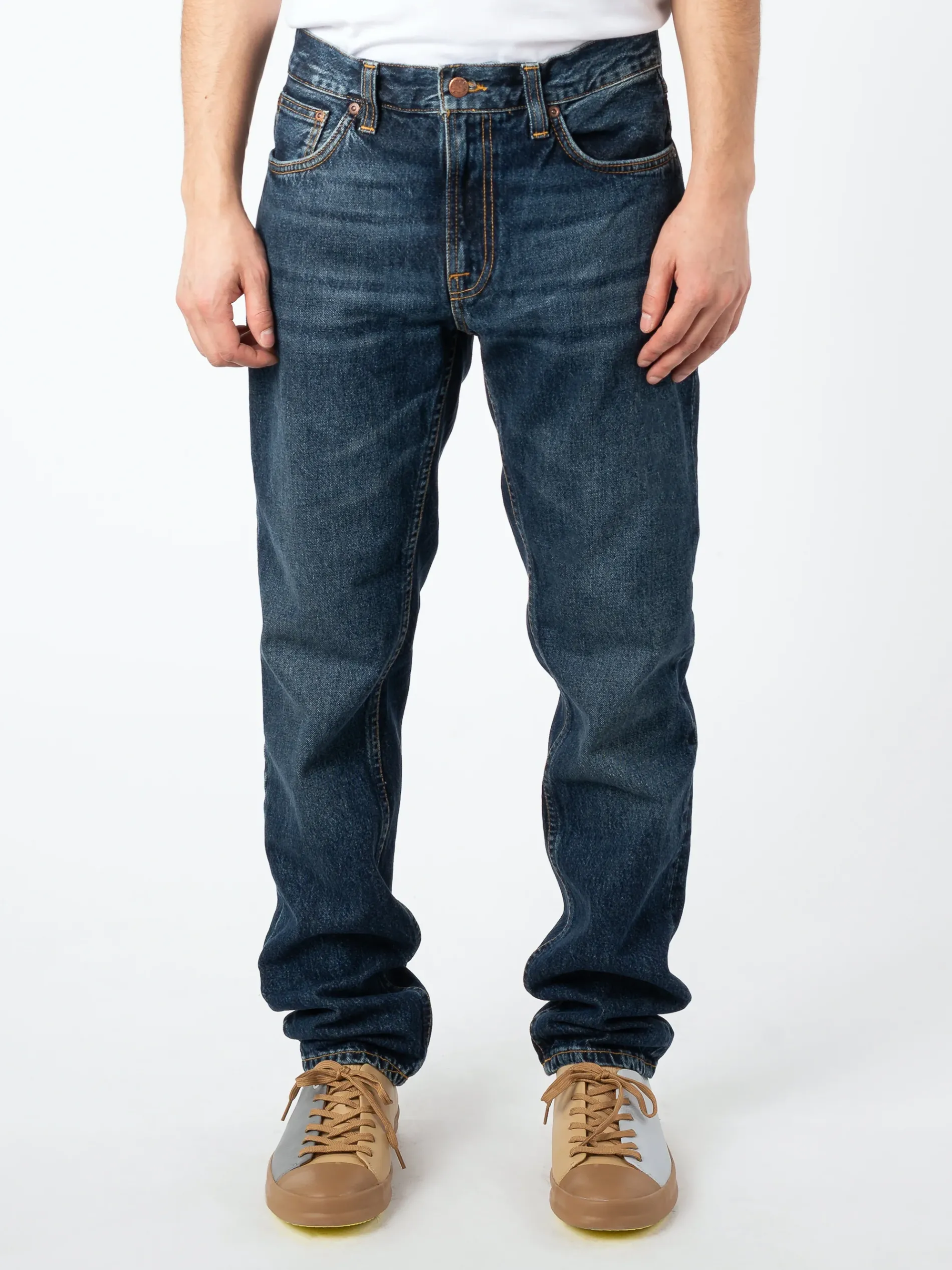 Regular fit jeans with a straight leg made in a dark blue wash with subtle wear. These jeans are made from a rigid 14.9 oz denim. Gritty Jackson has well-balanced legroom that gives the fit a neat silhouette while also offering great comfort.
