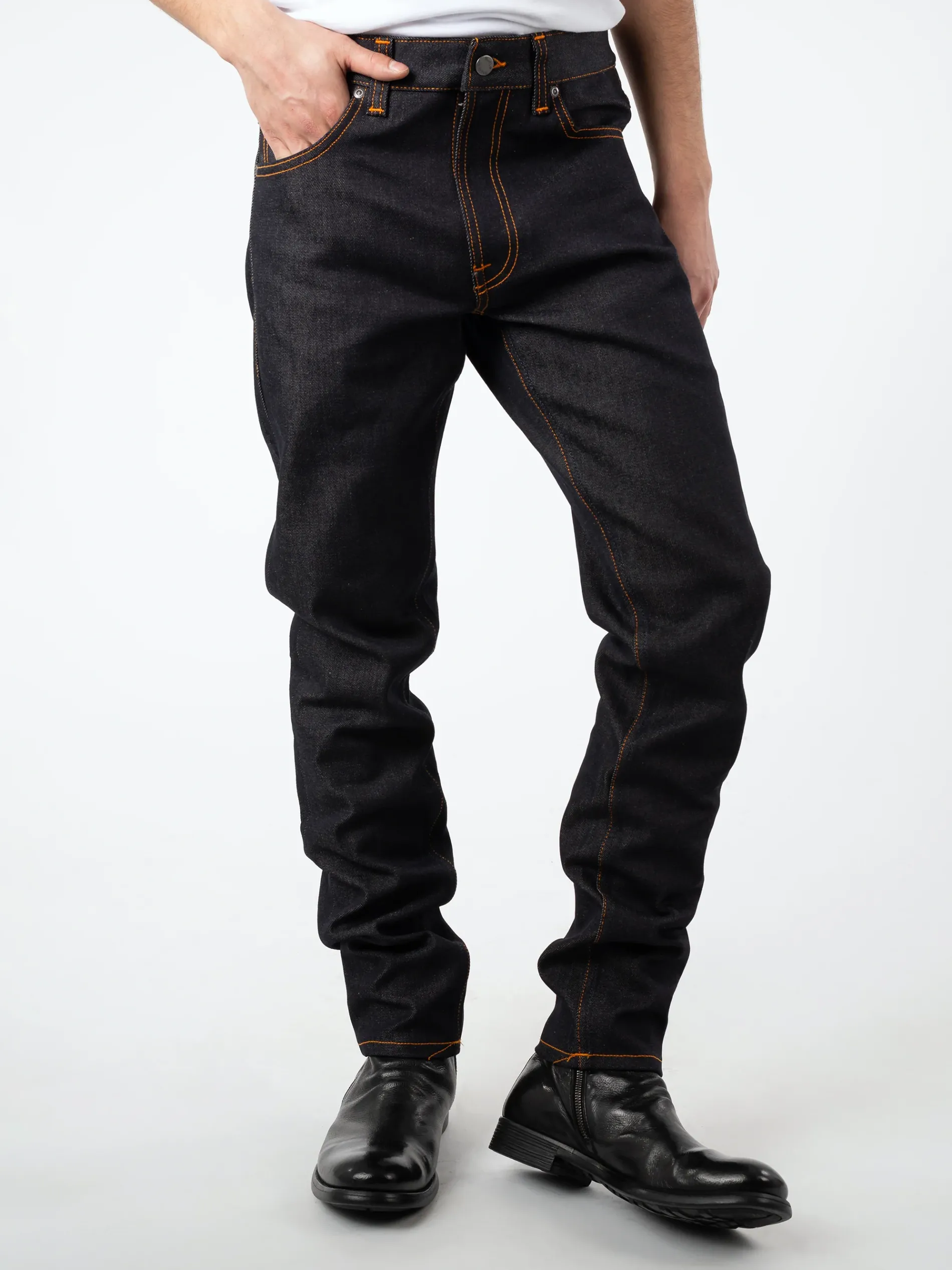 Slim fit jeans with a tapered leg made from 13.5 oz Turkish selvedge denim with a deep indigo tone and lovely texture. Lean Dean fits slim and tapers from the thigh all the way down to a slim ankle opening.