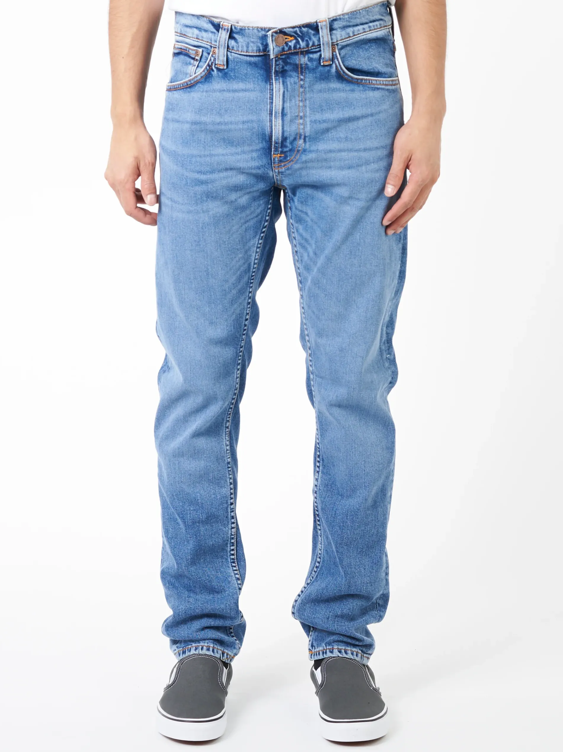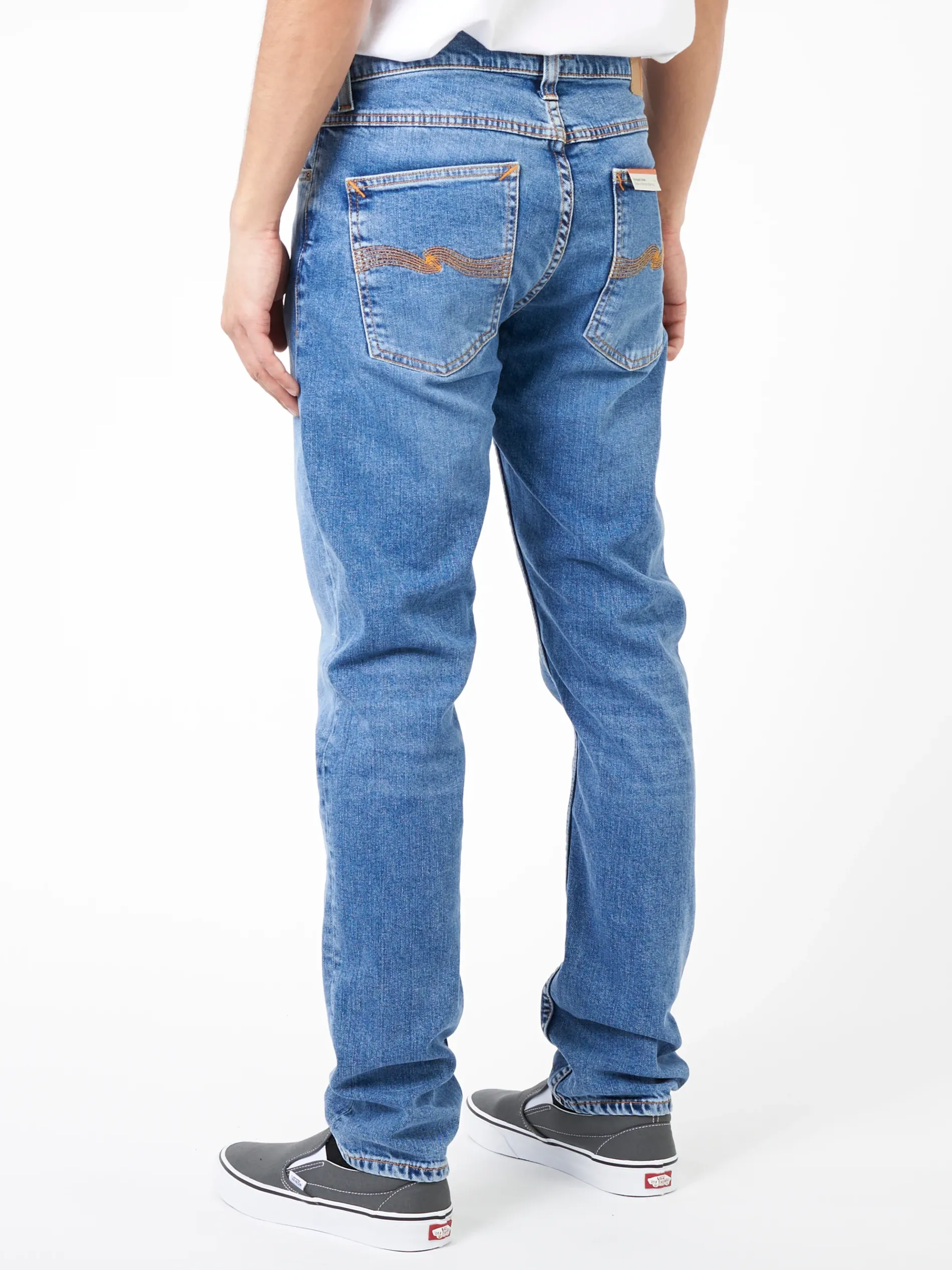 Jeans with a slim tapered fit made in organic comfort stretch denim. It tapers evenly from the hip down to the ankle, an aspect that has made Lean Dean one of Nudie Jeans’ most popular fits. Lean Dean fits slim and tapers from the thigh all the way down to a slim ankle opening.